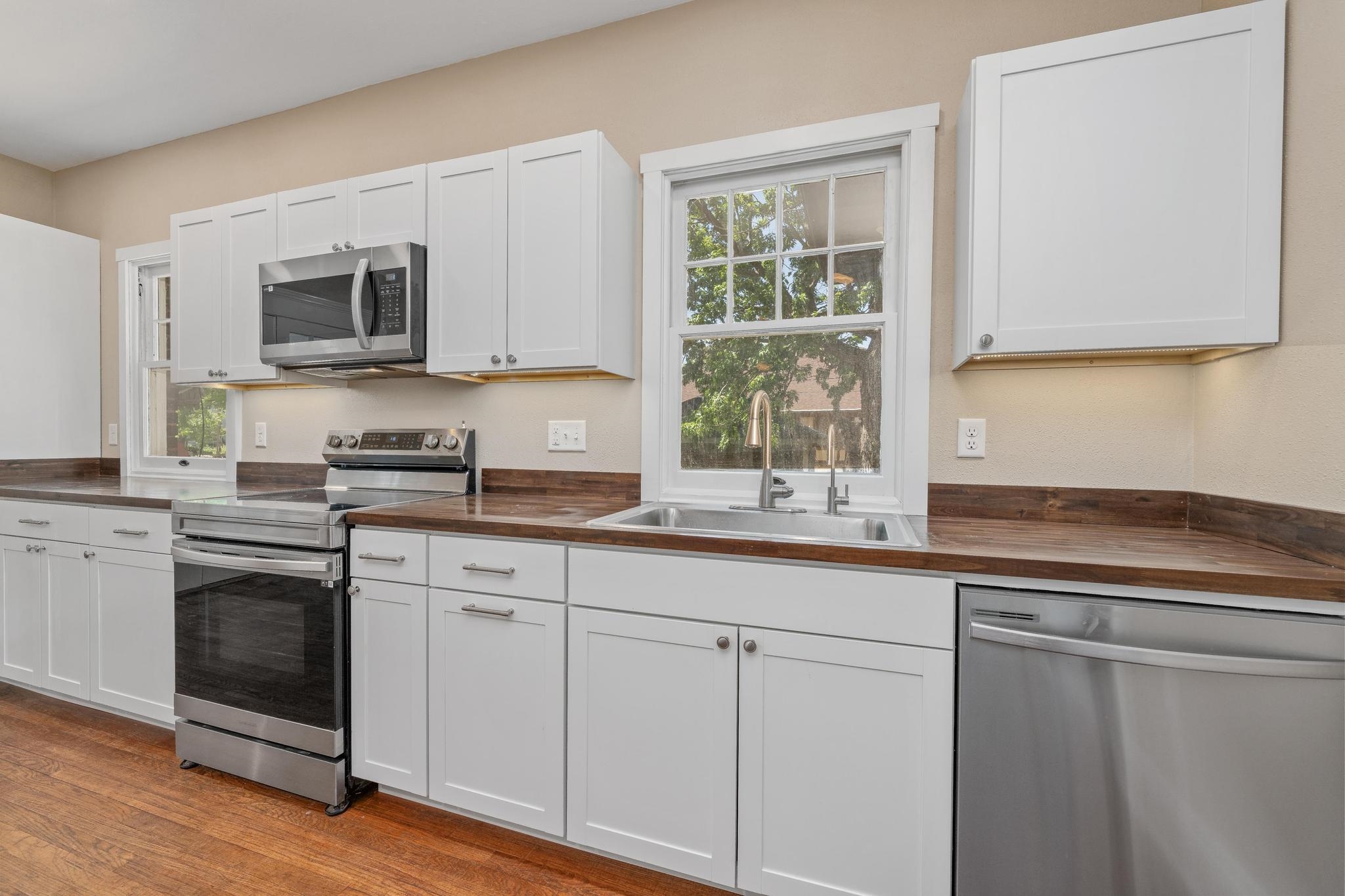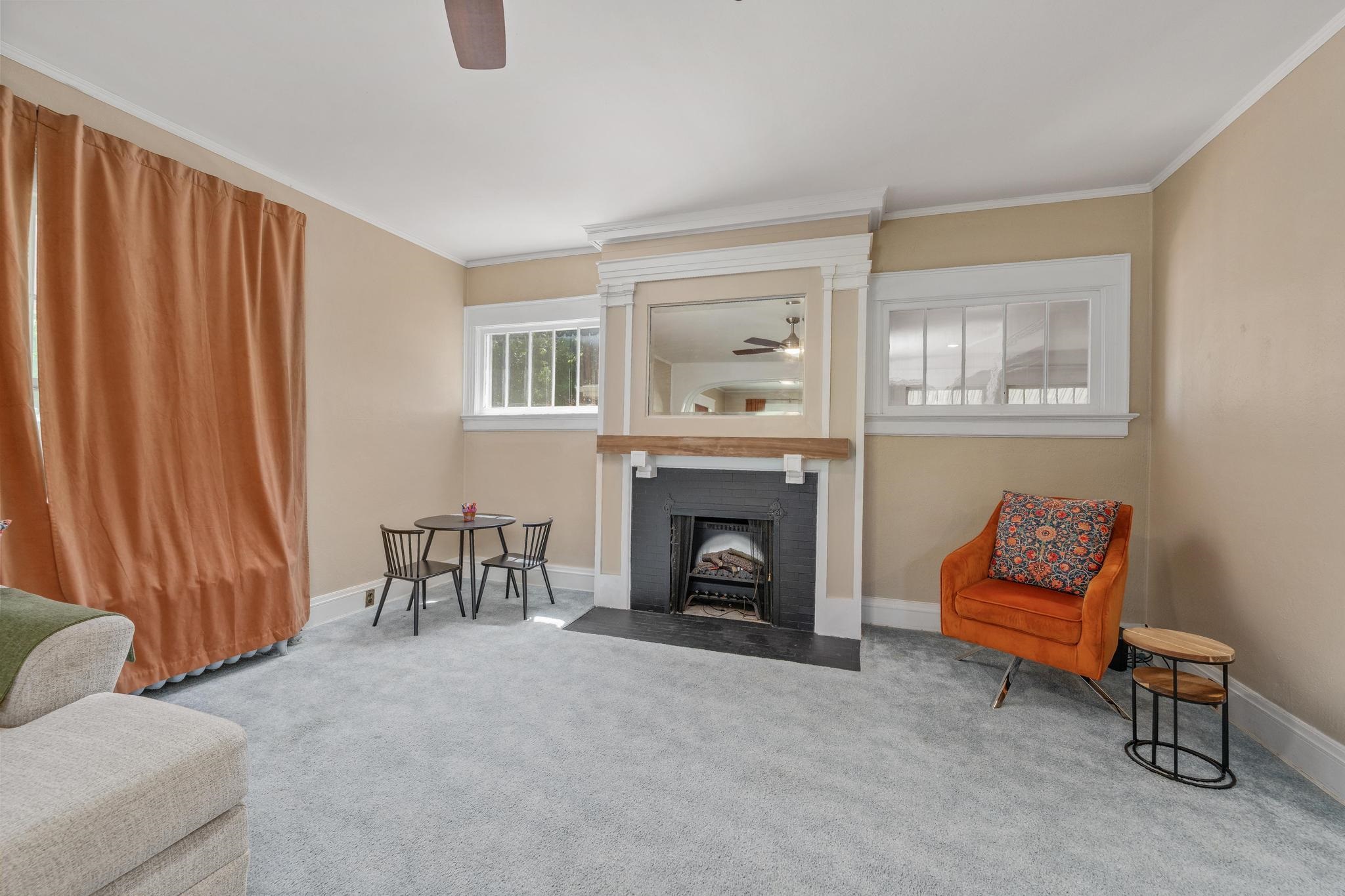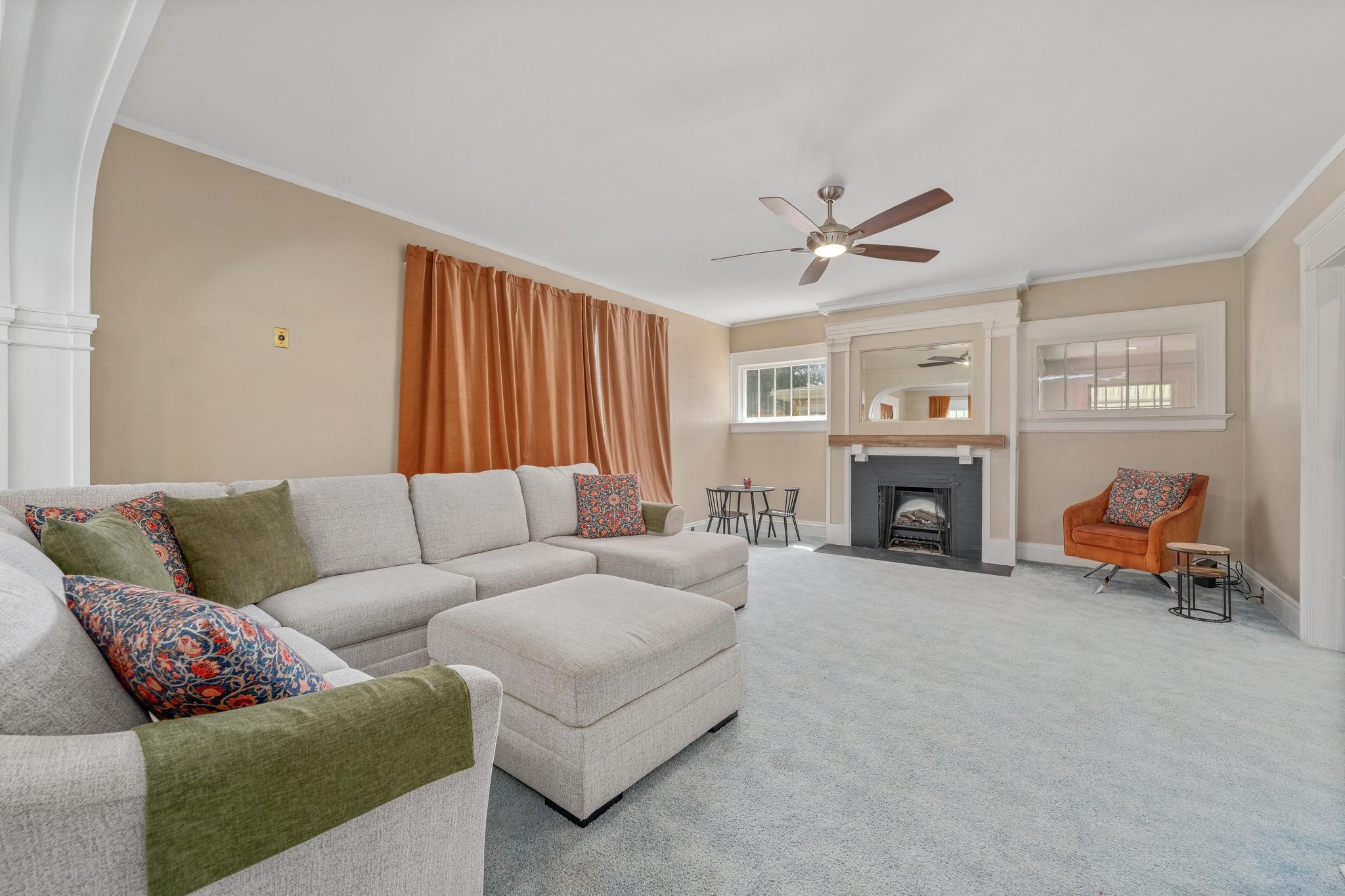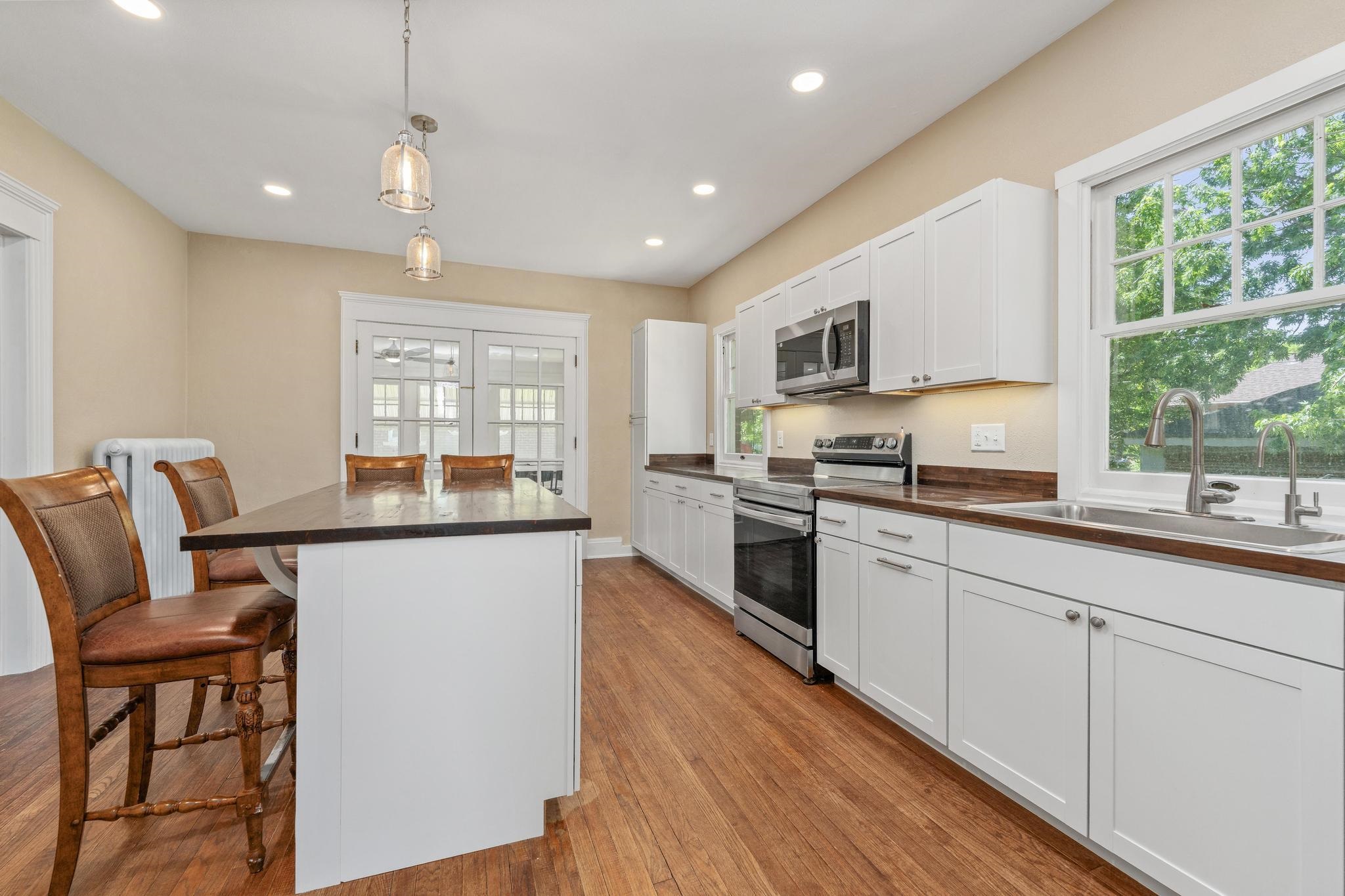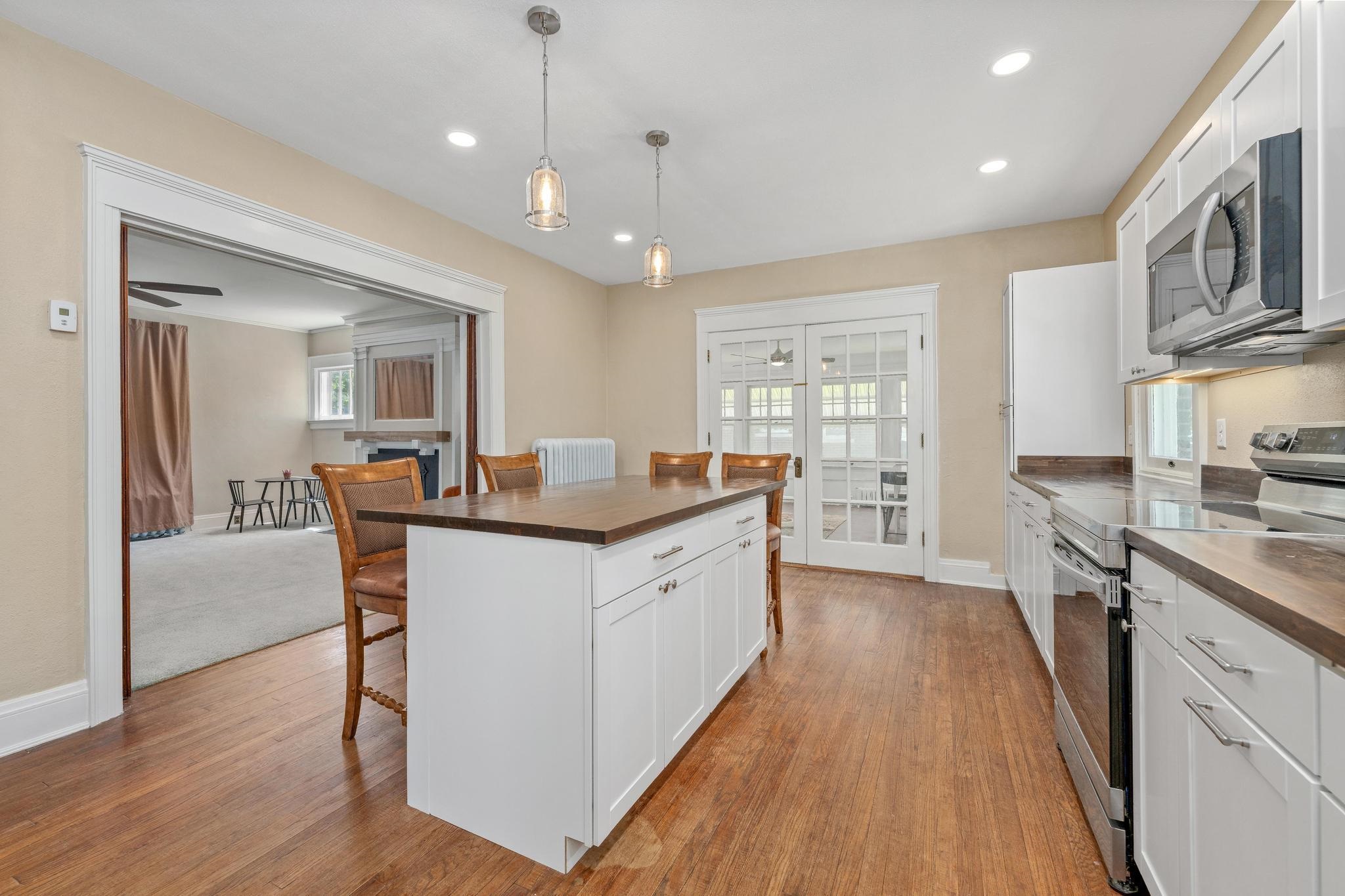 Welcome home where character, space, and thoughtful updates come together to create something truly special. From the moment you arrive, the wraparound front porch with its distinctive Spanish tile invites you to slow down and enjoy everything from morning coffee to evening gatherings in a setting full of charm and curb appeal. Inside, the grand entry welcomes you with an original wood staircase and a one-of-a-kind solid wood front door featuring detailed glasswork. The foyer opens into a spacious living room highlighted by an arched beam and decorative fireplace, creating a warm and inviting place to gather. Pocket doors lead to a beautifully updated kitchen that blends modern convenience with timeless style. A large center island with seating and storage anchors the space, complemented by generous countertops and brand-new stainless-steel appliances that remain with the home. Just beyond, a cozy sunroom offers flexible space for entertaining, relaxing, or quiet moments, with the option to close it off or step directly onto the front porch. The main floor continues to impress with a reimagined layout that includes a functional laundry area with ample cabinetry and workspace, along with a centrally located half bath for guests. Fresh paint throughout much of the home and an abundance of windows create a light and bright atmosphere in every room. Upstairs, the bedrooms provide comfortable living spaces along with a full bathroom and an oversized bonus room filled with natural light, ideal for additional living space, a home office, or recreation area. The well-insulated attic offers even more potential for future expansion, creative use, or storage. The basement includes a family or rec room, additional storage space, and the option for a secondary laundry area. This home is equipped with a boiler heating system known for its efficiency and even heat, a new boiler was installed in 2022. It also includes a whole-house attic fan. A reverse osmosis system and water softener are included, as well as all televisions and mounts for added convenience. Outside, the fenced backyard provides an enclosed space to enjoy, with a path leading to an oversized two-car detached garage. Situated on a corner lot across from Roosevelt Elementary and near the heart of town, this property offers both location and lifestyle. With its blend of original character, modern updates, and flexible living spaces, this is a home where you can settle in and truly make it your own.