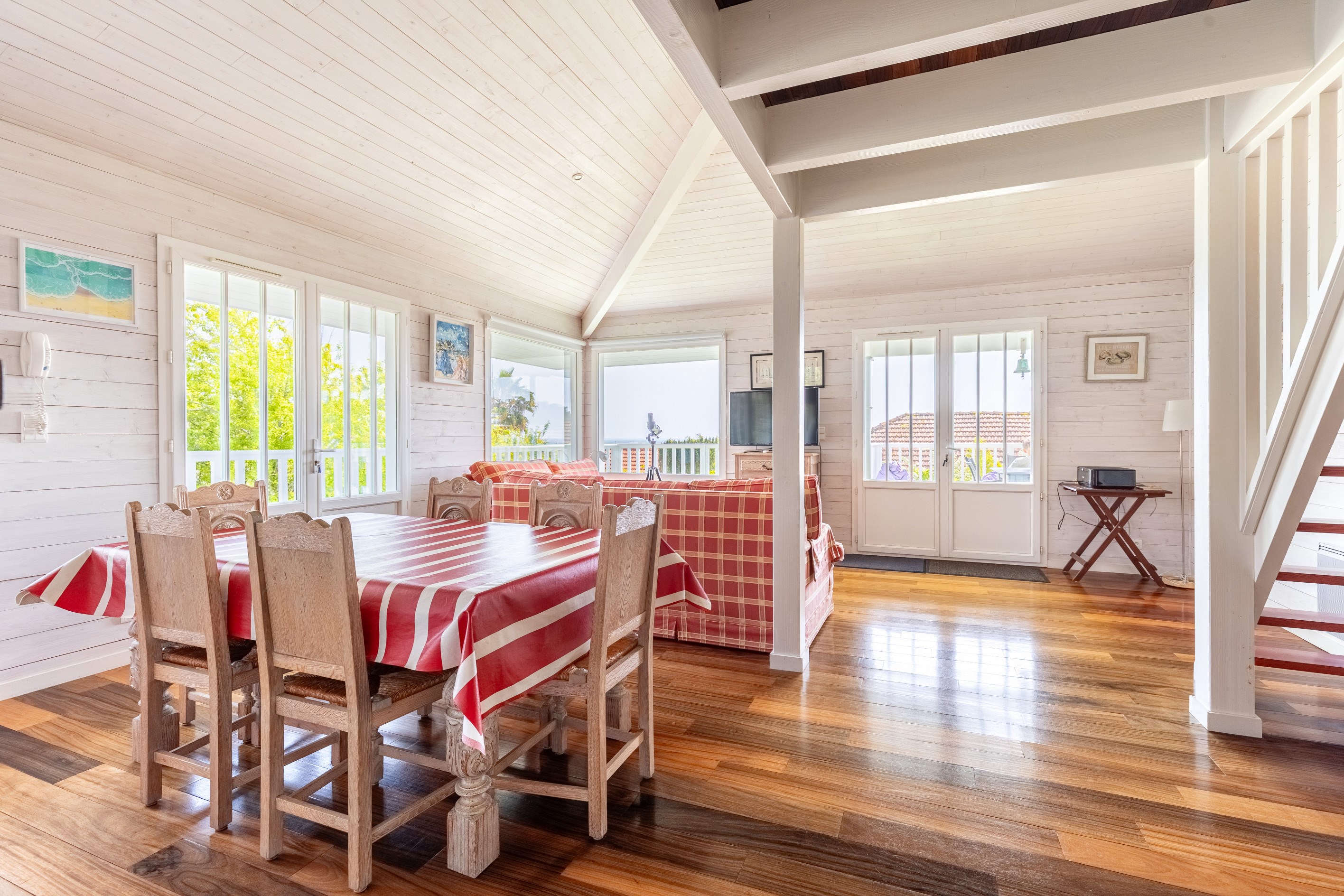 CAP FERRET PENINSULA - WOODEN VILLA WITH VIEWS OF THE BASSIN Exclusively, in the heart of the Cap Ferret peninsula, in the immediate vicinity of the Arcachon Basin and with direct access to Piraillan harbour, lies this timber-framed villa built in 2003. Offering approximately 150 m² of living space, complemented by a garage of around 30 m², it is situated in a sought-after and well-preserved setting. The property stands out for its unusual layout, comprising two separate dwellings spread over two floors. The ground floor features a first dwelling of approximately 60 m², comprising a living area opening onto a terrace and garden, a kitchen with a utility room, two bedrooms and a shower room. Upstairs, the main house, measuring approximately 90 m², opens onto a terrace of around 40 m² offering unobstructed views of the Arcachon Basin. It comprises a bright living-dining room, an open-plan kitchen, two bedrooms, a shower room and a mezzanine converted into an additional sleeping area. The spaces are well laid out, allowing for a seamless flow between indoors and outdoors. The enclosed, tree-lined garden features two terraces with complementary exposures, an outdoor storeroom and a garage. Two gates at the rear of the plot provide direct access to Piraillan harbour, a particularly rare feature in this area. This property offers an attractive layout, suitable for a family home, a second home or a rental venture on the peninsula. - We love: the layout comprising two separate dwellings, direct access to Piraillan harbour, the unobstructed view of the bay from the upstairs terrace, the flexible layout, and the sought-after location in the heart of Piraillan. Contact: Cap Ferret Pyla Sotheby's International Realty +33 556 606 832 Inspiring prestige real estate, experts in luxury property, Bassin d'Arcachon, from Cap Ferret to Pyla sur Mer. contact@capferretpylasothebysrealty.com