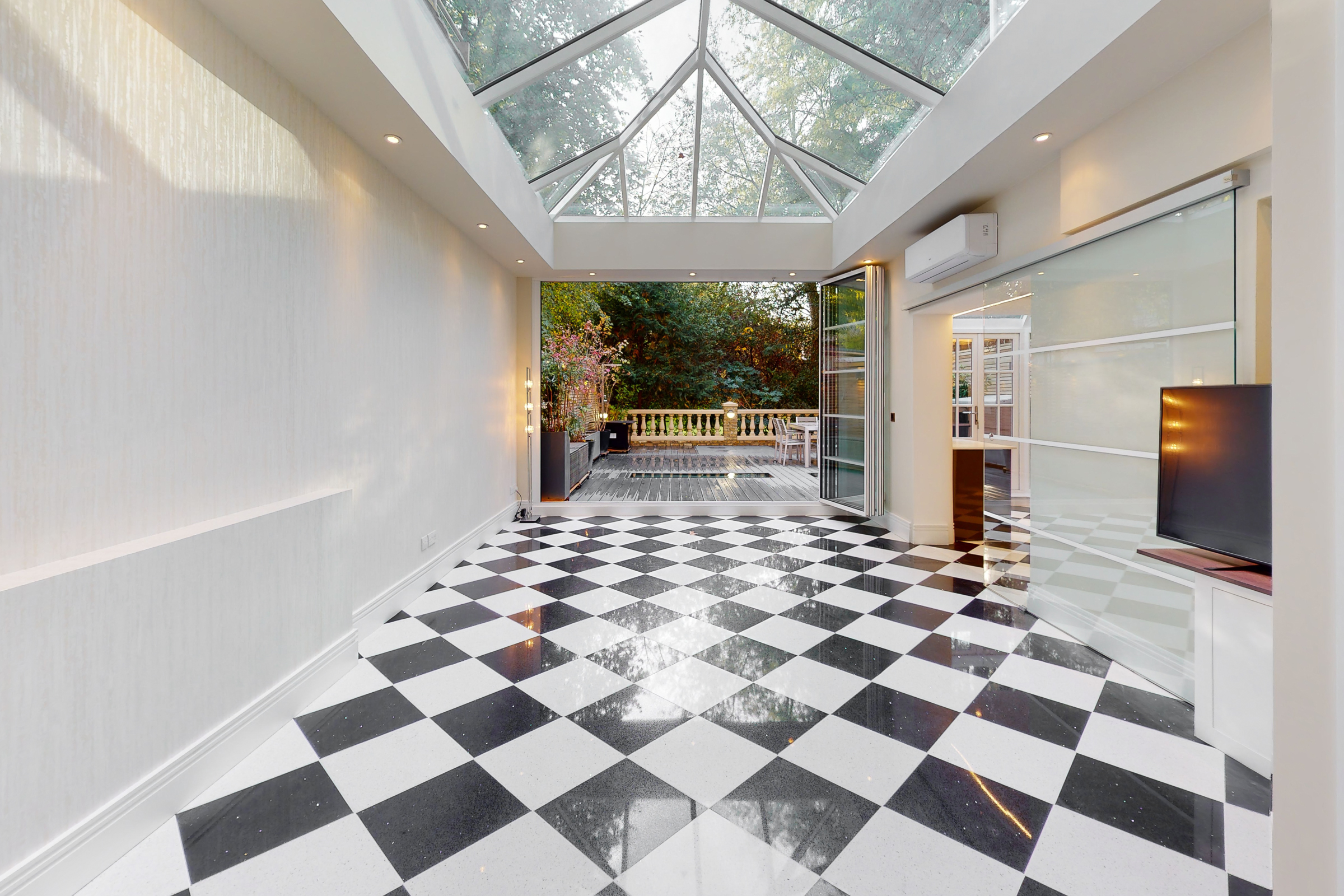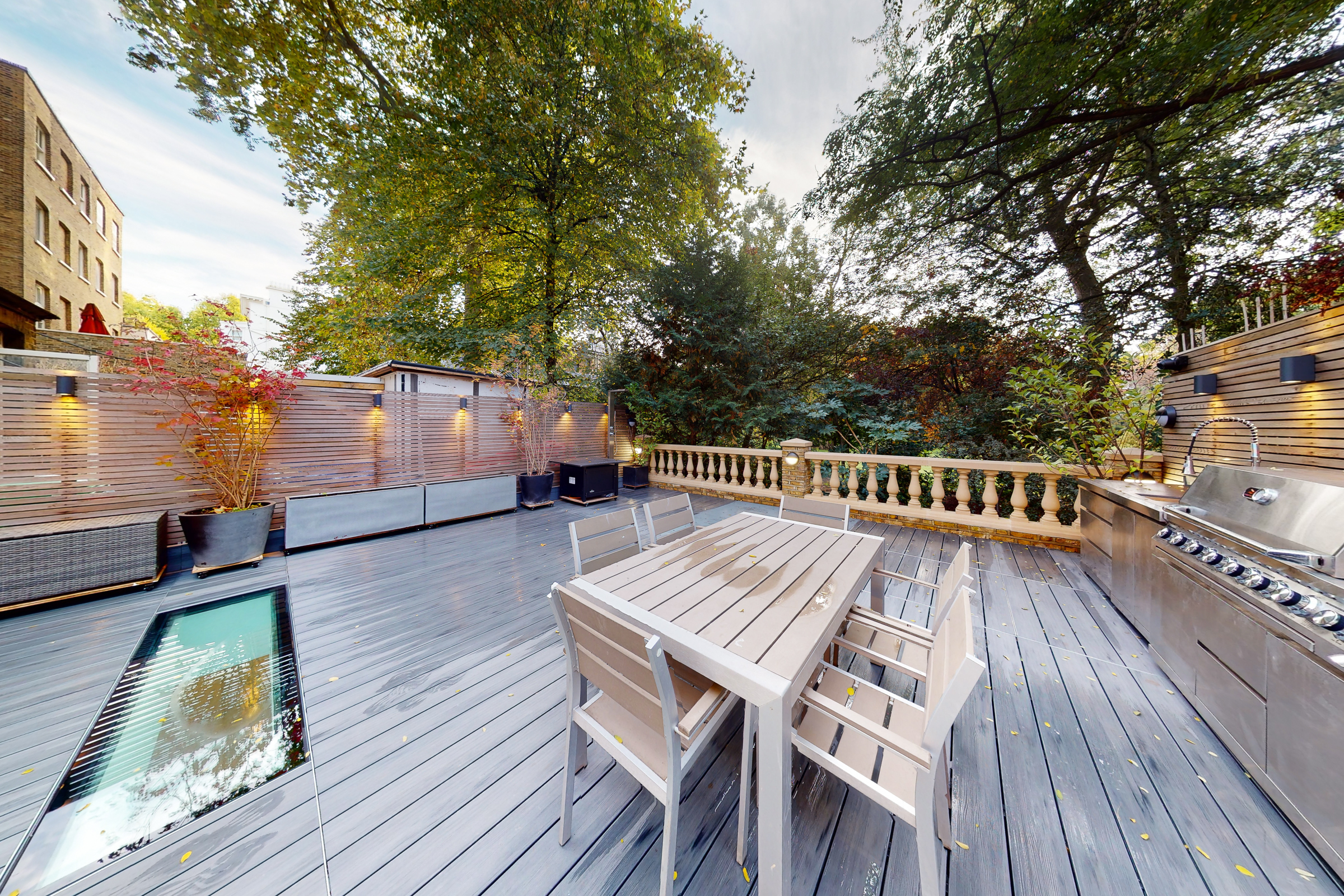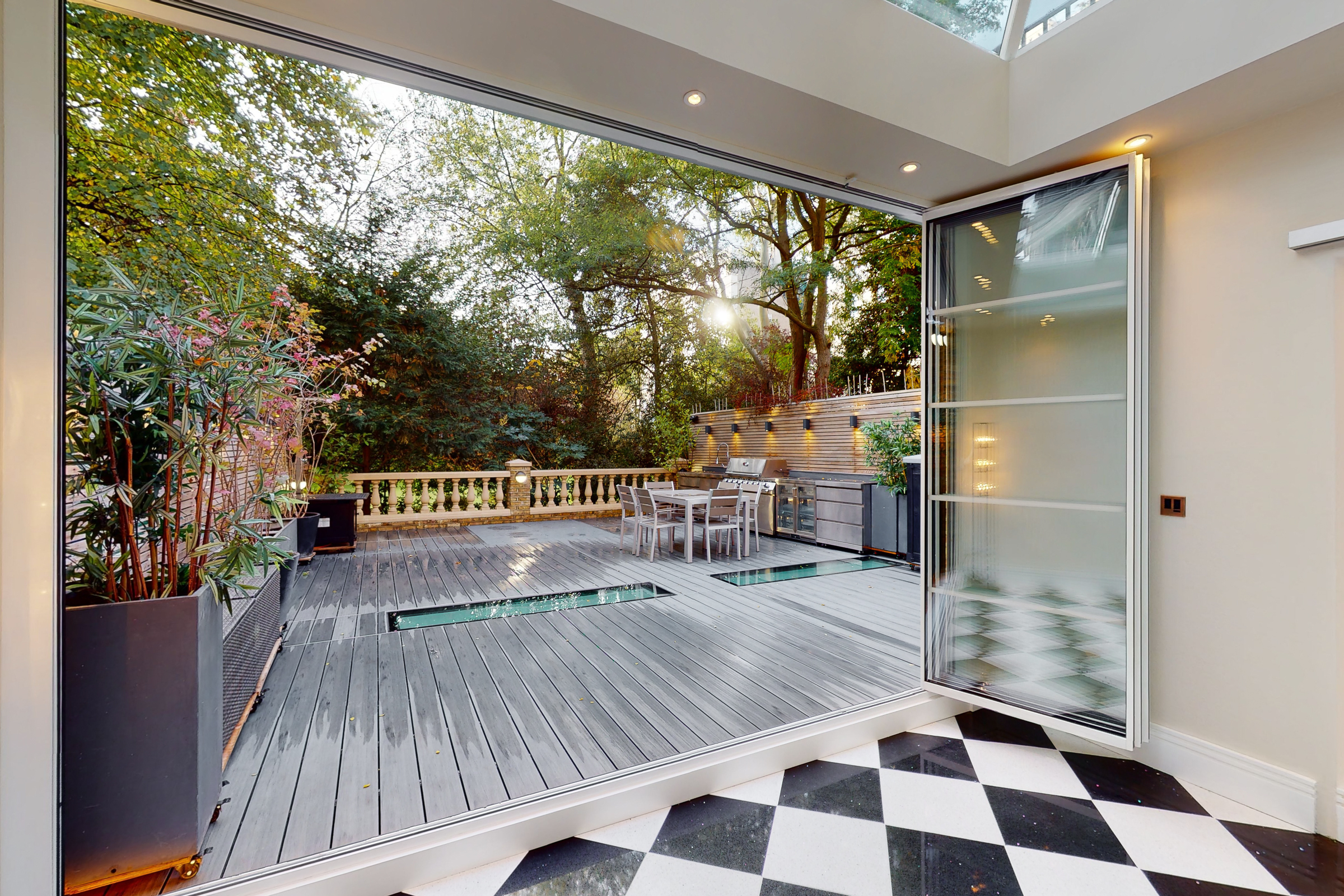 What sets this apartment apart is its relationship with the outside space. The kitchen and dining areas open directly onto a broad, decked garden terrace, arranged for outdoor dining and entertaining, with a secondary terrace above. Light is drawn down through lightwells and a glazed roof section, giving the lower levels a surprising sense of openness.