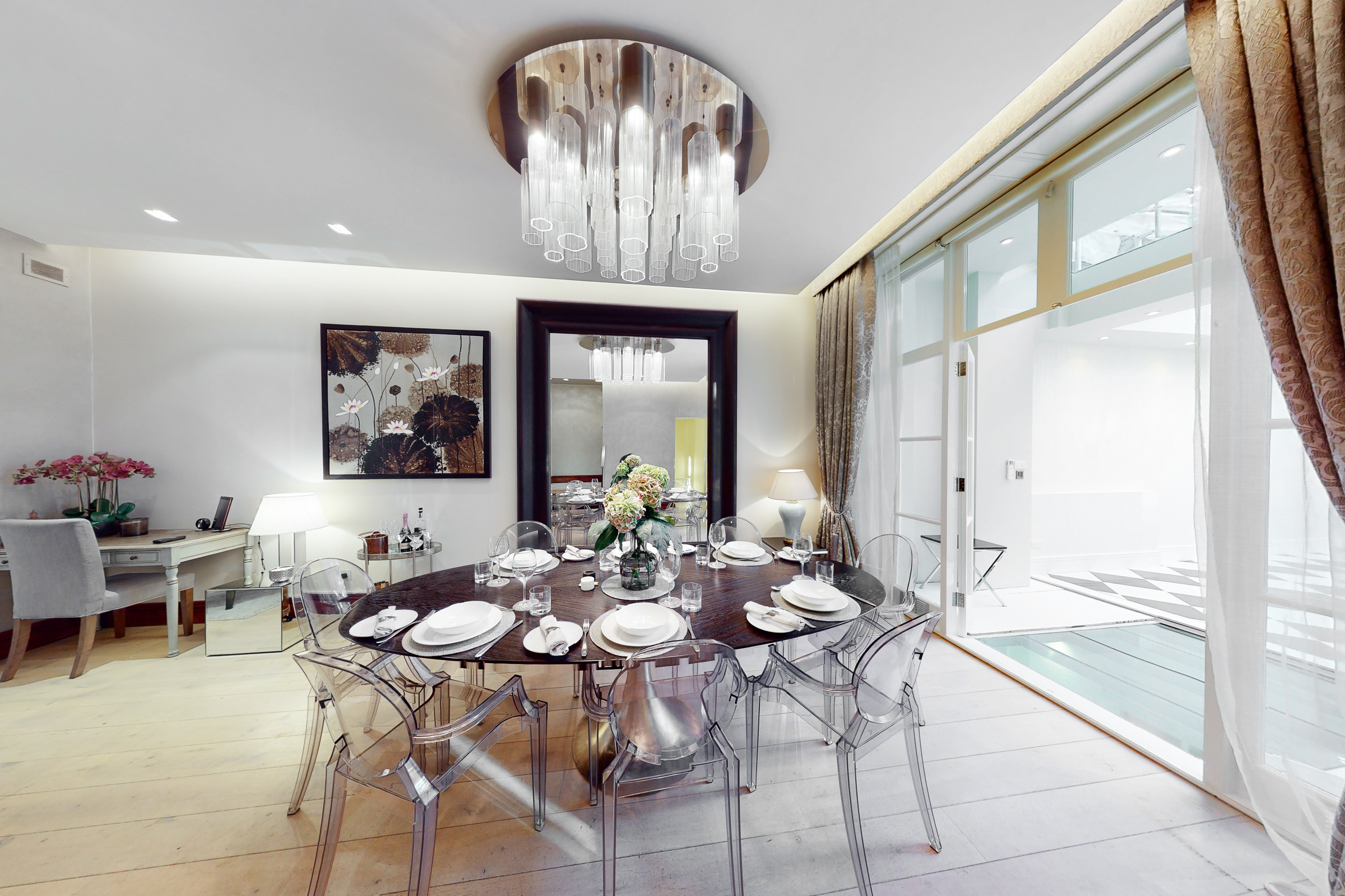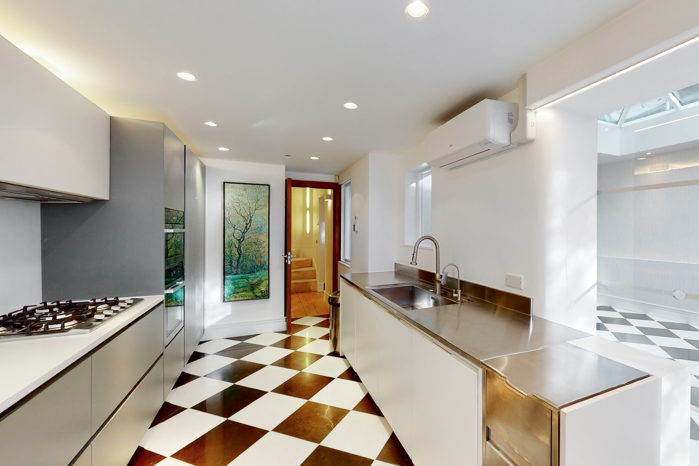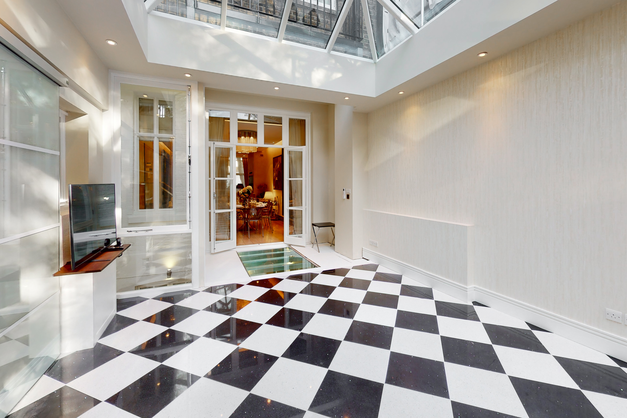 What sets this apartment apart is its relationship with the outside space. The kitchen and dining areas open directly onto a broad, decked garden terrace, arranged for outdoor dining and entertaining, with a secondary terrace above. Light is drawn down through lightwells and a glazed roof section, giving the lower levels a surprising sense of openness.