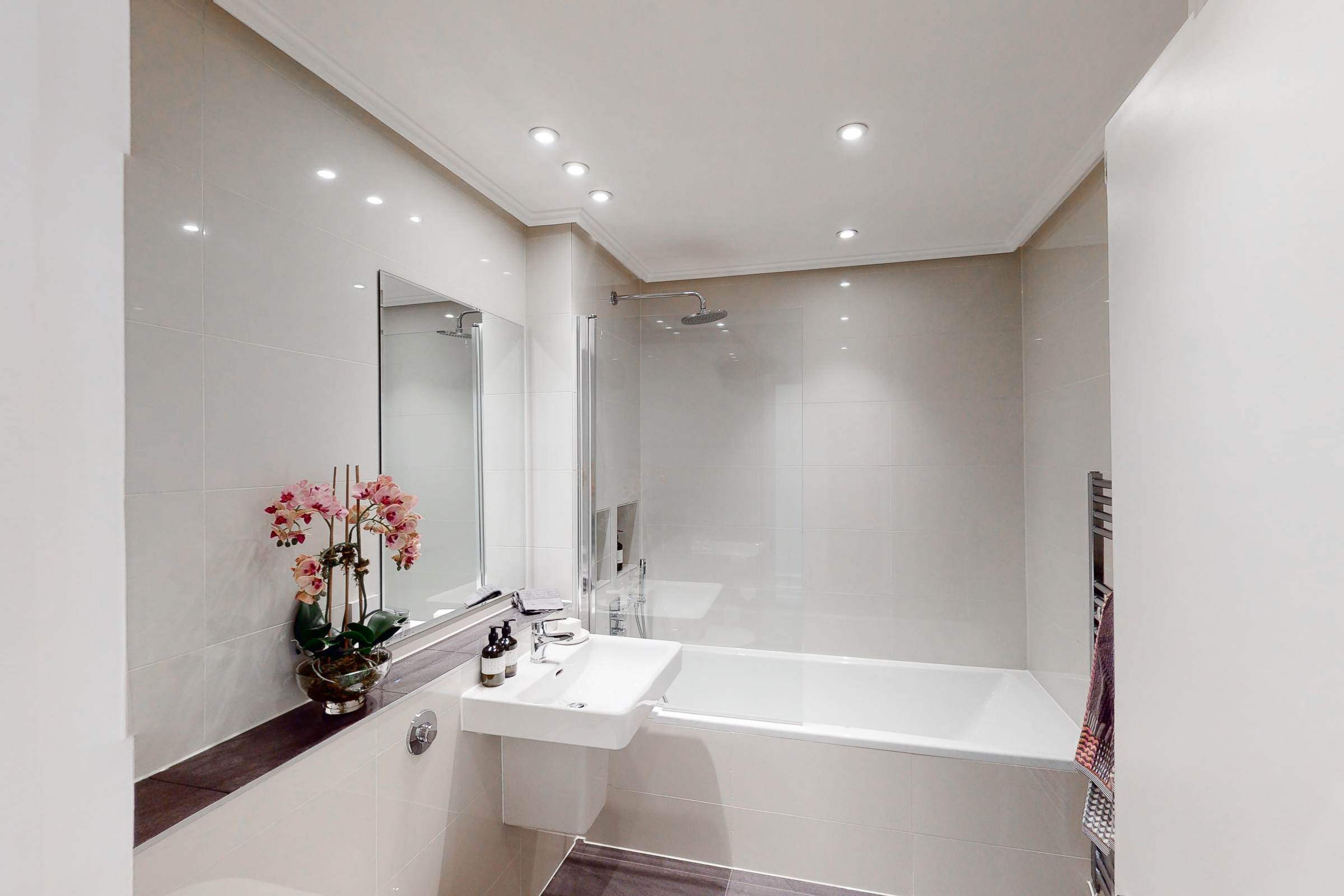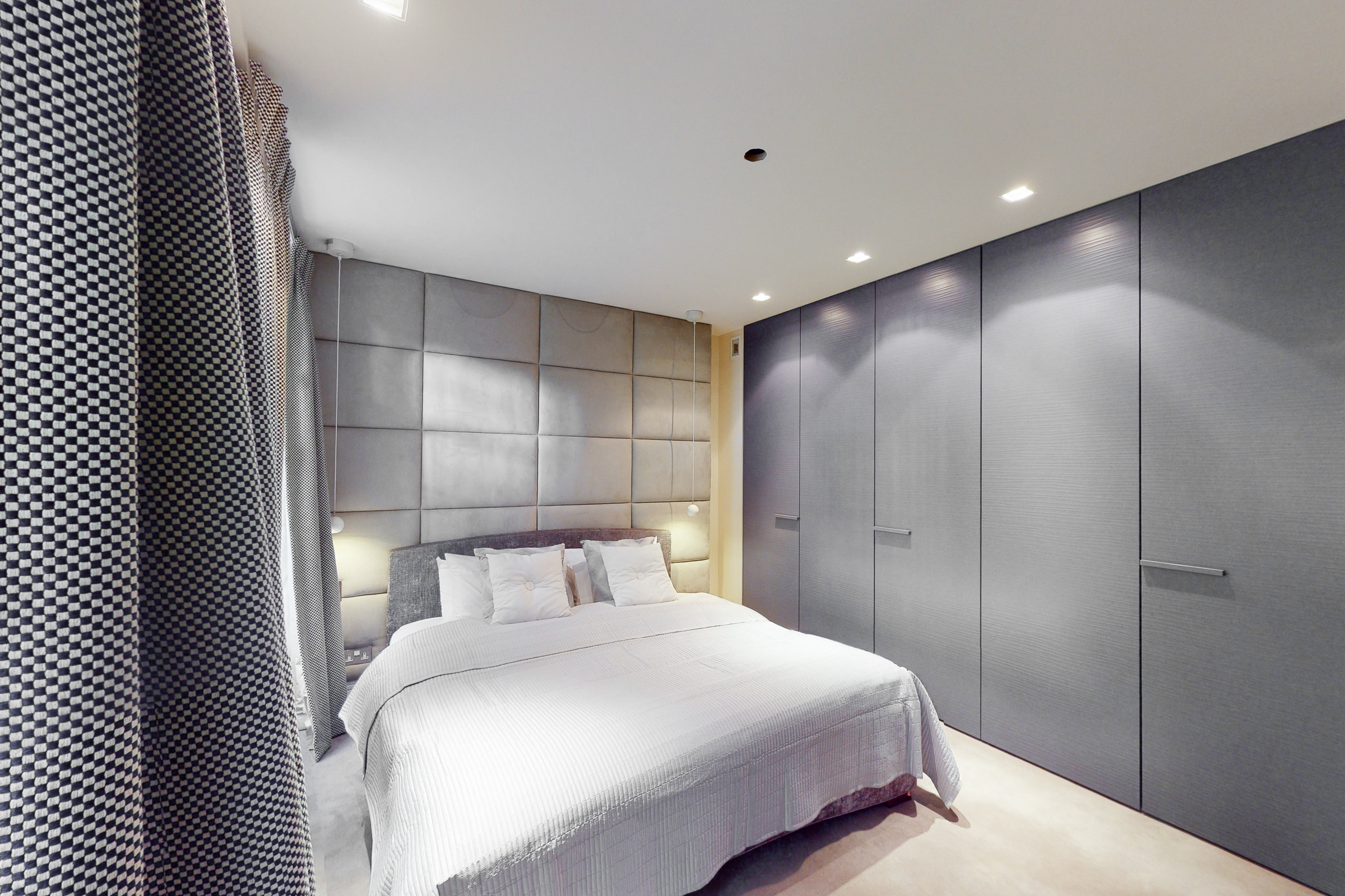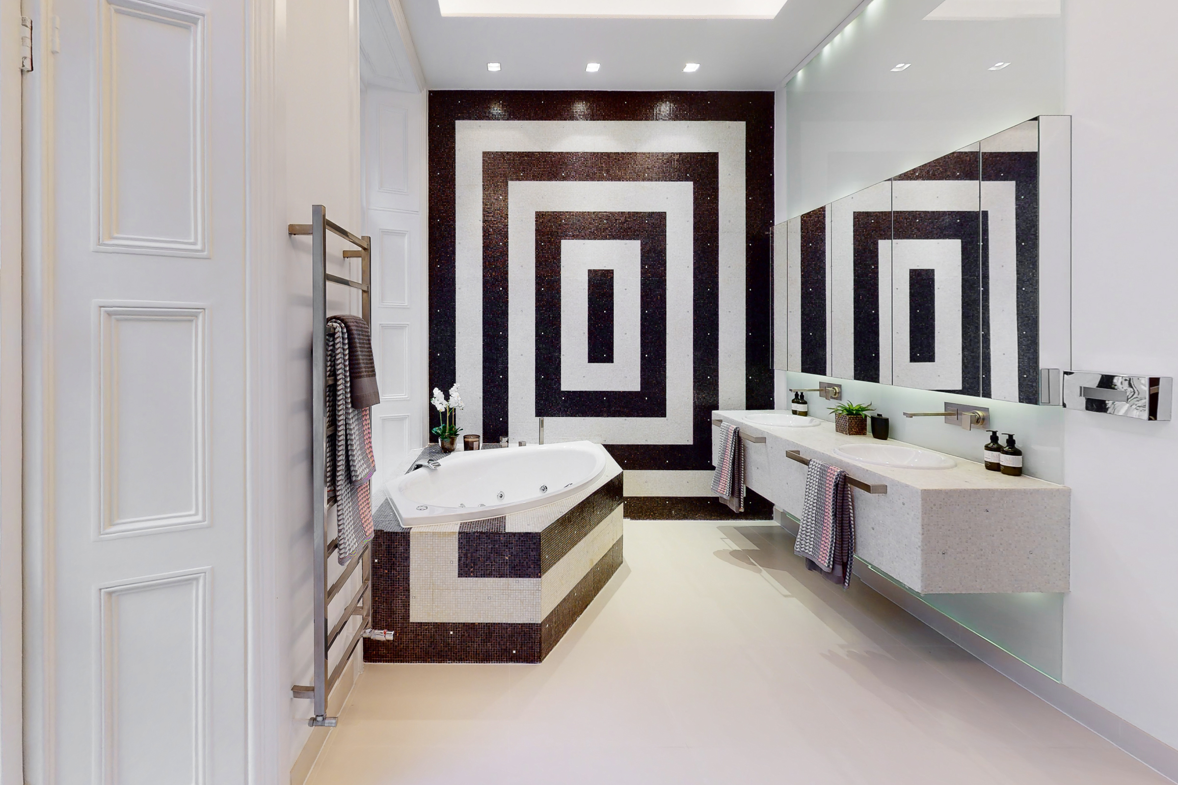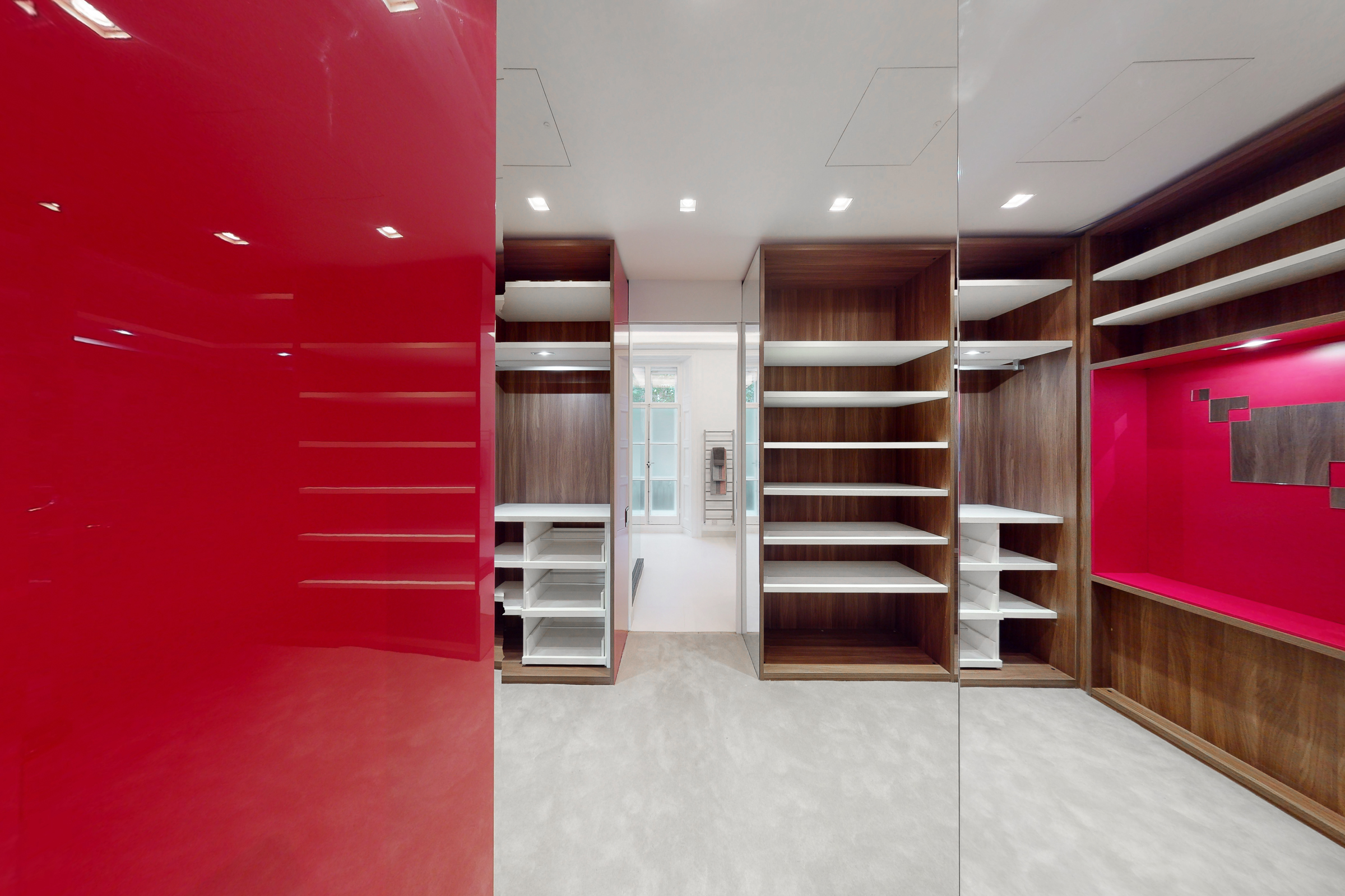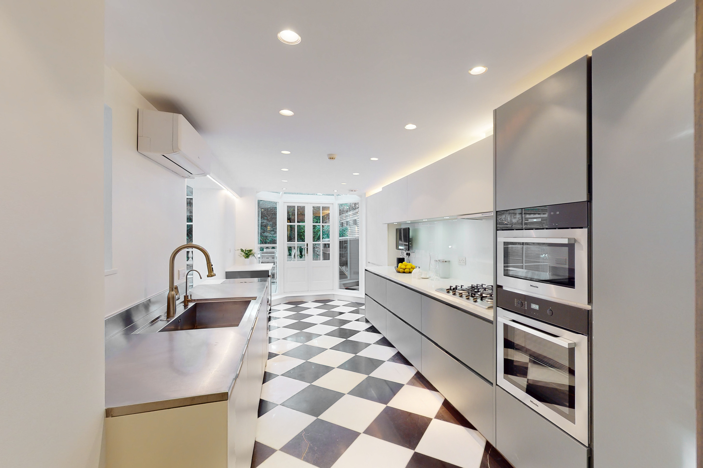 Throughout, the specification is consistent and considered. Kitchens are fitted with Miele appliances and streamlined cabinetry, while bathrooms feature fittings by Dornbracht and Antonio Lupi. Bespoke joinery by Gyform sits alongside integrated lighting by Lutron and a fully distributed audiovisual system, allowing each apartment to operate independently or as part of a wider whole.
