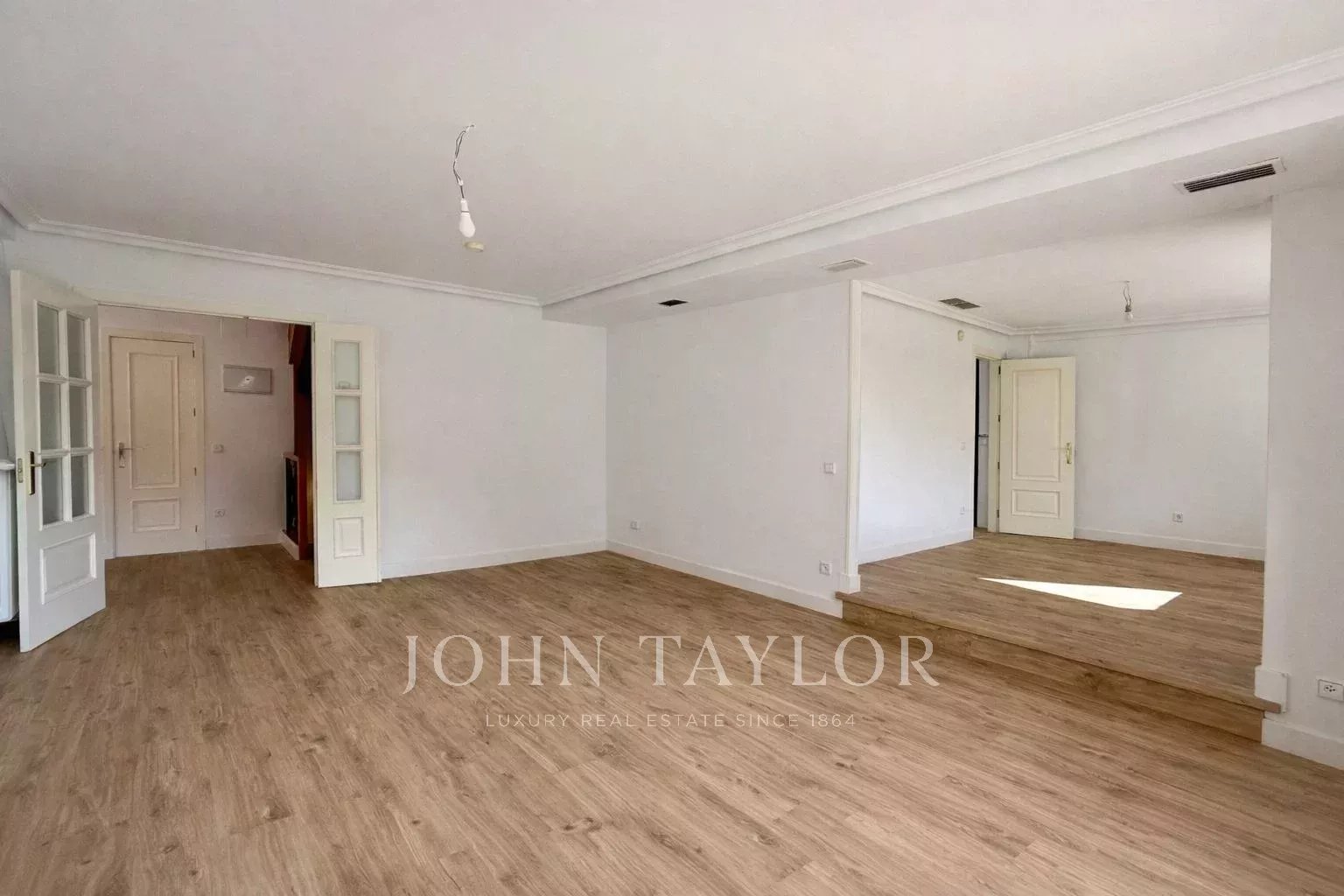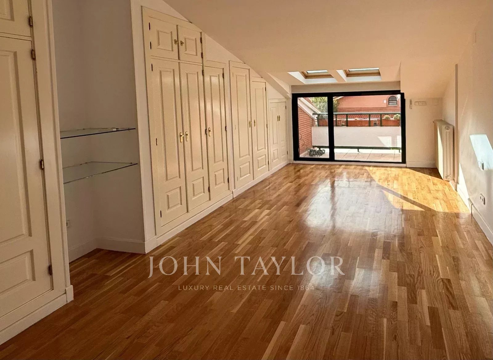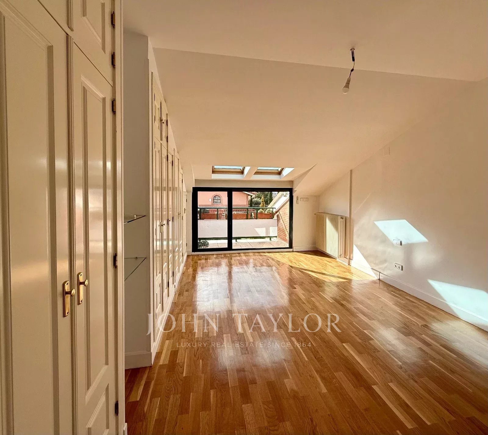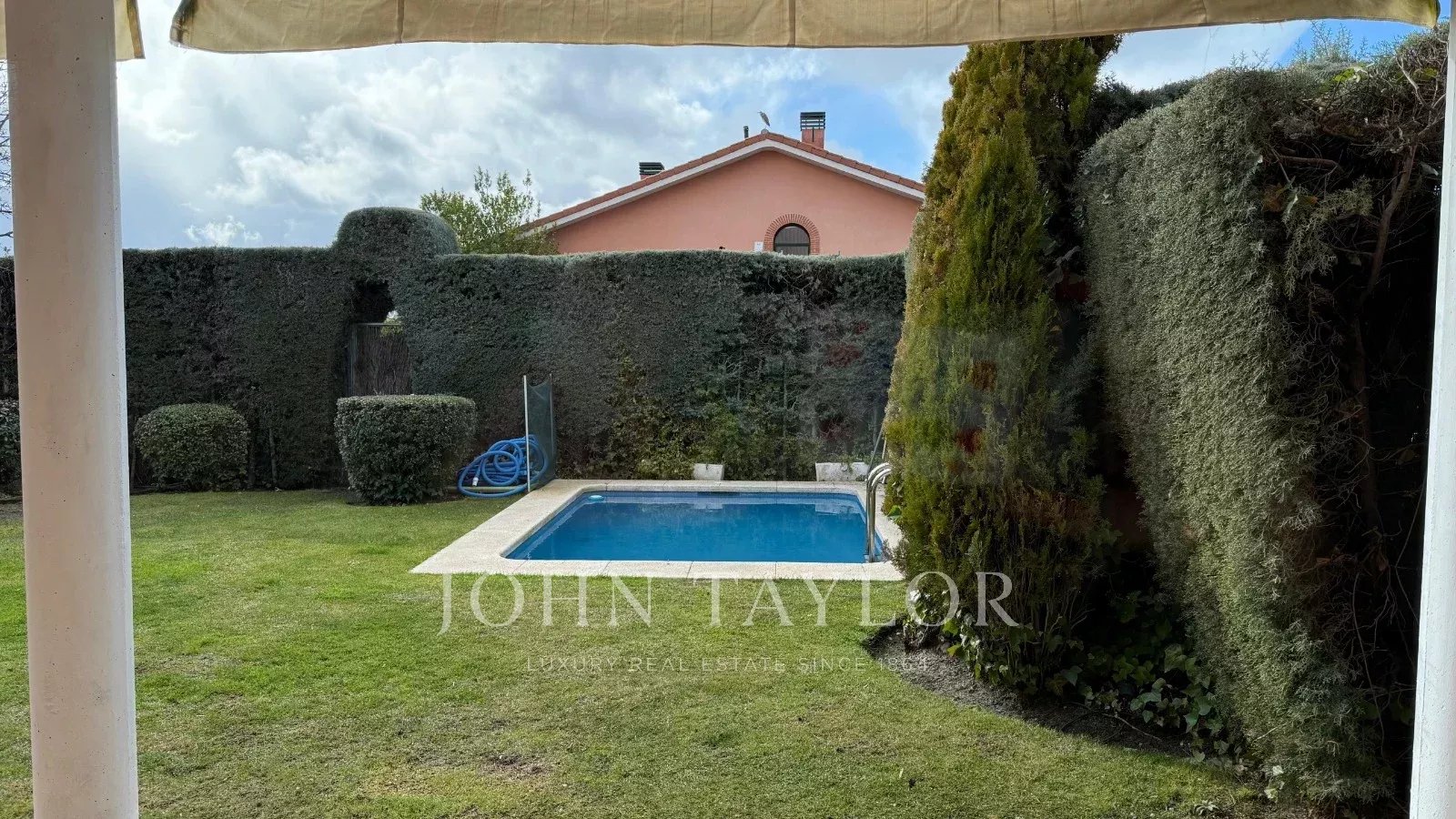 John Taylor presents this magnificent villa located in a first class residential environment. This elegant townhouse represents an exceptional opportunity for those seeking quality of life, privacy and security in one of the most sought after areas of northern Madrid. The property is in impeccable condition, with a careful conservation and a south orientation that guarantees natural light throughout the day.The exterior is one of its great attractions: A perfectly integrated private garden with separate pool, ideal to enjoy with family or friends. From this area there is direct access to the communal areas of the urbanization, which offer a communal swimming pool, paddle tennis courts and 24 hour security, within a quiet and exclusive atmosphere.Inside, the spaces stand out for their spaciousness and functionality. The main area of the house has a large living-dining room with fireplace, very bright and with direct access to the porch and garden, creating a natural continuity between indoors and outdoors. The kitchen, spacious and practical, has an office area and is equipped with high-end appliances, in addition to a separate glazed area for laundry and ironing. A guest toilet completes this floor.The upper floor is dedicated to relaxation and offers three bedrooms and two bathrooms. The master bedroom, with en suite bathroom, enjoys excellent luminosity and access to a pleasant private terrace. One of the secondary bedrooms, particularly spacious, allows multiple configurations, either as a double bedroom, office or study area.The house is completed with a versatile lower floor that significantly expands the possibilities of use: a large multipurpose room ideal as a home theater, games room or office, plus cellar, pantry and a service bedroom with bathroom. The closed garage for two vehicles, with direct access to the house, brings comfort and functionality to the whole.Among its features are natural gas heating, air conditioning throughout the house, garden with private pool and belonging to a consolidated urbanization with complete common areas and maximum security.A property designed for families who want to settle in without the need for renovations, enjoy a safe and residential environment, and live just minutes from La Moraleja, with excellent communications and services. A home that combines elegance, comfort and an unbeatable location.