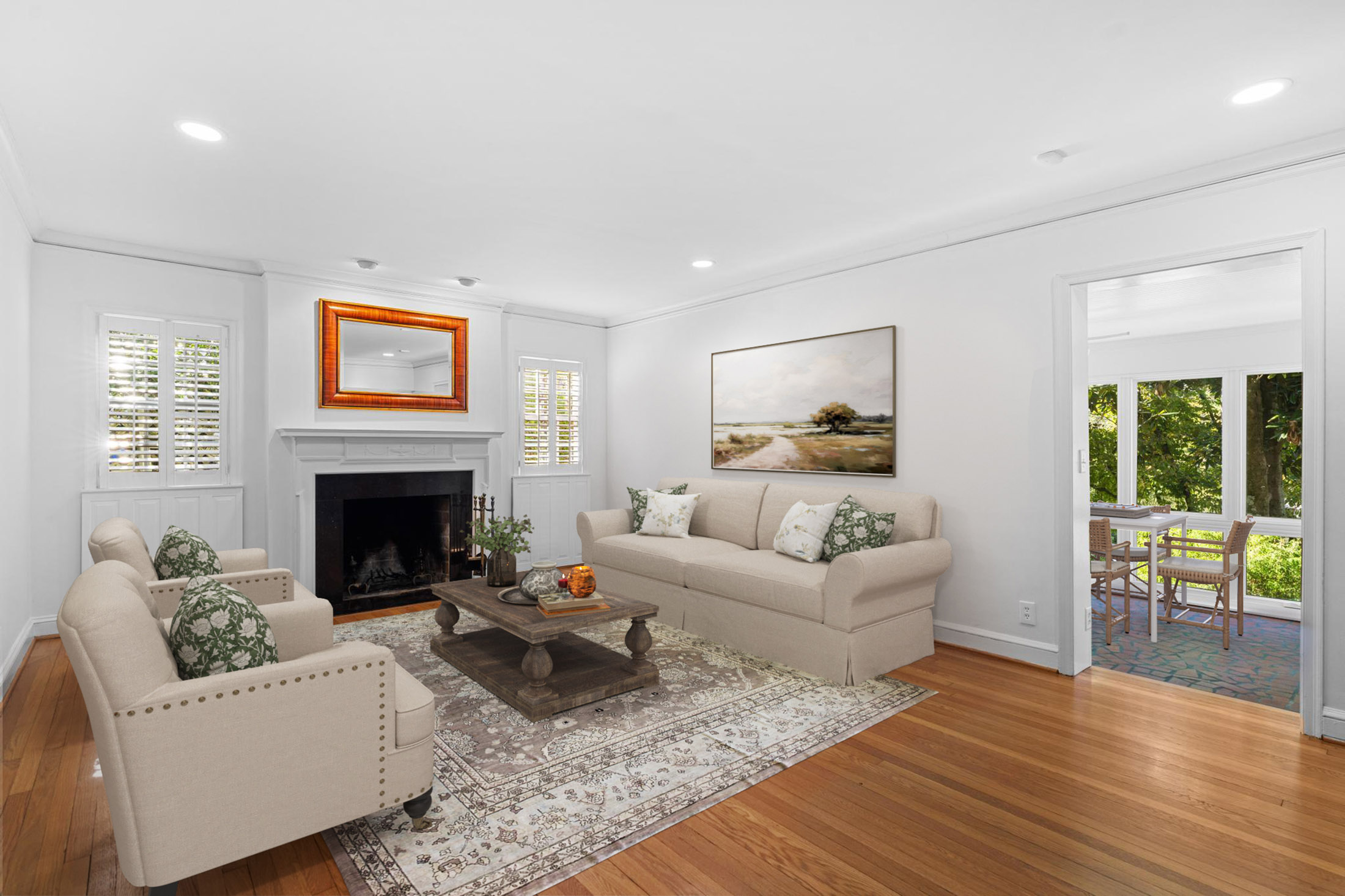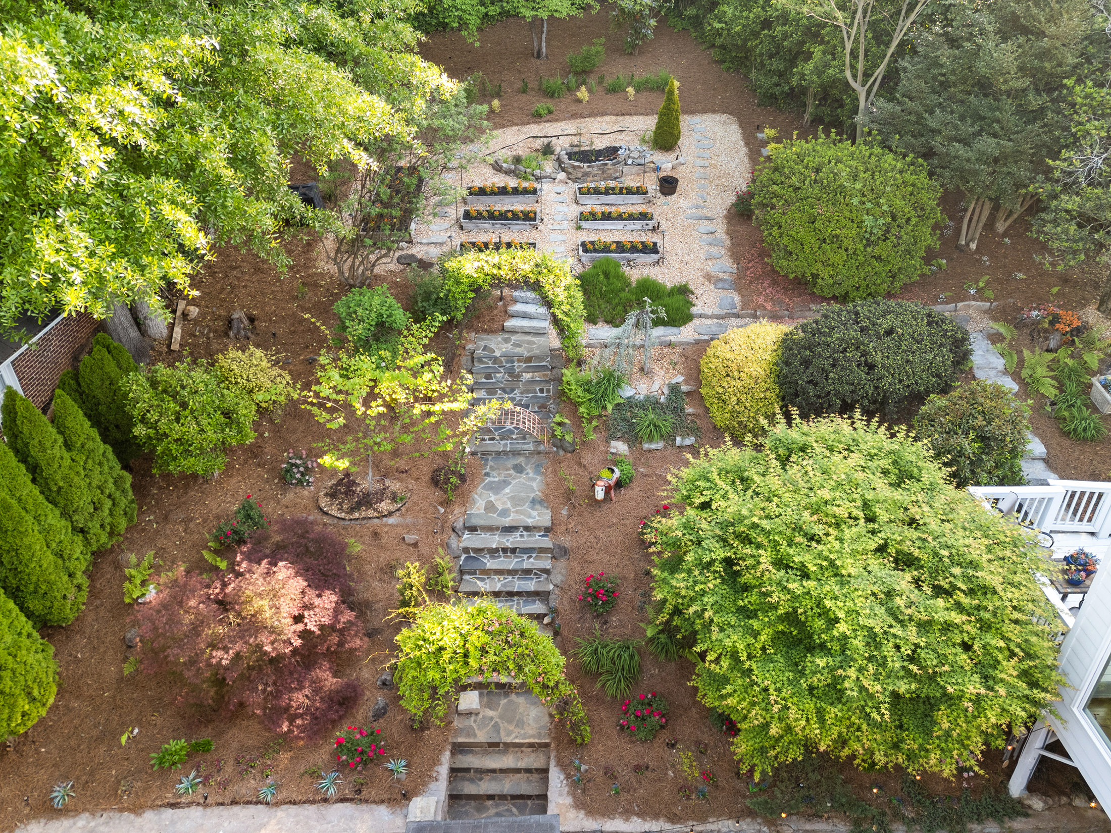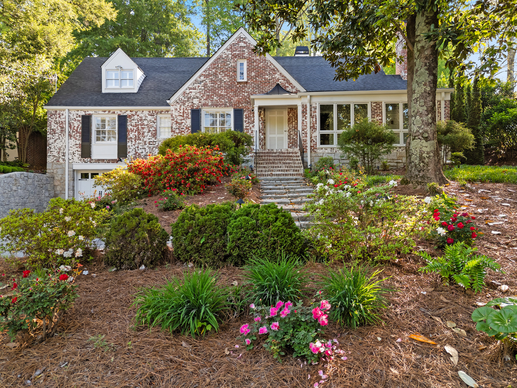 Timelessly elegant and beautifully updated, this white-washed brick residence exudes classic curb appeal. The exterior is framed by manicured granite-stone hardscaping, creating a refined first impression. A newly poured concrete driveway with additional parking pad leads to an inviting copper-topped portico, approached by broad granite paver steps that set the tone for the home’s craftsmanship and style. Inside, newly refinished hardwood floors flow seamlessly throughout the main level. The glass-paneled front door opens to a formal living room featuring an original stone-surround fireplace, while an airy sunroom with tile flooring and casement windows overlooks the front gardens. French doors from the gracious dining room open to a slate patio and private backyard, creating an effortless connection between indoor and outdoor living. A handsome wood-paneled office or den with floor-to-ceiling built-ins sits adjacent to the dining room, offering a warm and functional retreat. The true chef’s kitchen is outfitted with a five-burner Dacor cooktop, warming drawer, new LG refrigerator, built-in microwave, generous pantry storage, and abundant custom cabinetry. Granite countertops and a ceramic tile backsplash complete this timeless and highly functional space. Three spacious bedrooms grace the main level, each offering ample closet space. Two share a Jack-and-Jill bath with marble tile and a large walk-in shower, while the secondary full bath features travertine finishes, a soaking tub with glass doors, pedestal sink, and custom built-ins. The fireside primary suite spans the entire second floor with vaulted ceilings, dual walk-in closets, and a sitting area that opens to a private deck. A convenient wet bar with refrigerator and cabinetry makes mornings and evenings equally enjoyable. The marble-tiled primary bath includes a dual vanity, deep soaking tub, separate water closet, and newly remodeled shower. The lower level offers a two-car garage with space for modern SUVs, the laundry area, and exceptional storage. Outside, mature and lush landscaping creates a gardener’s paradise filled with roses, gardenias, azaleas, cypress, banana leaf fern, hydrangea, Japanese maples, and a variety of ferns. The main-level walk-out slate patio features a covered entertaining area and built-in bar, ideal for gatherings. Stone pathways wind through the gardens and lead to upper terraces that can serve as additional play or garden space. Irrigation, lighting, and strategically placed spigots have been thoughtfully installed to support the home’s extraordinary grounds. A rare blend of preserved character, modern comfort, and breathtaking outdoor living—this home offers a truly private and inviting retreat in the heart of the city.