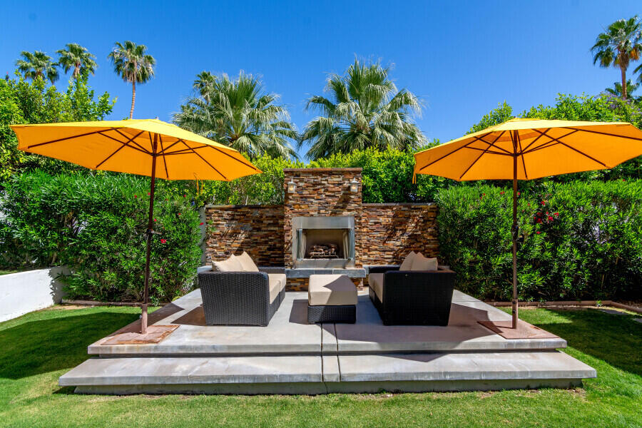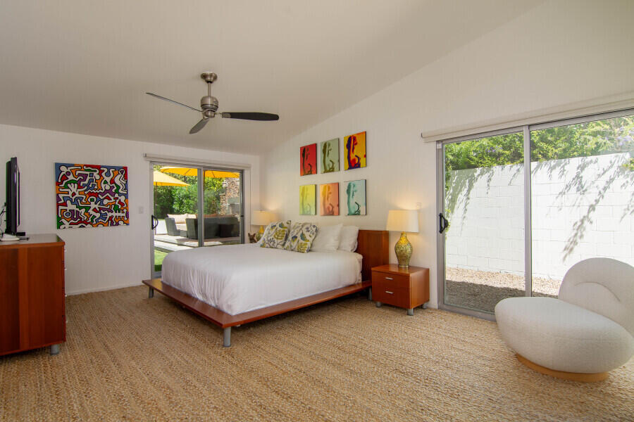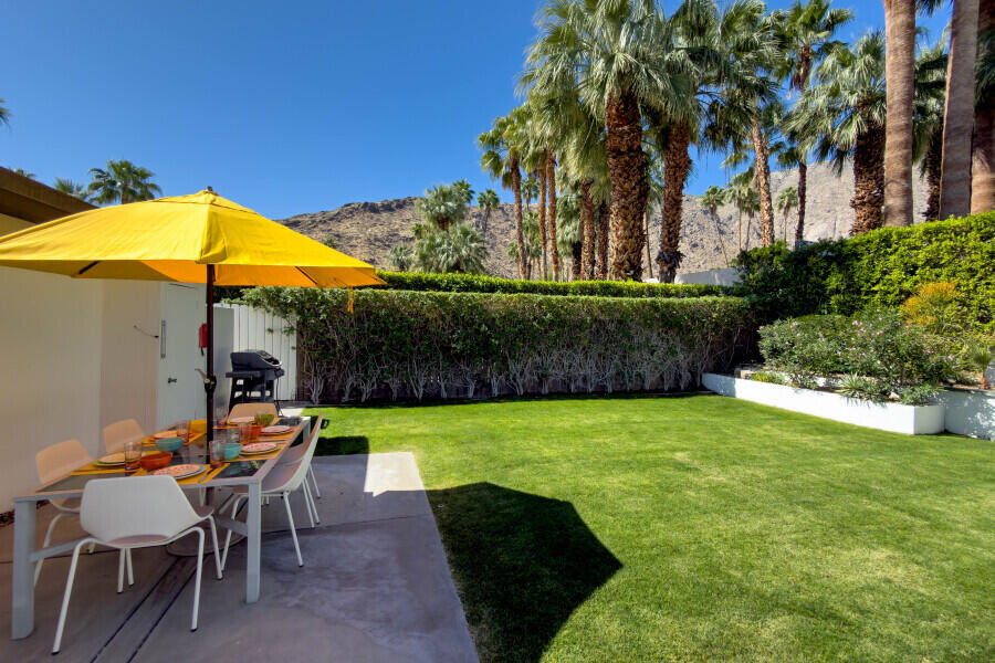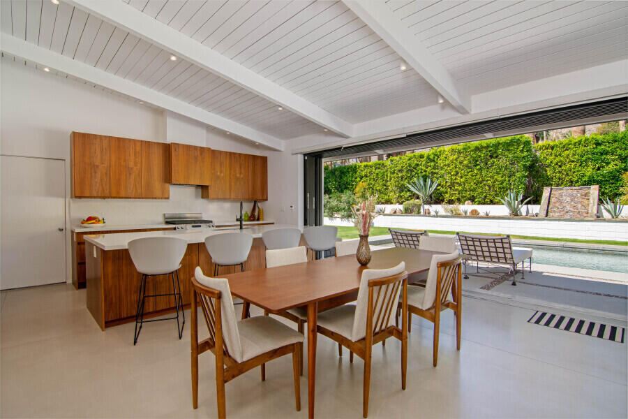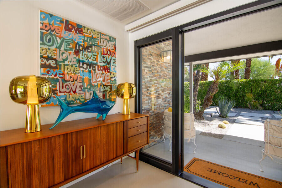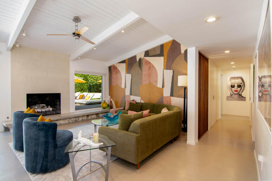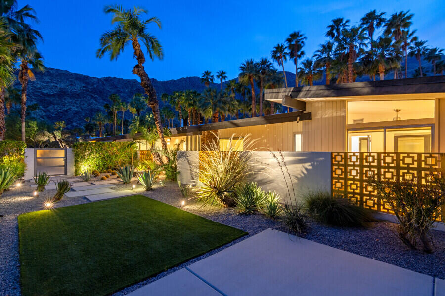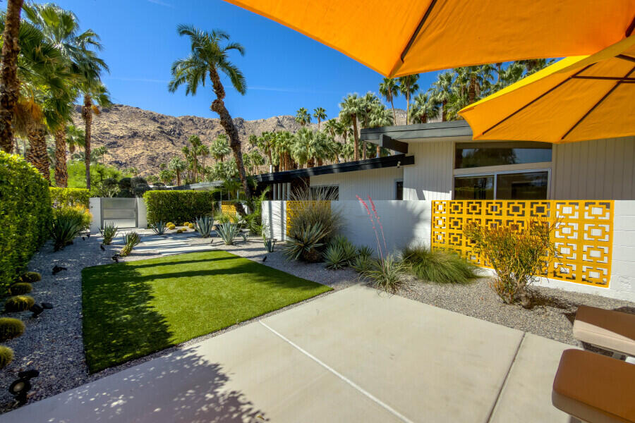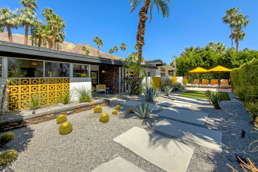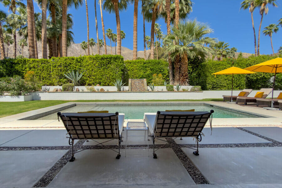 This beautifully updated Alexander mid-century home offers a coveted west-facing backyard with stunning mountain views from both the front and rear, creating a truly exceptional desert setting. Fully renovated in summer 2024, this 4 bedroom, 3 full bath residence seamlessly blends iconic mid-century architecture with thoughtfully curated modern upgrades, delivering a home that is completely move-in ready. Inside, polished concrete floors run throughout, enhancing the clean architectural lines and open concept design. The redesigned kitchen maximizes both form and function with sleek Corian countertops, warm oak veneer cabinetry, a wine fridge, and a Fisher & Paykel refrigerator. The bathrooms have been tastefully updated with a refined nod to mid-century design, while the primary suite serves as a tranquil retreat, complete with a rain shower and picturesque mountain views. Expansive walls of glass and Andersen pocket doors create a seamless indoor / outdoor connection, flooding the home with natural light and embracing the surrounding landscape. The living room is anchored by a striking stone wall fireplace, while a second gas fireplace enhances the outdoor entertaining space, set against lush green grass and thoughtfully designed gathering areas. The backyard has been completely reimagined into a private, resort style oasis. Enjoy a sparkling pool and spa with a cascading waterfall, a gas BBQ, multiple lounge and dining areas, and vintage collectible poolside chaises available for purchase. A built-in sound system and timed exterior lighting elevate the ambiance, making it ideal for both relaxed evenings and lively entertaining under the desert sky. The enclosed front yard is equally impressive, offering privacy, low maintenance artificial turf, and breathtaking mountain views, an ideal space for morning coffee or sunset gatherings. Recent improvements in 2024 include a new foam roof, furnace, A/C unit, rain gutters, and epoxy garage flooring. Additional features include two hot water heaters, updated pool equipment, a sprinkler system, and energy conscious landscaping. The garage is equipped with a washer and dryer, an additional refrigerator, and is prepped for EV charger installation, while a flexible linen closet offers the option for an interior stackable laundry setup. Furniture is available for purchase outside of escrow. Combining timeless mid-century style, modern comfort, and effortless indoor-outdoor living.