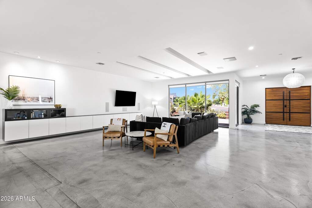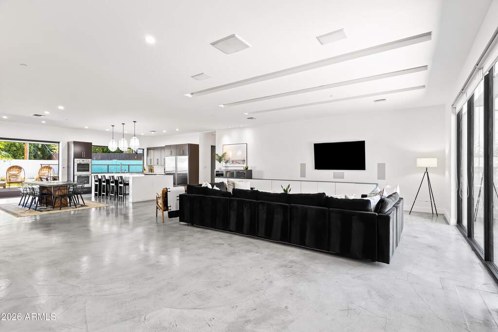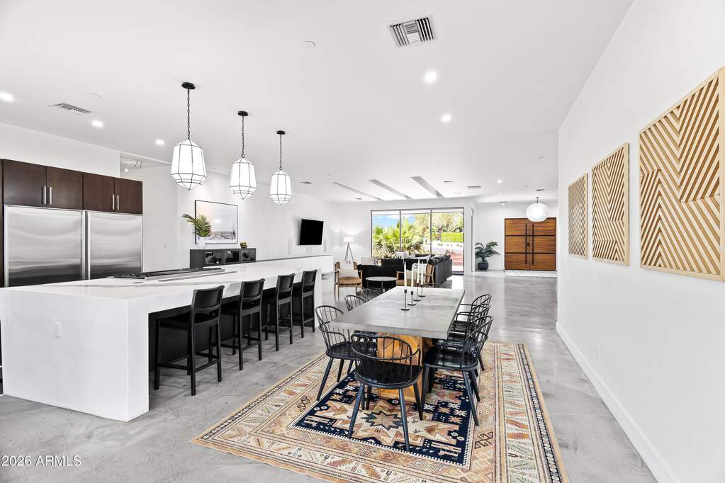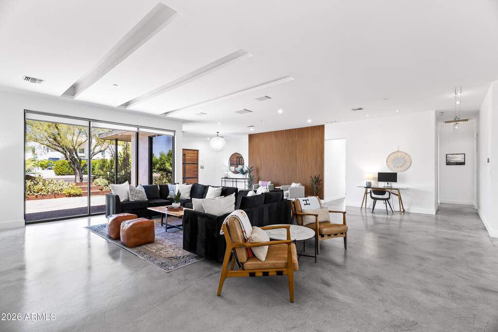 Experience refined desert living in this custom-built modern estate in the heart of Paradise Valley, showcasing breathtaking views of Camelback Mountain. Ideally located just minutes from Old Town Scottsdale, world-class resorts, championship golf, premier hiking trails, upscale dining, and luxury shopping. Designed with a focus on modern luxury and low-maintenance living, this 4-bedroom, 3-bath residence offers over 3,400 sq ft of thoughtfully curated space. The open-concept floor plan seamlessly connects the living, dining, and kitchen areas, highlighted by sleek concrete flooring, soaring 10-foot ceilings, and an expansive wall of sliding glass doors that create effortless indoor-outdoor flow. The chef's kitchen is equipped with stainless steel appliances, multiple ovens, a large center island, and a walk-in pantry--perfect for both everyday living and entertaining. The spacious primary suite features private backyard access, a separate sitting area, a custom walk-in closet, dual vanities, and an oversized walk-in shower. Additional highlights include a 3-car garage with built-in storage and epoxy flooring, as well as dual washer and dryer units for added convenience. Outdoor living is elevated with a rooftop deck offering stunning mountain views, and a resort-style backyard complete with a custom heated pool and spa, covered patio with built-in BBQ, and expansive yard with low-maintenance turf with desert landscaping.