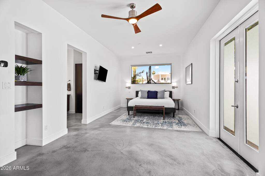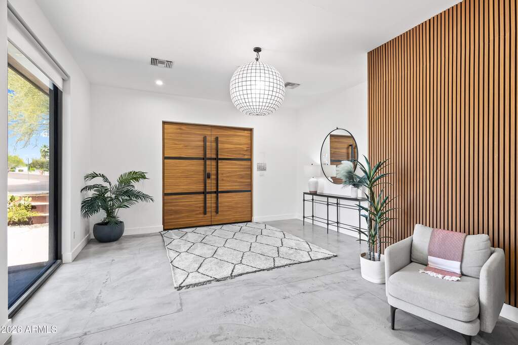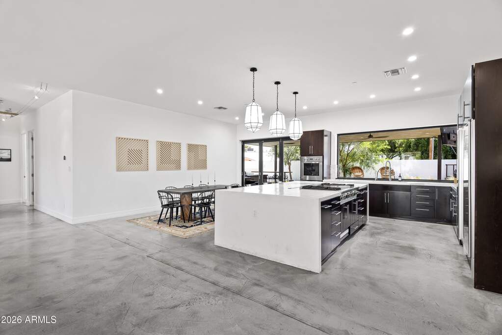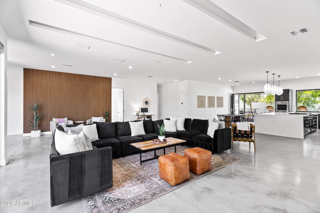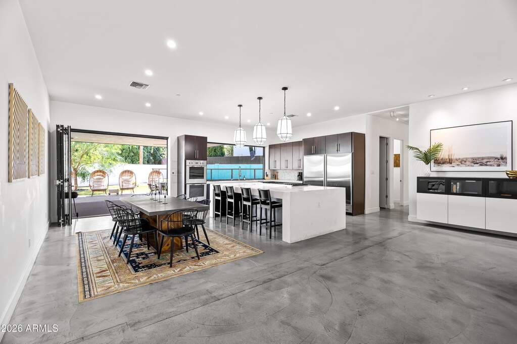 Experience refined desert living in this custom-built modern estate in the heart of Paradise Valley, showcasing breathtaking views of Camelback Mountain. Ideally located just minutes from Old Town Scottsdale, world-class resorts, championship golf, premier hiking trails, upscale dining, and luxury shopping. Designed with a focus on modern luxury and low-maintenance living, this 4-bedroom, 3-bath residence offers over 3,400 sq ft of thoughtfully curated space. The open-concept floor plan seamlessly connects the living, dining, and kitchen areas, highlighted by sleek concrete flooring, soaring 10-foot ceilings, and an expansive wall of sliding glass doors that create effortless indoor-outdoor flow. The chef's kitchen is equipped with stainless steel appliances, multiple ovens, a large center island, and a walk-in pantry--perfect for both everyday living and entertaining. The spacious primary suite features private backyard access, a separate sitting area, a custom walk-in closet, dual vanities, and an oversized walk-in shower. Additional highlights include a 3-car garage with built-in storage and epoxy flooring, as well as dual washer and dryer units for added convenience. Outdoor living is elevated with a rooftop deck offering stunning mountain views, and a resort-style backyard complete with a custom heated pool and spa, covered patio with built-in BBQ, and expansive yard with low-maintenance turf with desert landscaping.