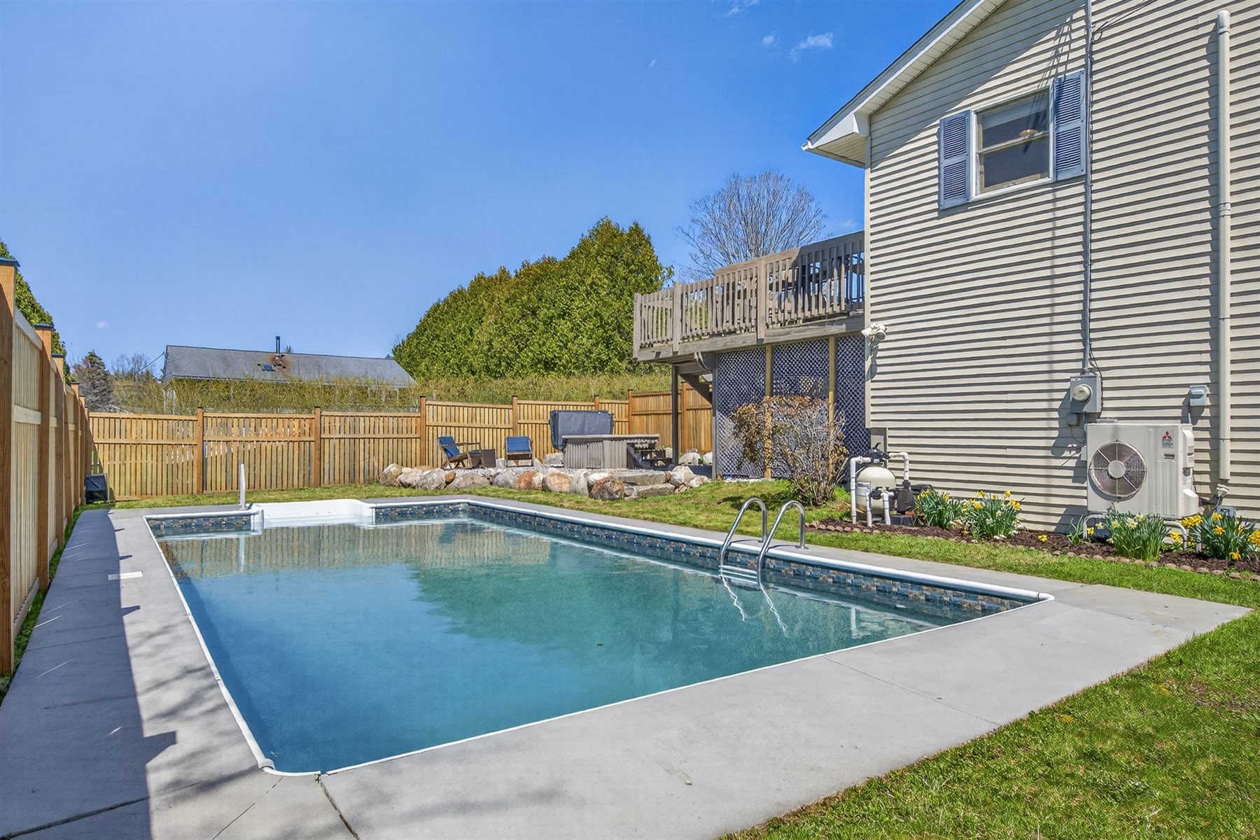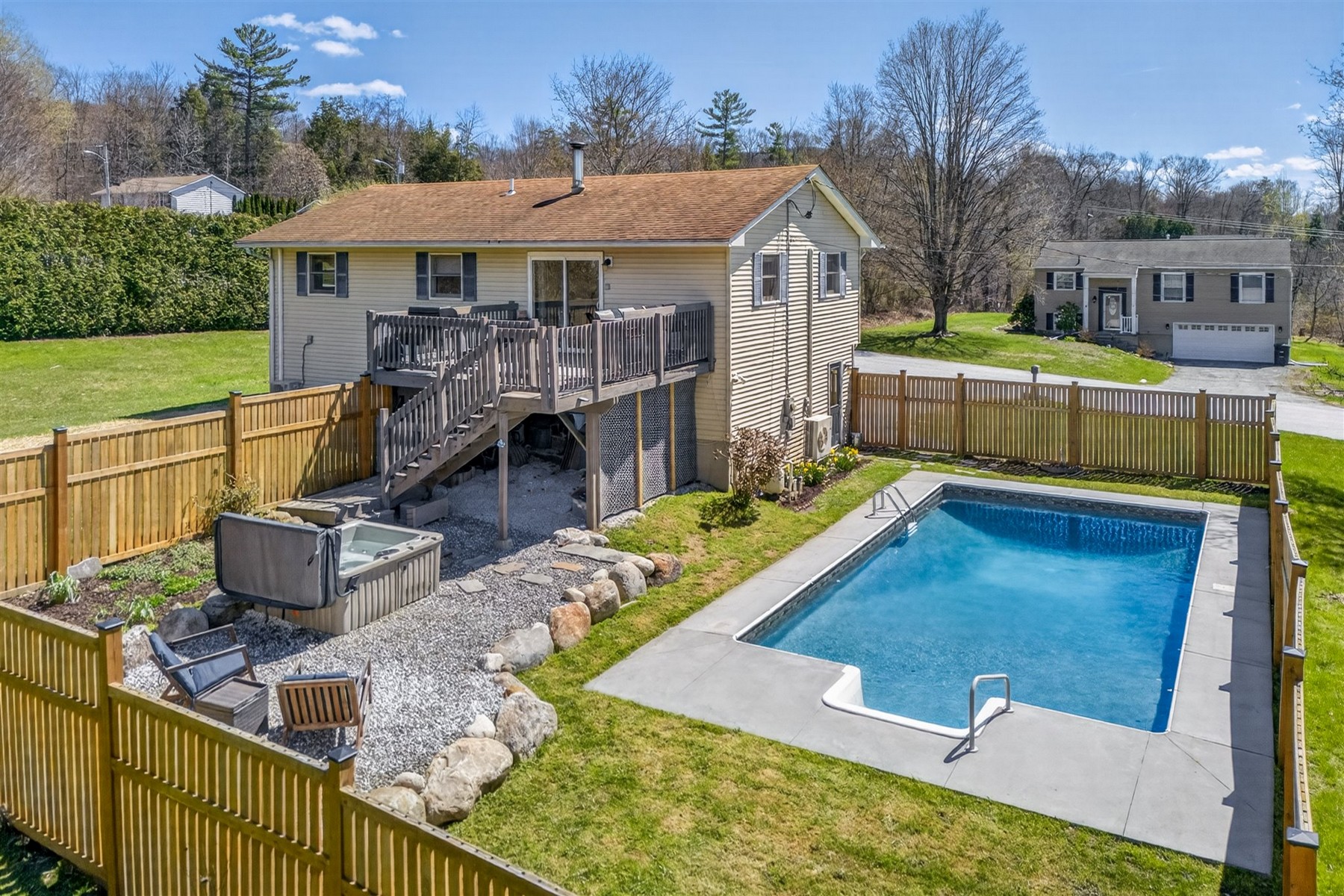OPEN HOUSE SATURDAY MAY 2 from 10 AM -12 PM. This well-maintained raised ranch is set on a pretty landscaped lot featuring mature shade trees, privacy-enhancing cedar trees, perennials, and a striking rock-terraced backyardperfectly designed to accommodate the hot tub. The inviting floor plan offers an eat-in kitchen with white countertops, attractive cabinetry, and stainless steel appliances, opening to a comfortable living area ideal for everyday living and entertaining. A centrally located mini-split provides efficient cooling. The main level includes three bedrooms and stylish bath, along with ample closet and storage space. The finished lower level adds valuable flexibility with a spacious bonus roomperfect for a family room, home office, or workout areaanother bathroom, plus a separate utility and laundry room. Enjoy outdoor living on the upper-level deck, where mountain views and sunsets create the perfect backdrop for relaxing or hosting guests. The deck overlooks an in-ground pool with its own privacy fence, offering a secluded retreat. Additional features include a one-car garage with EV charging station, workbench, and extra storage. Located in the desirable Charter Hills neighborhood, this home offers a low-traffic setting among well-kept properties, all within close proximity to Combination Pond.