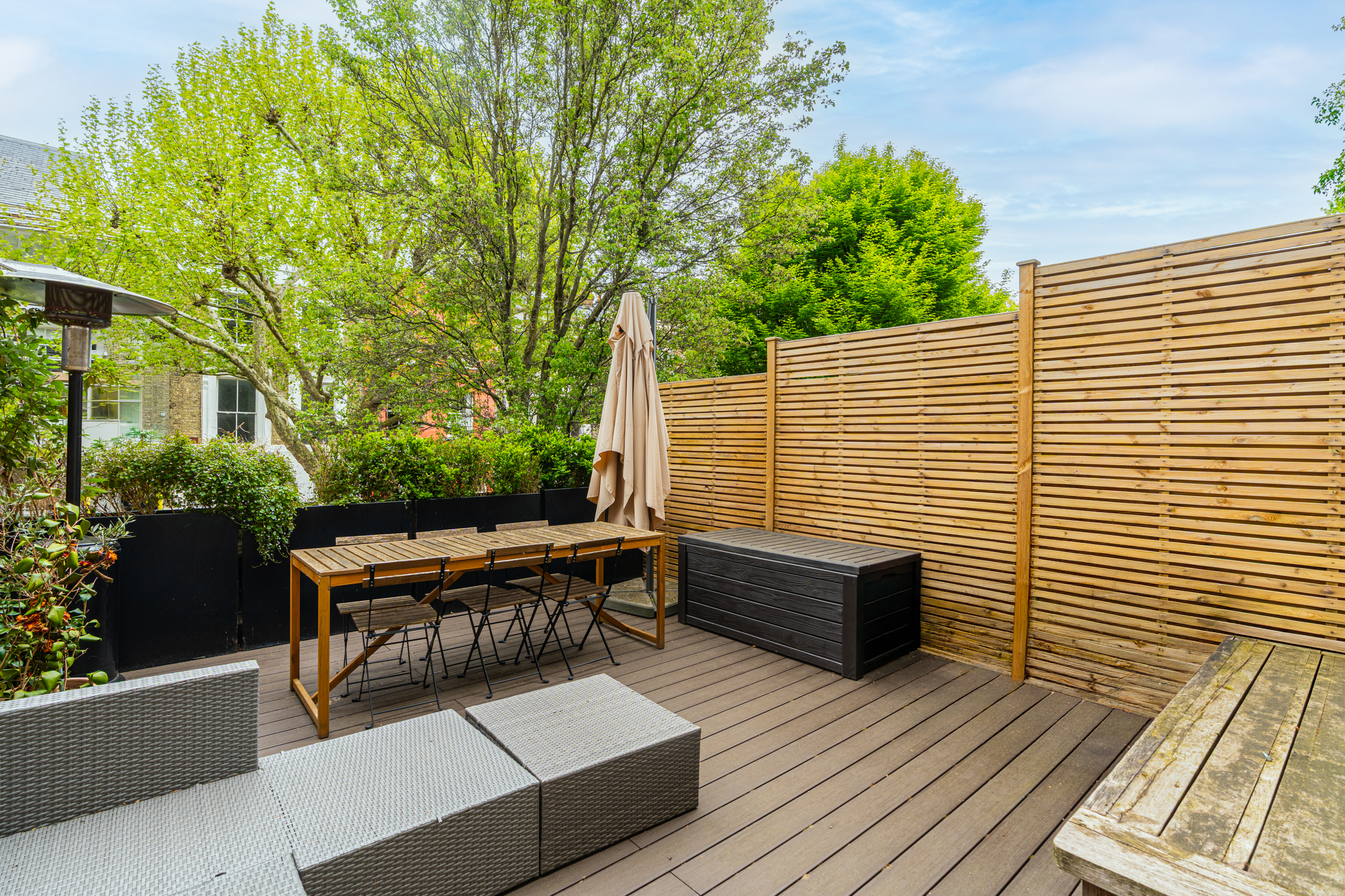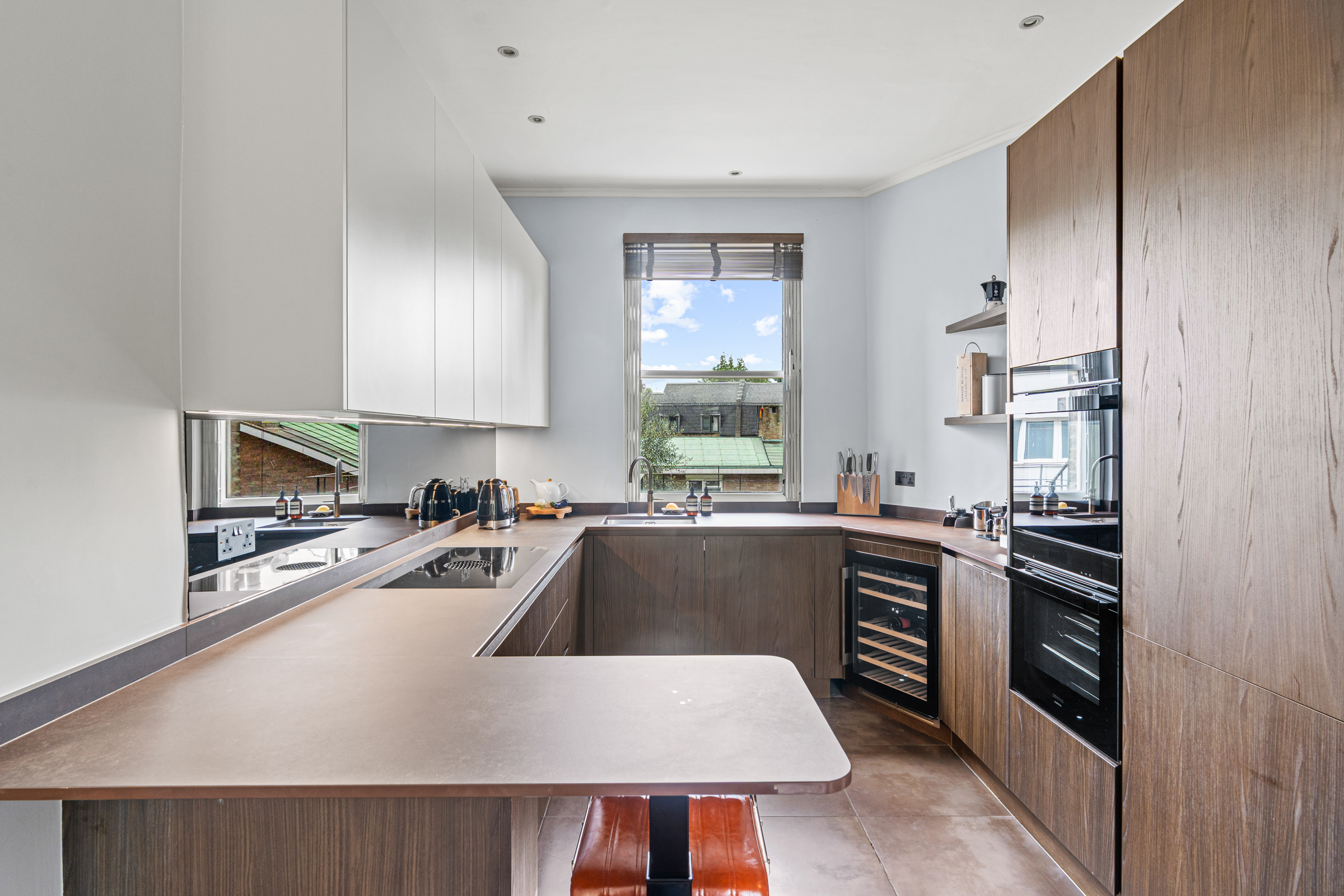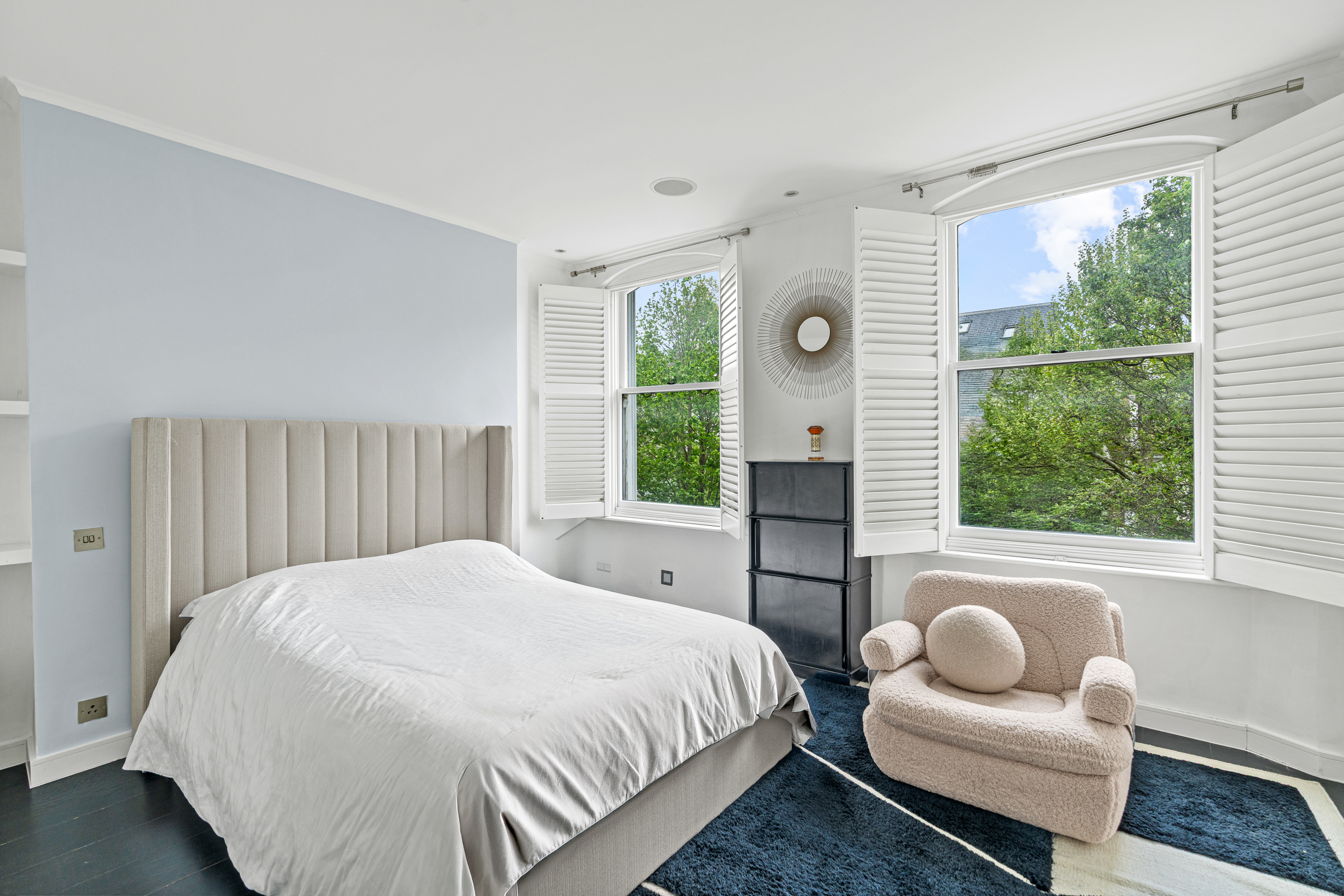 The first floor is given over to living and entertaining. A generous reception room sits to the front, where a wide bay window fitted with shutters draws in natural light and frames leafy street views. There is ample room here for both seating and dining, and is leads through to the adjoining kitchen. The kitchen itself is neatly arranged, with warm-toned cabinetry, integrated appliances and a breakfast bar. At the back, doors open directly onto a substantial private terrace, large enough for outdoor dining and set up as a true extension of the living space in warmer months.