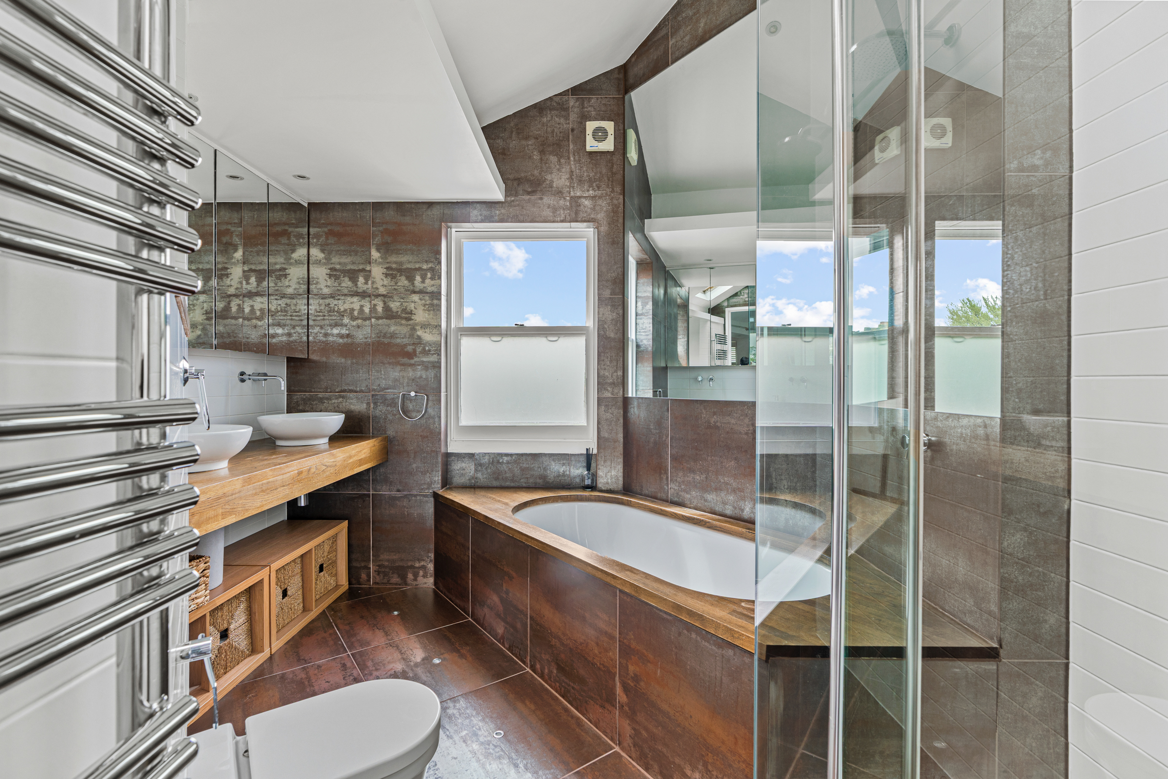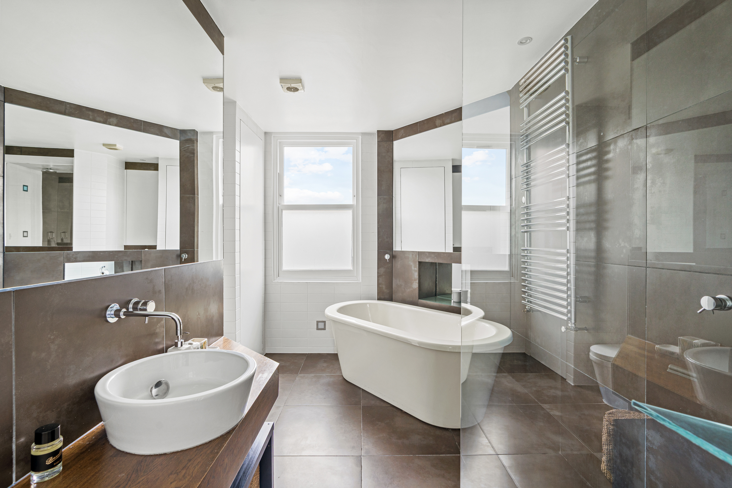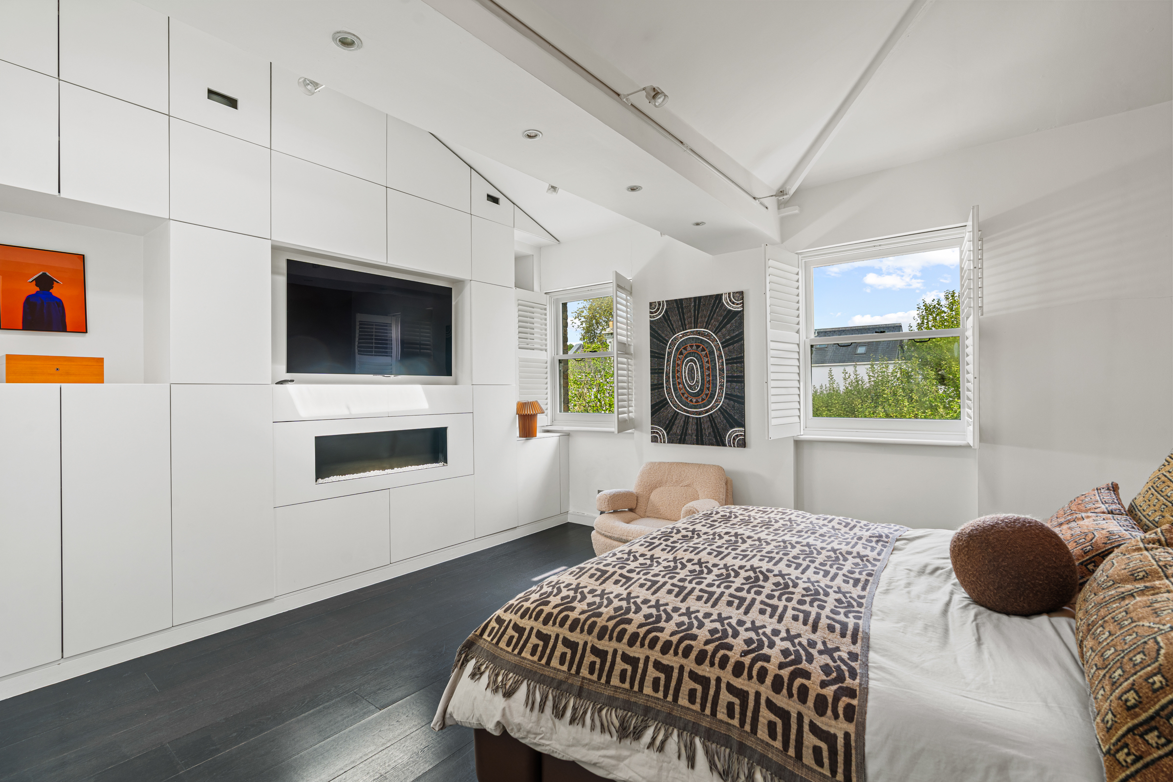 The top floor is reserved for the principal suite. Set beneath a gently vaulted ceiling, the bedroom has a tucked-away feel, complemented by fitted storage and an ensuite bathroom finished with a freestanding bath and walk-in shower. From this level, a second private terrace offers a more secluded outdoor space.