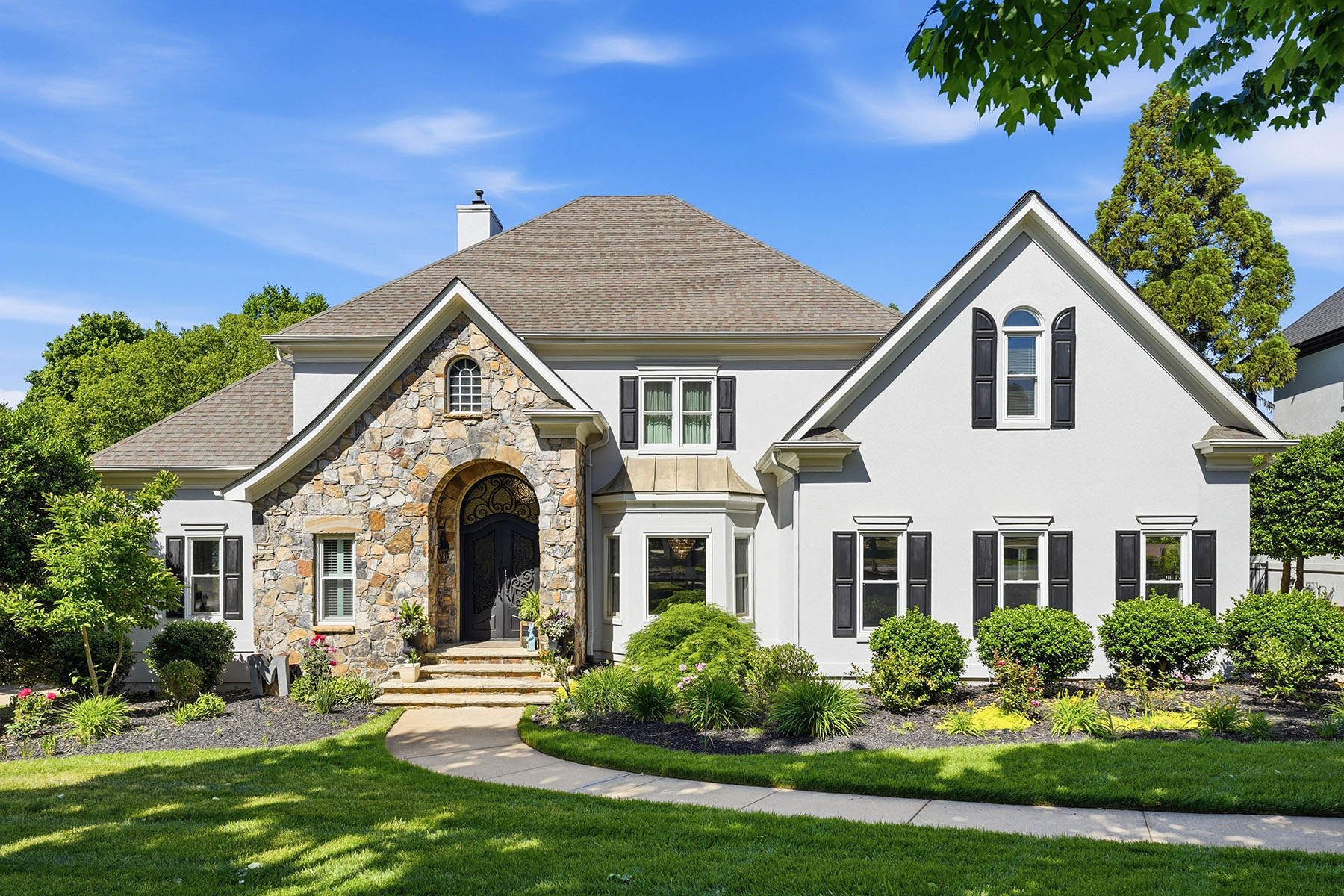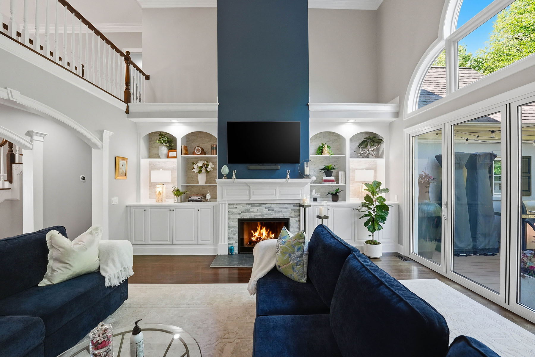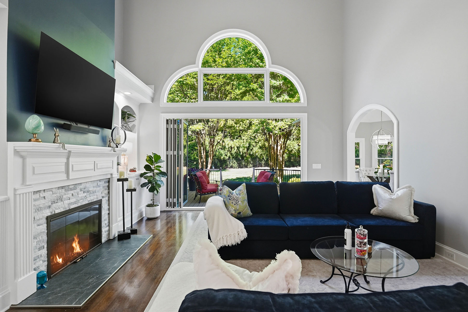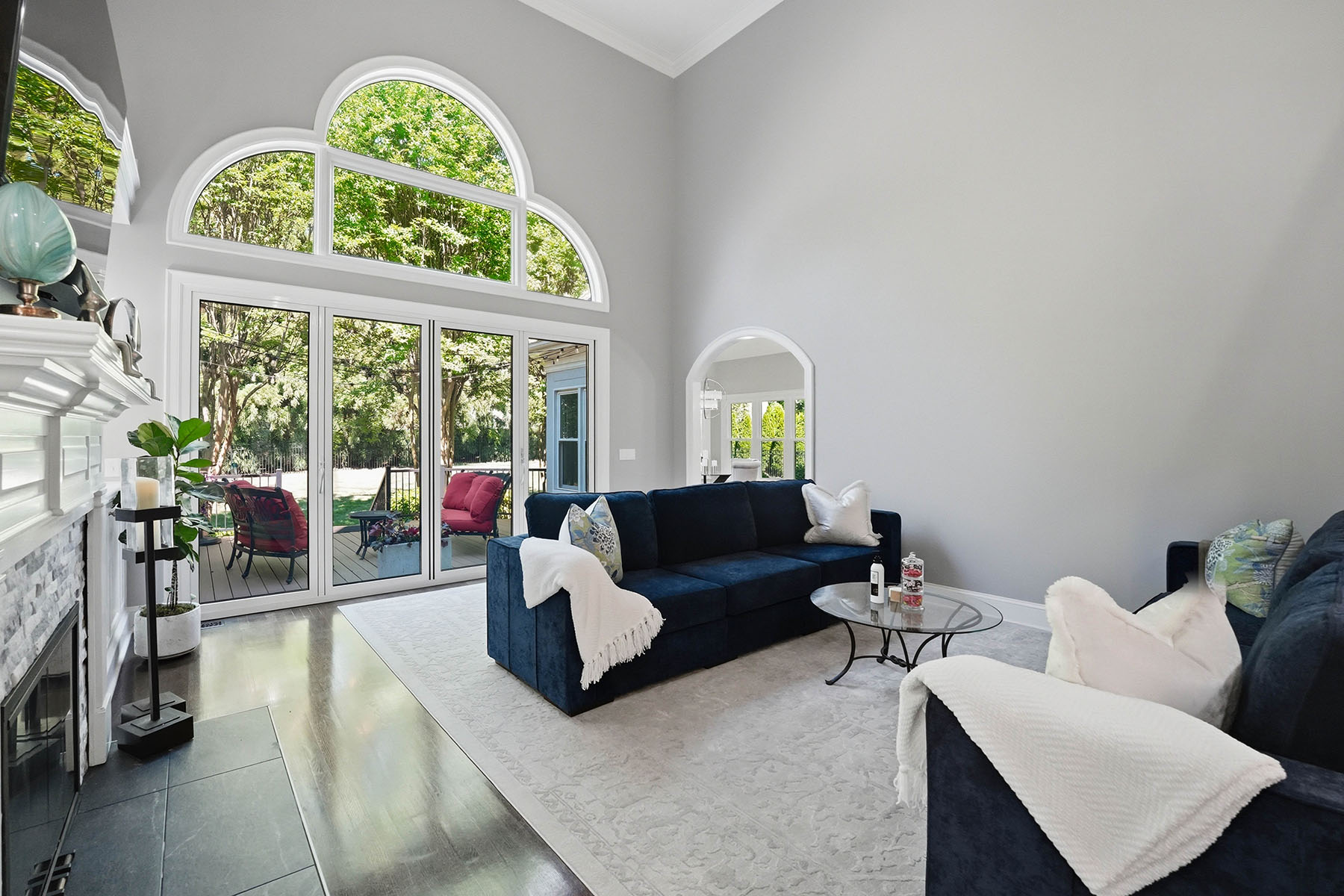 Positioned on a sought-after street within The Peninsula, this move-in ready residence presents a refined approach to Lake Norman living, where architectural scale, indoor-outdoor design and everyday functionality align. A grand entry framed by double ironwork doors opens to a two-story living space defined by volume and light. The entryway is complemented by an elaborate chandelier that establishes a strong sense of arrival. The open-to-below design creates a dramatic vertical presence, enhanced by an upper-level overlook that anchors the home's layout. A fireplace with integrated built-in cabinetry establishes the living room as a central gathering point, while expansive multi-panel sliding glass doors fully retract, extending the space seamlessly onto the deck for true indoor-outdoor living. The kitchen has been reimagined for both function and entertaining, featuring custom cabinetry, stainless steel appliances and granite countertops. A window-lined breakfast area introduces natural light throughout the day, while a dedicated office and formal dining area provide flexibility for work, hosting and daily routines. The primary suite offers a private retreat with dual closets and direct access to a renovated bath appointed with heated tile flooring and LED mirrors. Three additional bedrooms are located on the upper level. A first-floor laundry room adds convenience, while an upper-level flex space allows for media, fitness or secondary lounge use. The exterior combines stucco and stone, reinforcing the home's architectural presence. The flat, manicured yard is framed by mature landscaping that enhances privacy, with approval in place for future pool installation. The outdoor deck serves as a natural extension of the interior living areas. Located within The Peninsula community, the home offers access to Lake Norman, golf and established neighborhood amenities. Nearby The Peninsula Club provides golf, tennis and pool facilities, while Safe Harbor Peninsula Yacht Club supports an active boating lifestyle.