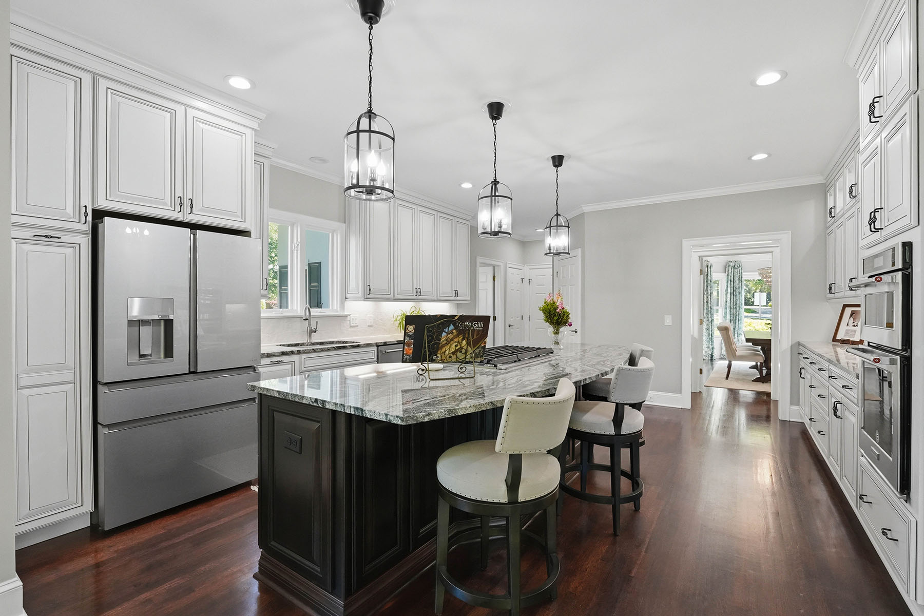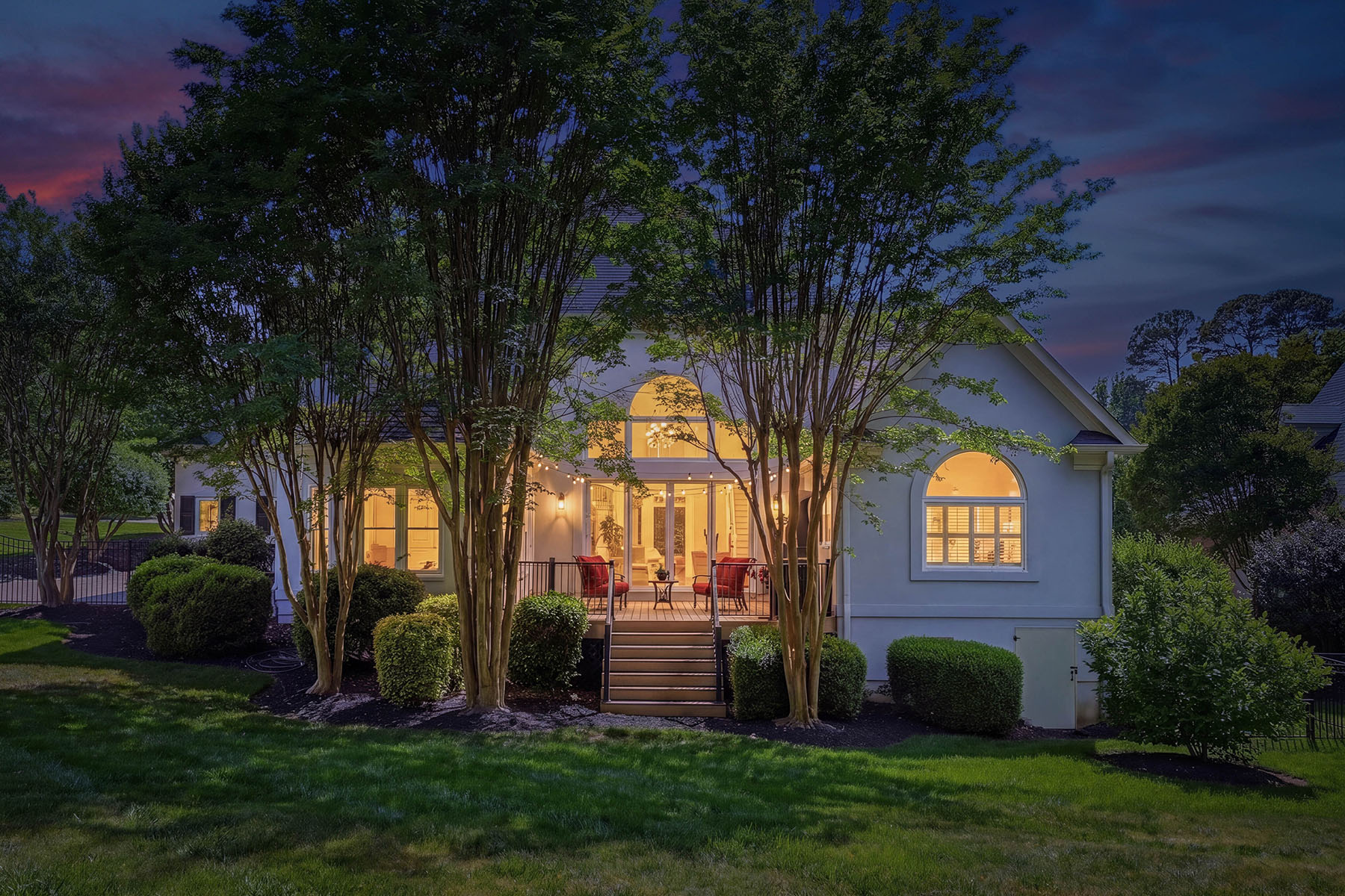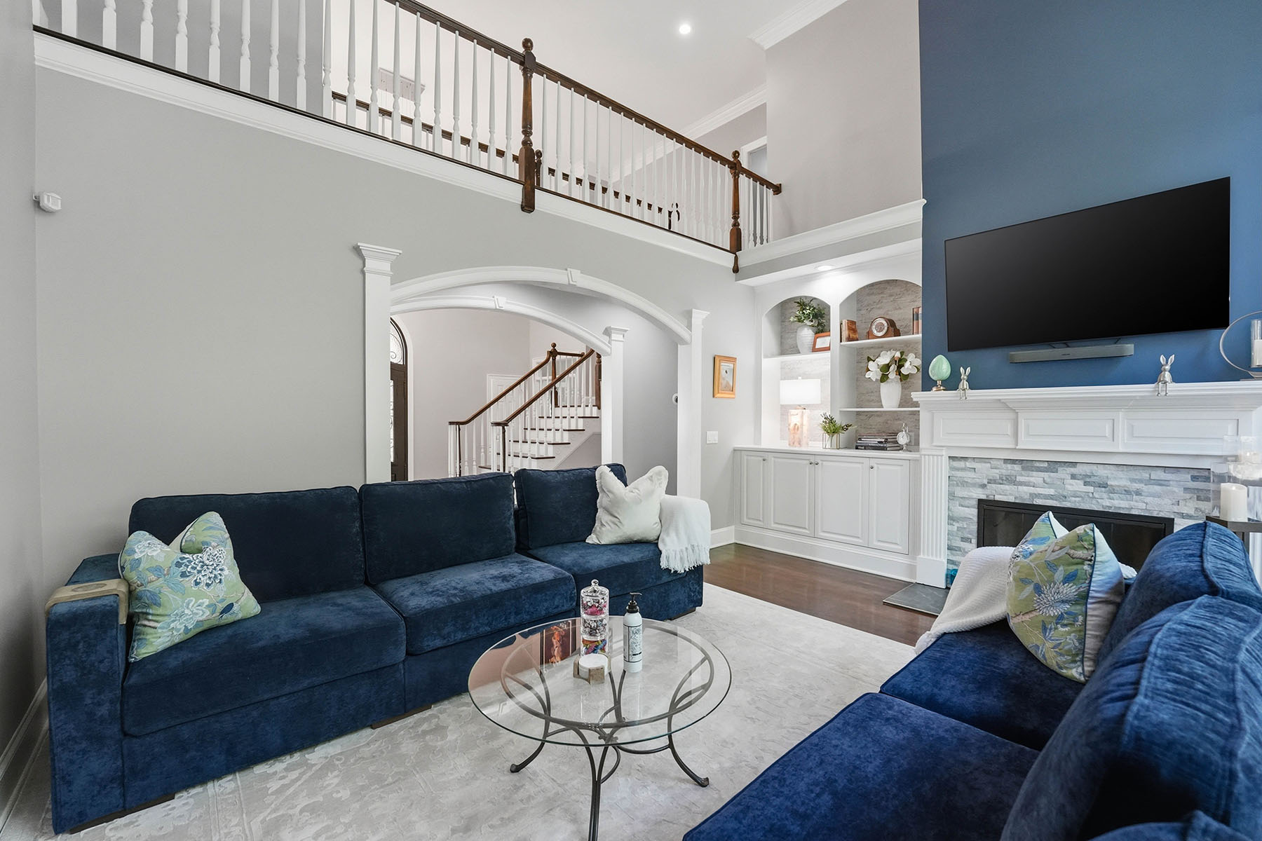 Positioned on a sought-after street within The Peninsula, this move-in ready residence presents a refined approach to Lake Norman living, where architectural scale, indoor-outdoor design and everyday functionality align. A grand entry framed by double ironwork doors opens to a two-story living space defined by volume and light. The entryway is complemented by an elaborate chandelier that establishes a strong sense of arrival. The open-to-below design creates a dramatic vertical presence, enhanced by an upper-level overlook that anchors the home's layout. A fireplace with integrated built-in cabinetry establishes the living room as a central gathering point, while expansive multi-panel sliding glass doors fully retract, extending the space seamlessly onto the deck for true indoor-outdoor living. The kitchen has been reimagined for both function and entertaining, featuring custom cabinetry, stainless steel appliances and granite countertops. A window-lined breakfast area introduces natural light throughout the day, while a dedicated office and formal dining area provide flexibility for work, hosting and daily routines. The primary suite offers a private retreat with dual closets and direct access to a renovated bath appointed with heated tile flooring and LED mirrors. Three additional bedrooms are located on the upper level. A first-floor laundry room adds convenience, while an upper-level flex space allows for media, fitness or secondary lounge use. The exterior combines stucco and stone, reinforcing the home's architectural presence. The flat, manicured yard is framed by mature landscaping that enhances privacy, with approval in place for future pool installation. The outdoor deck serves as a natural extension of the interior living areas. Located within The Peninsula community, the home offers access to Lake Norman, golf and established neighborhood amenities. Nearby The Peninsula Club provides golf, tennis and pool facilities, while Safe Harbor Peninsula Yacht Club supports an active boating lifestyle.