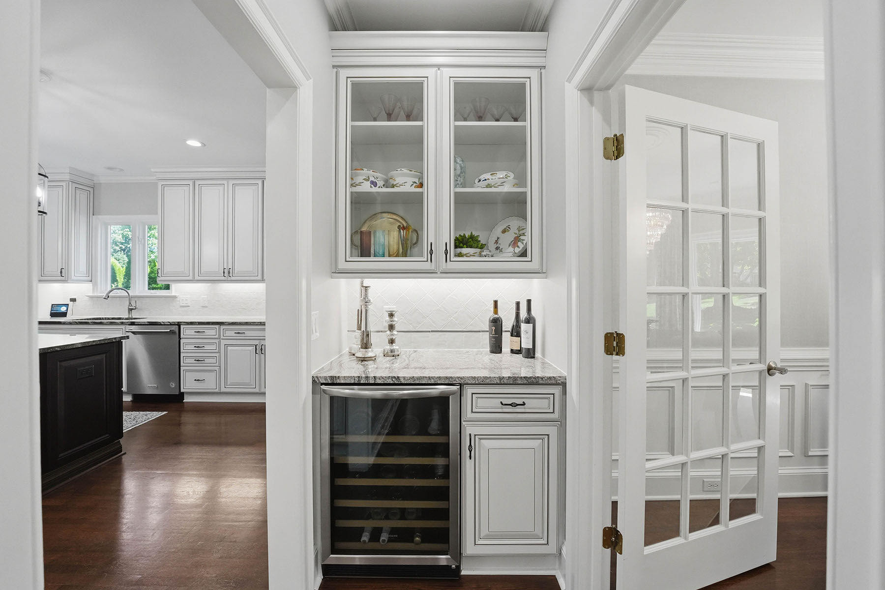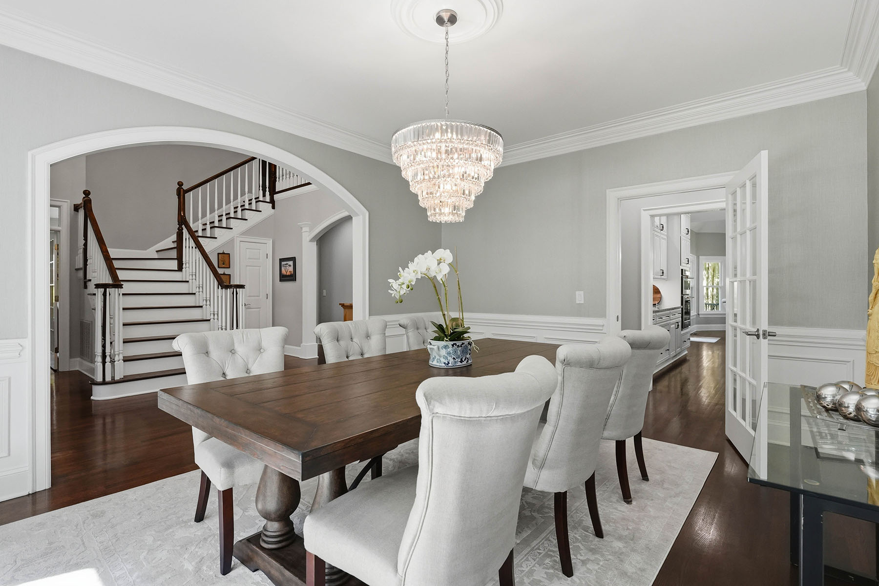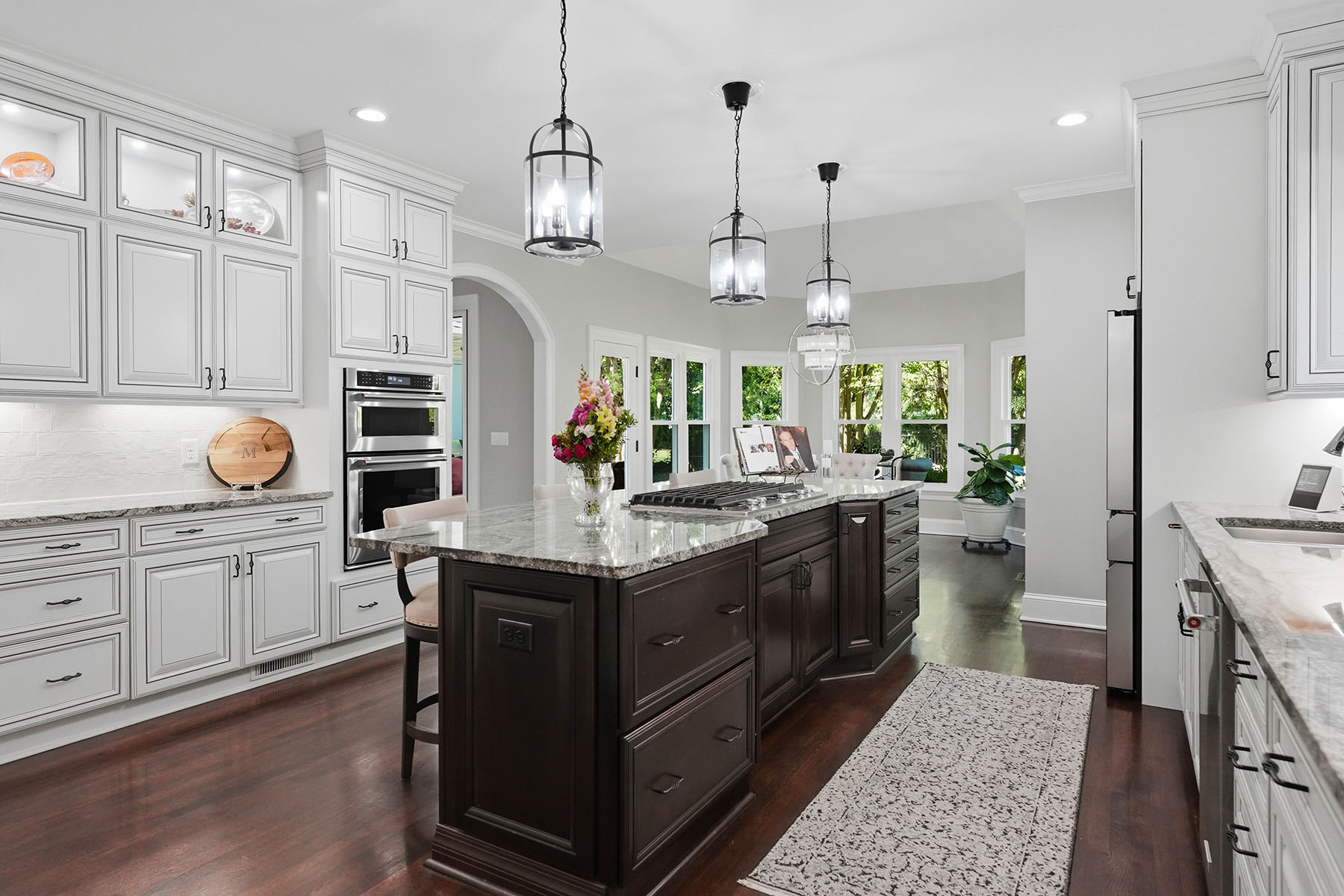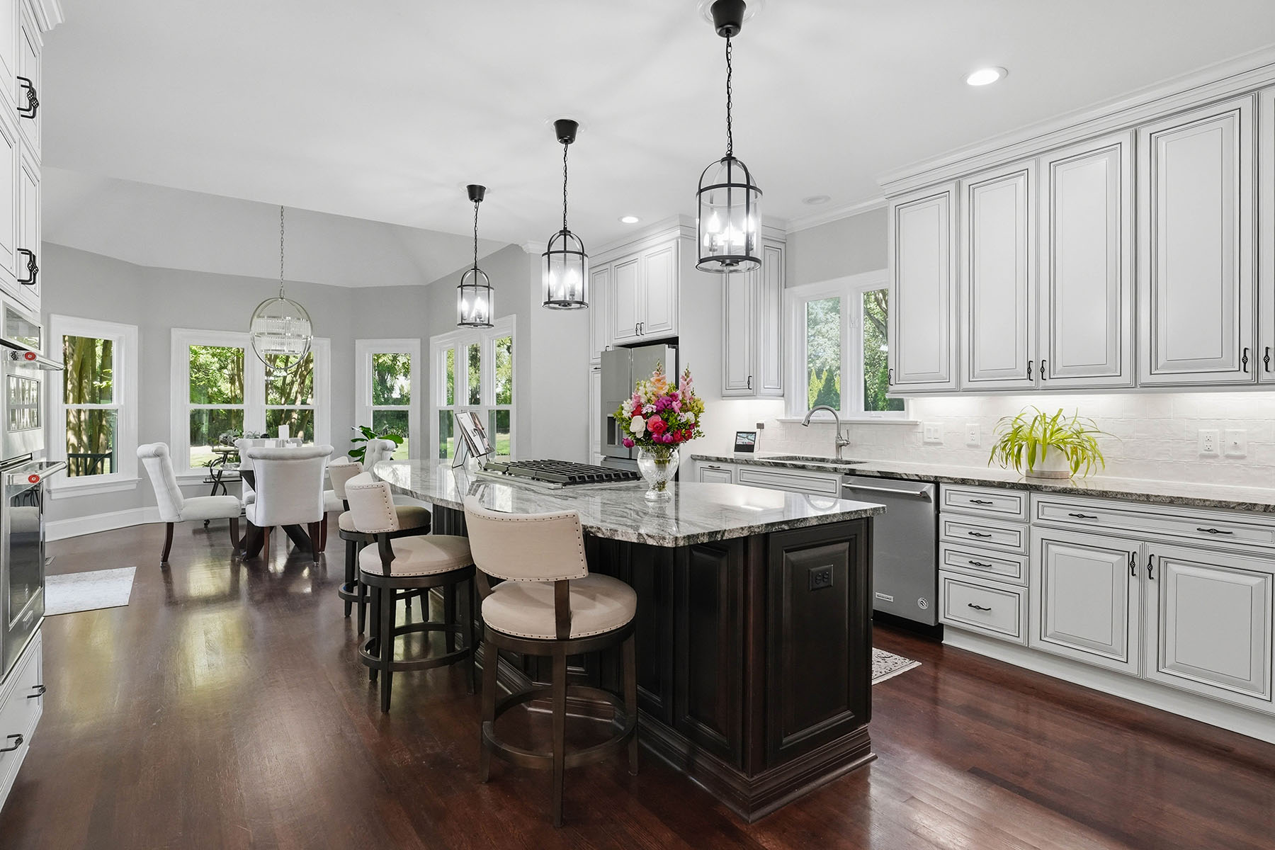 Positioned on a sought-after street within The Peninsula, this move-in ready residence presents a refined approach to Lake Norman living, where architectural scale, indoor-outdoor design and everyday functionality align. A grand entry framed by double ironwork doors opens to a two-story living space defined by volume and light. The entryway is complemented by an elaborate chandelier that establishes a strong sense of arrival. The open-to-below design creates a dramatic vertical presence, enhanced by an upper-level overlook that anchors the home's layout. A fireplace with integrated built-in cabinetry establishes the living room as a central gathering point, while expansive multi-panel sliding glass doors fully retract, extending the space seamlessly onto the deck for true indoor-outdoor living. The kitchen has been reimagined for both function and entertaining, featuring custom cabinetry, stainless steel appliances and granite countertops. A window-lined breakfast area introduces natural light throughout the day, while a dedicated office and formal dining area provide flexibility for work, hosting and daily routines. The primary suite offers a private retreat with dual closets and direct access to a renovated bath appointed with heated tile flooring and LED mirrors. Three additional bedrooms are located on the upper level. A first-floor laundry room adds convenience, while an upper-level flex space allows for media, fitness or secondary lounge use. The exterior combines stucco and stone, reinforcing the home's architectural presence. The flat, manicured yard is framed by mature landscaping that enhances privacy, with approval in place for future pool installation. The outdoor deck serves as a natural extension of the interior living areas. Located within The Peninsula community, the home offers access to Lake Norman, golf and established neighborhood amenities. Nearby The Peninsula Club provides golf, tennis and pool facilities, while Safe Harbor Peninsula Yacht Club supports an active boating lifestyle.