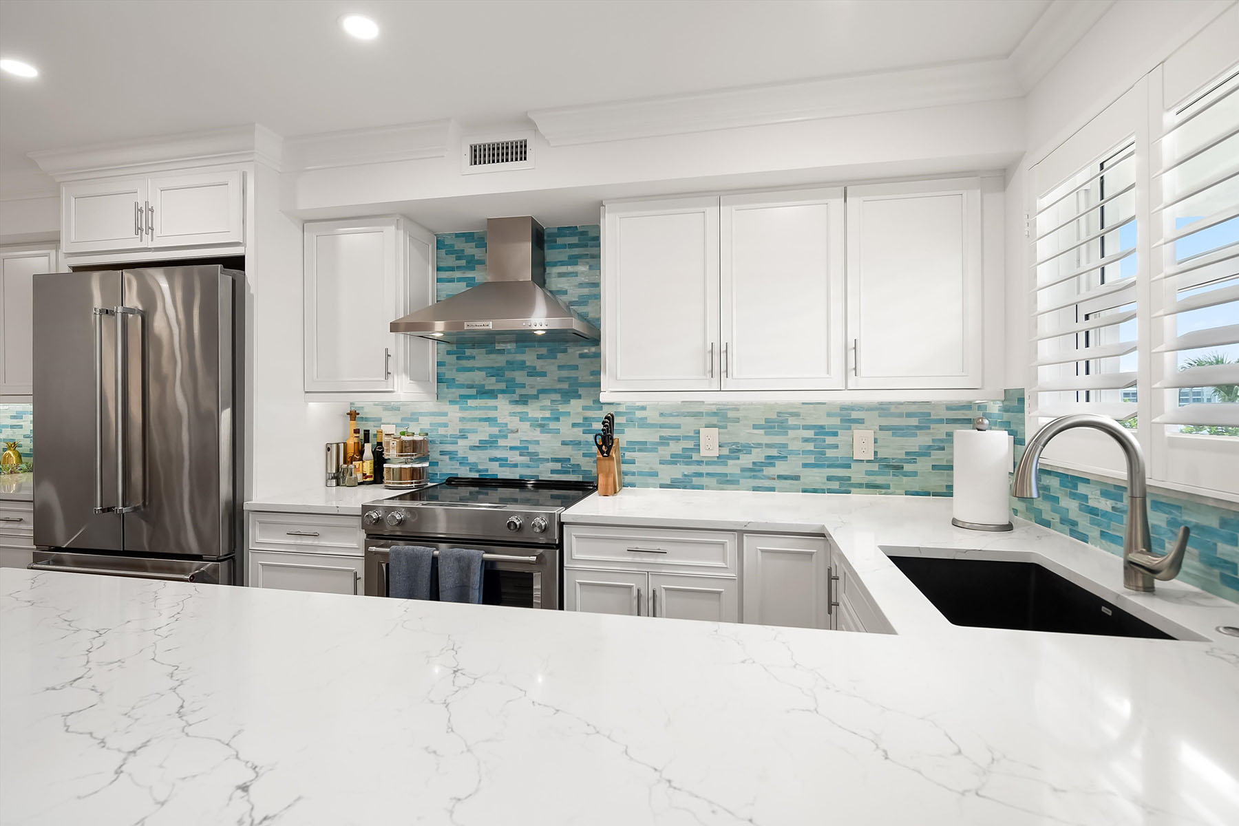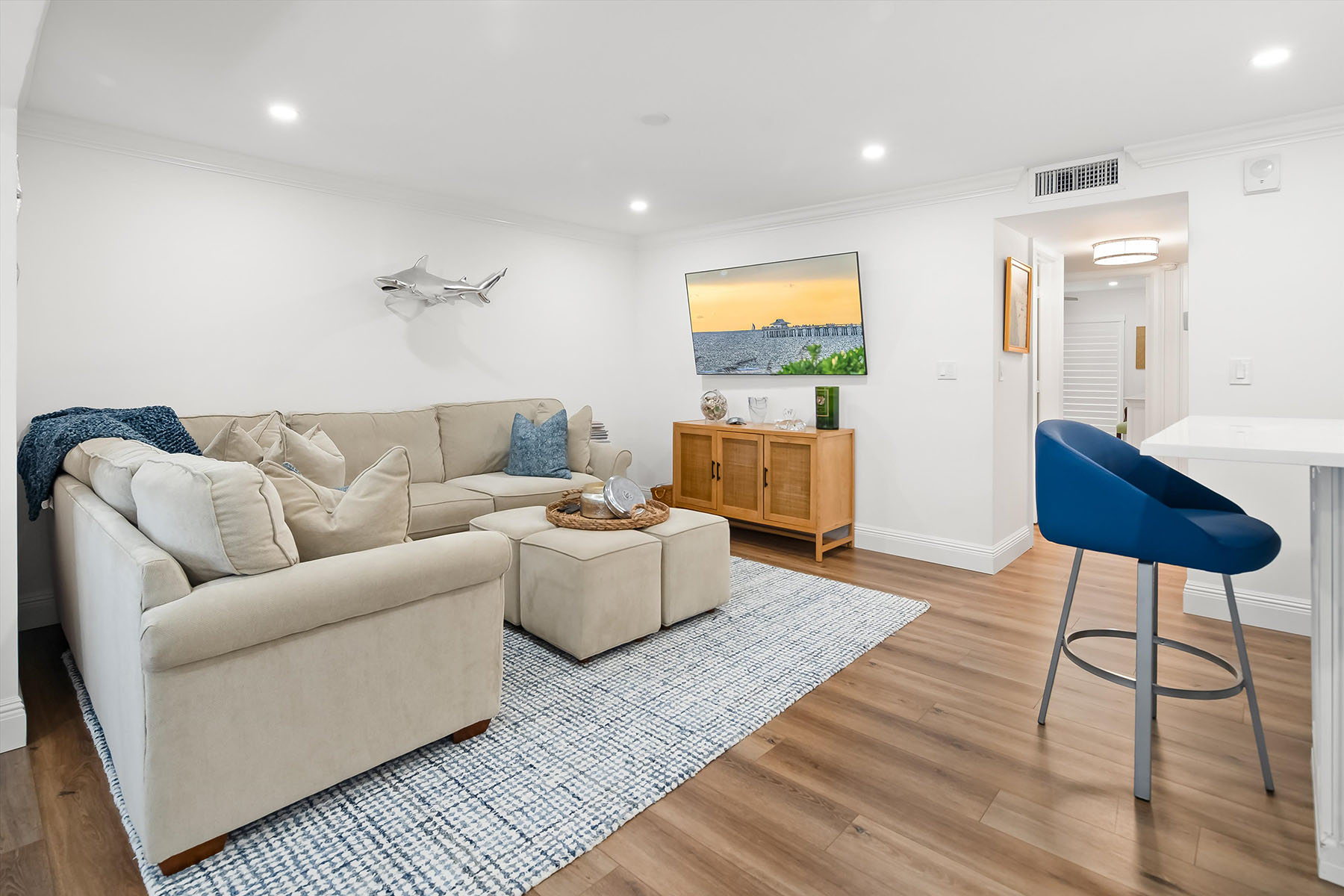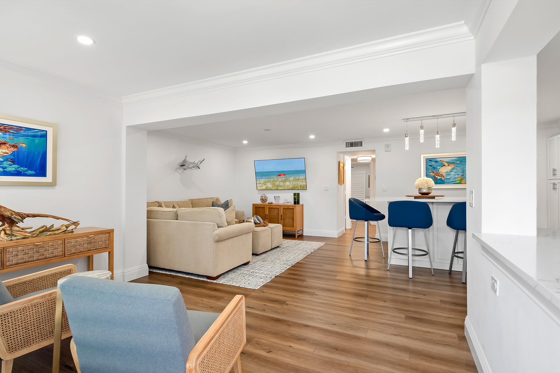 Positioned near the beaches of Naples, this turnkey-furnished residence offers a rare combination of coastal proximity and thoughtful interior renovation. Extensively updated in 2023, the property reflects a refined approach to design, functionality and long-term livability. Impact-resistant windows and continuous luxury vinyl plank flooring establish a cohesive interior, complemented by a neutral palette suited to a range of design preferences. The kitchen has been re-envisioned with quartz surfaces, stainless steel appliances and a glass tile backsplash, anchored by a streamlined stainless steel ventilation hood designed for efficiency and visual continuity. Both baths feature updated tilework, glass-enclosed showers and well-proportioned storage, creating a consistent aesthetic throughout the residence. A distinguishing element of this property is the presence of two private rear entrances with direct access from the covered carport, offering a level of convenience and separation not commonly found within the community.