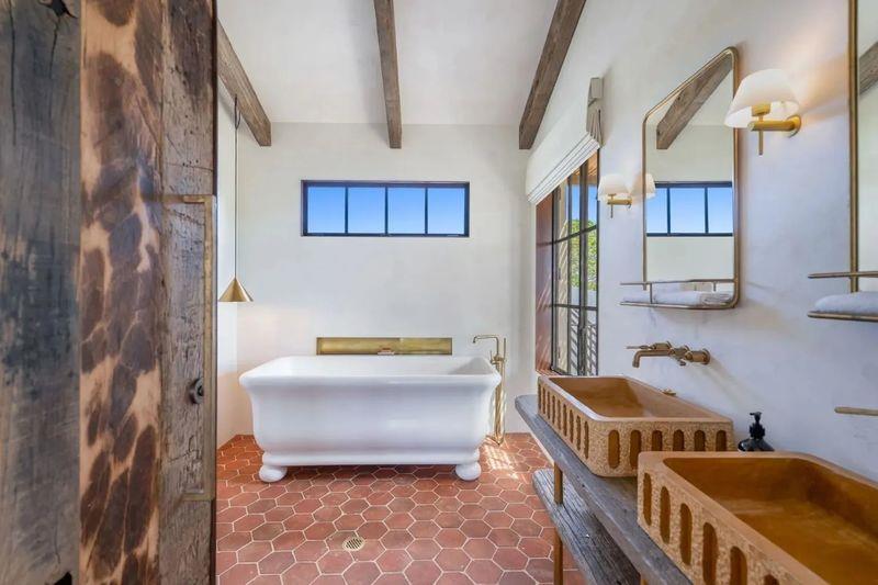 Lo Scoglio, perched on a crest in Coopers Shoot near Byron Bay, Australia, exemplifies this approach. Conceived as a contemporary reinterpretation of a Sicilian masseria (rural estate), the main villa and guest house are united in their sensitive use of craft—from hand-chipped limestone walls, century-old hardwood floor and terracotta finishes to brass details sourced through Tigmi Trading. In a contemporary take on crafted luxury, the estate blends these artisanal details with modern systems, including solar power and rainwater harvesting.