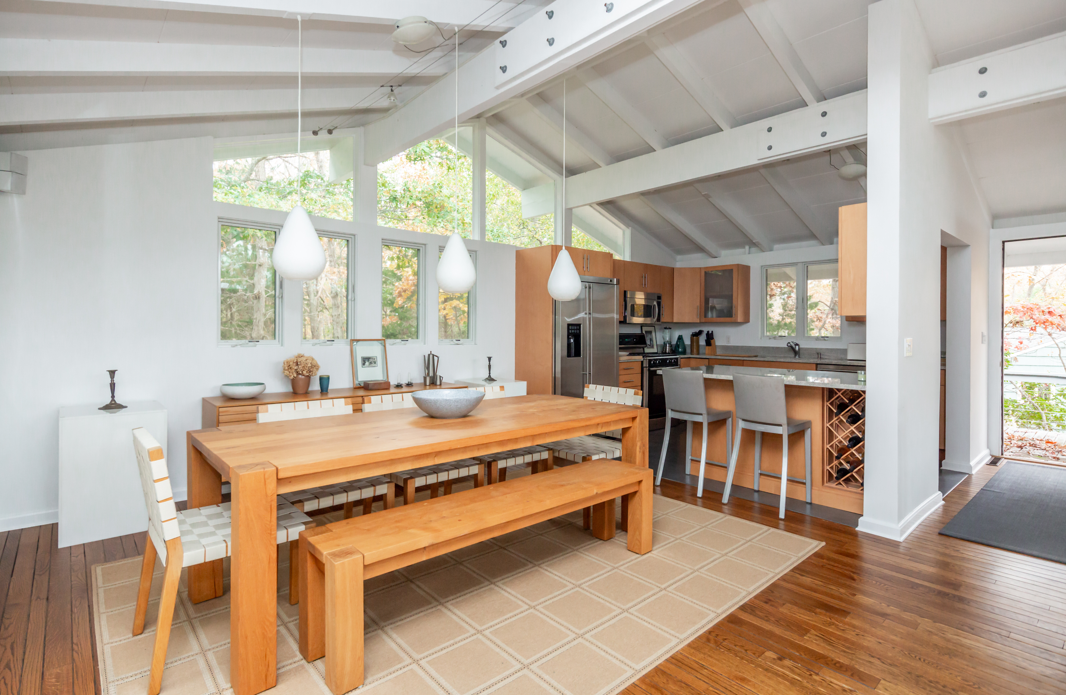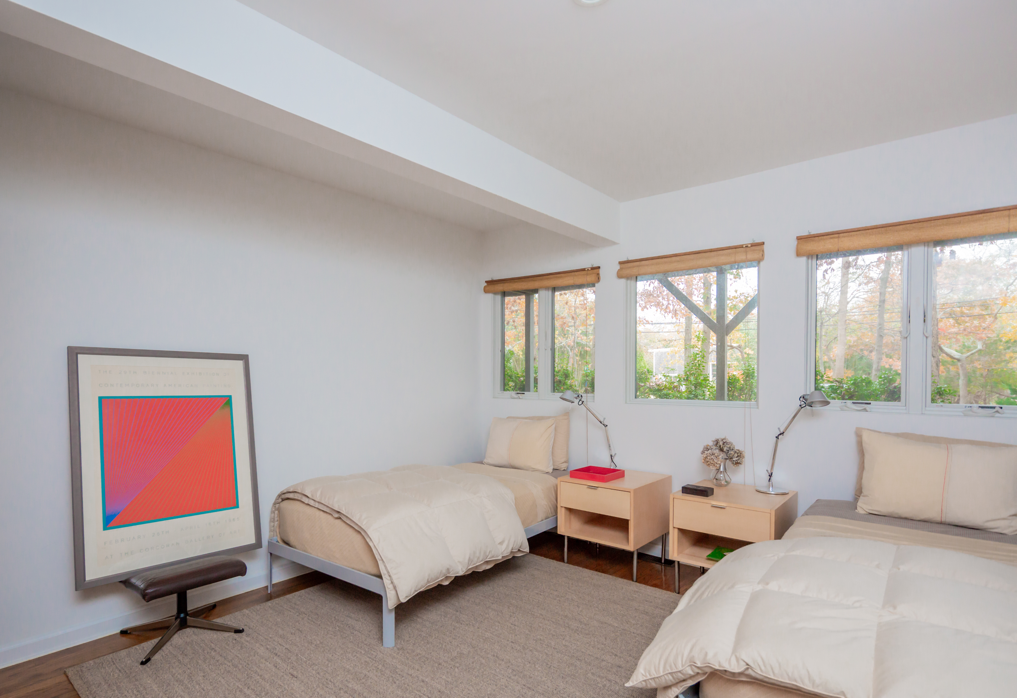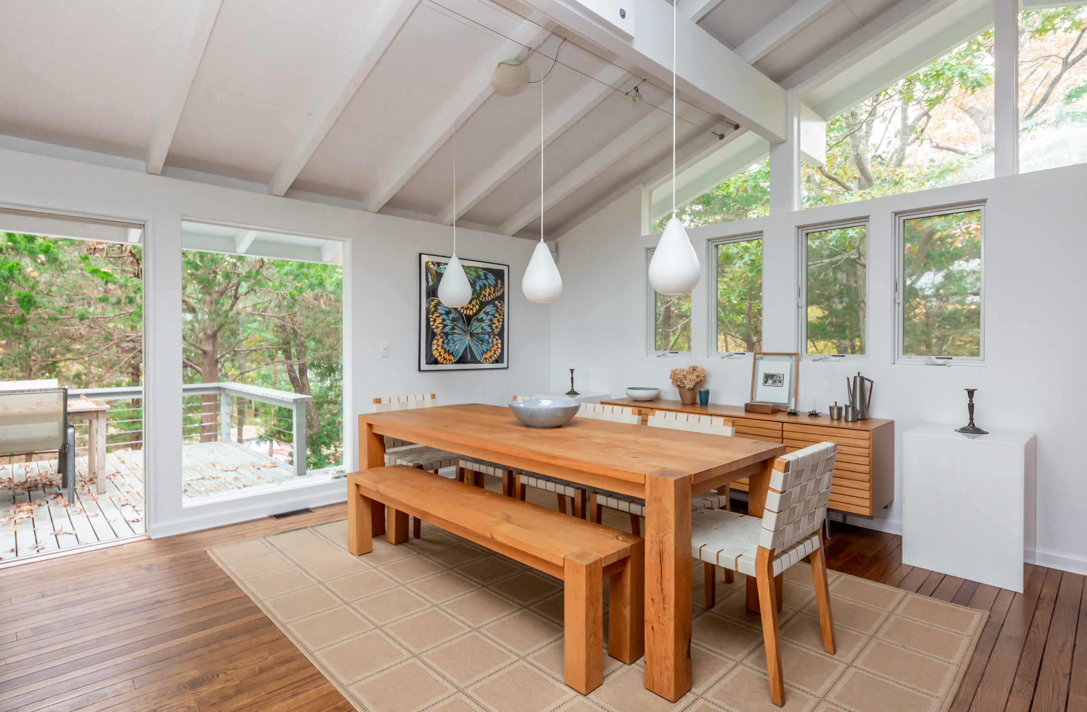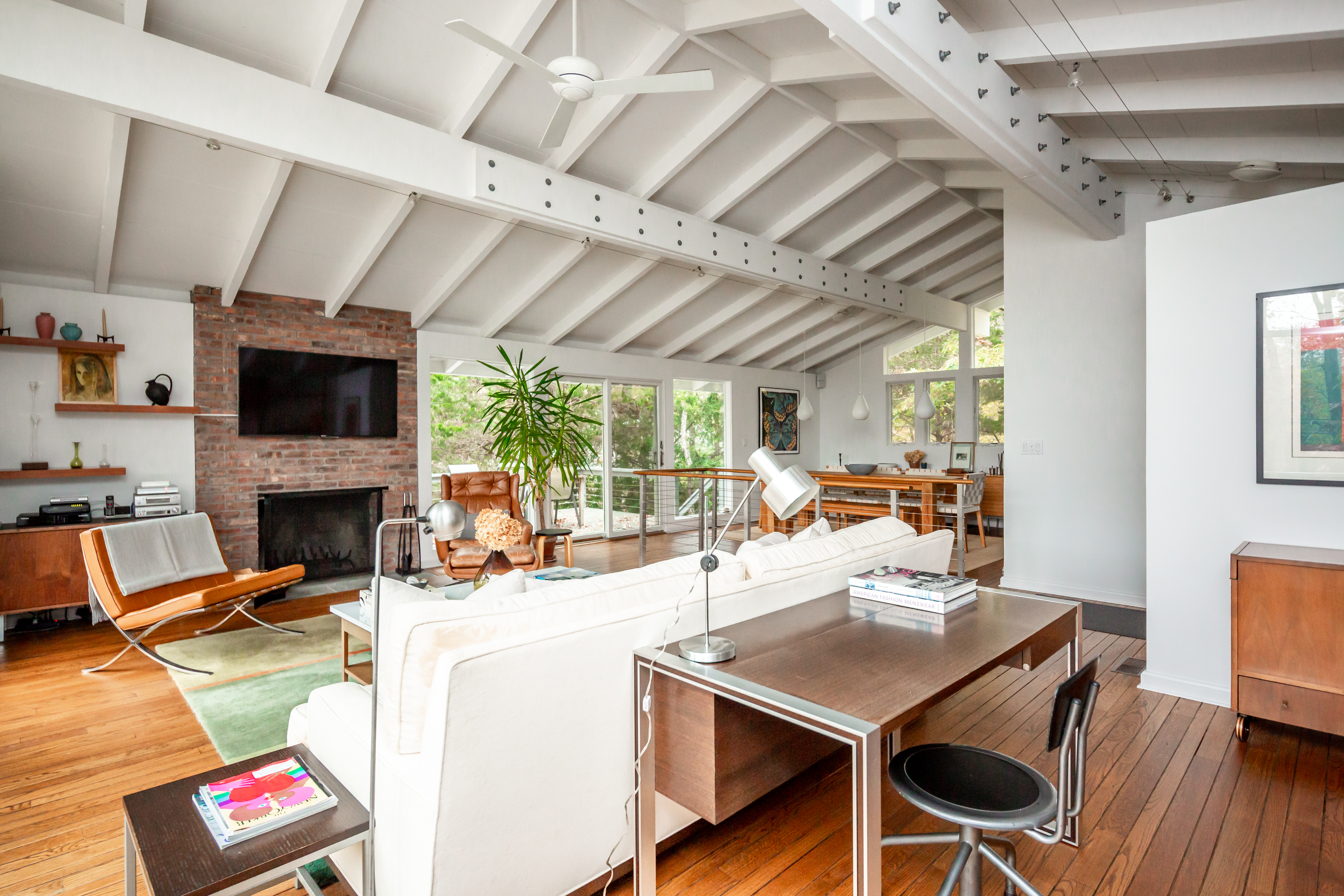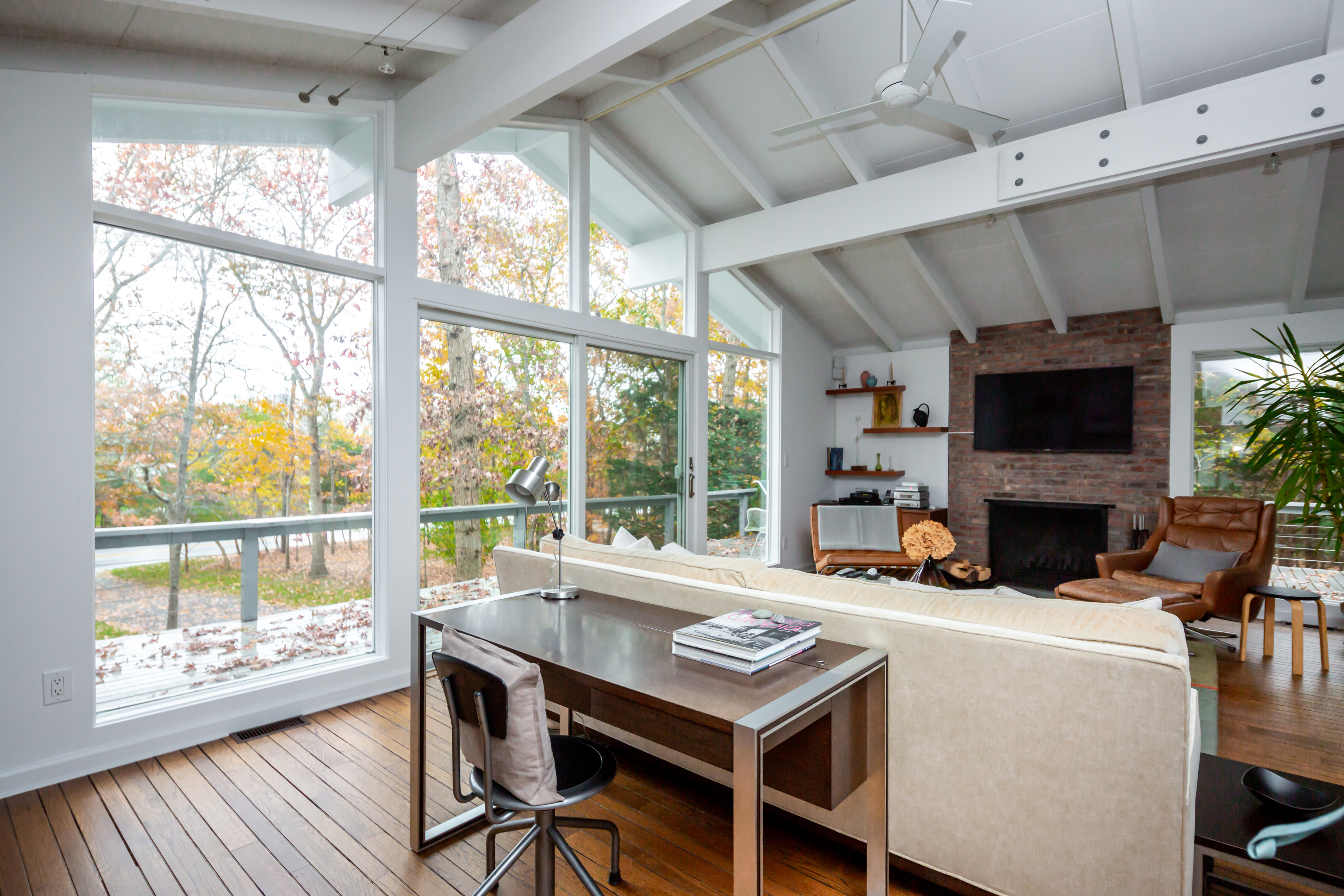 This pristine Mid-Century modern home was so tastefully renovated and furnished with the Bay just across the street and wrap around porch on the second floor. Open Living on Second floor with Floor to Ceiling windows and 2 sets of sliding glass doors. Just outside the historic district of Springs this home is located just minutes from the beautiful bay beaches of Gerard Drive & Maidstone. Three bedrooms and 2 baths set on .80 acre, this is the perfect summer rental. [[Rental Registration # 24-102]]