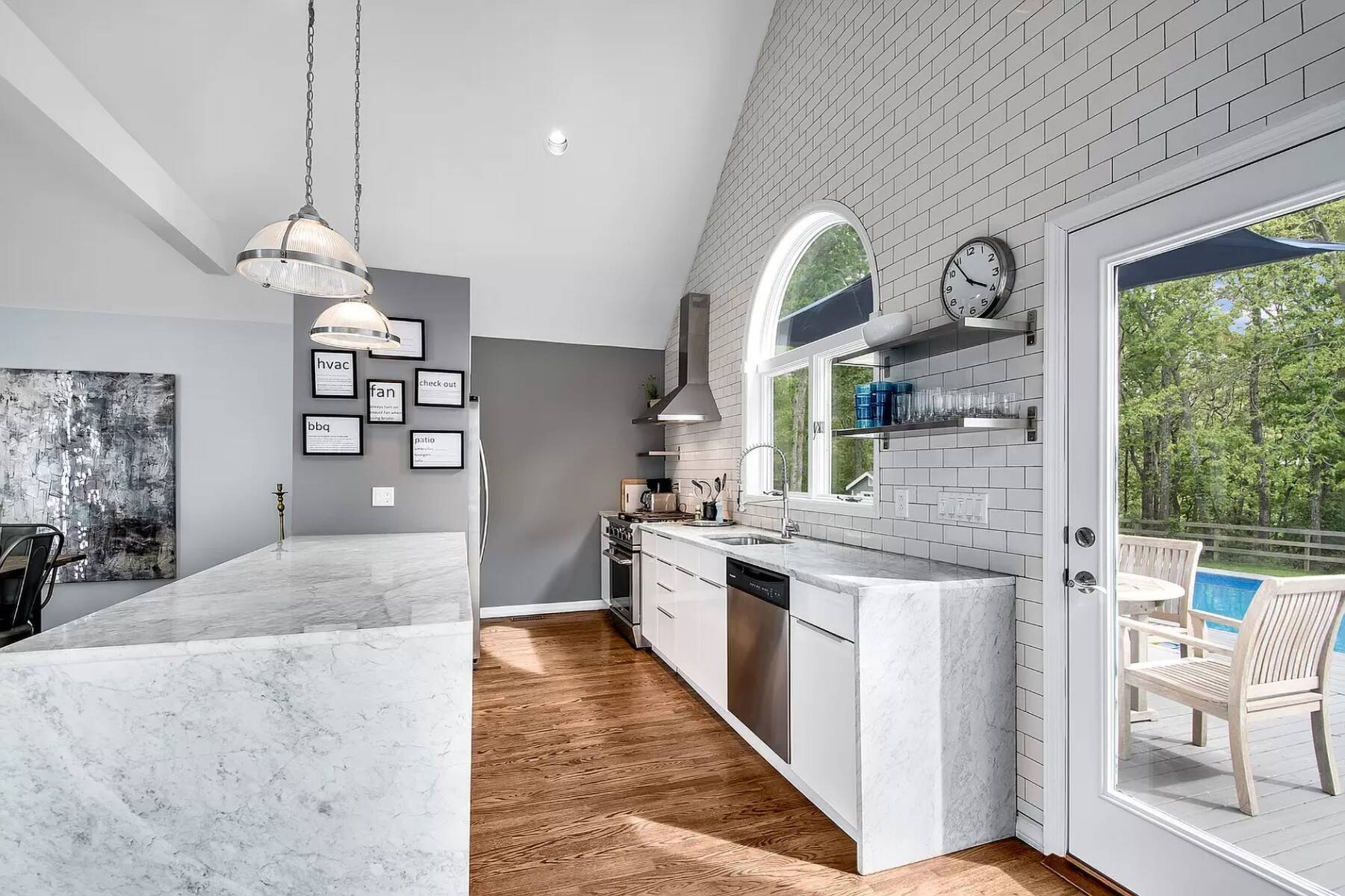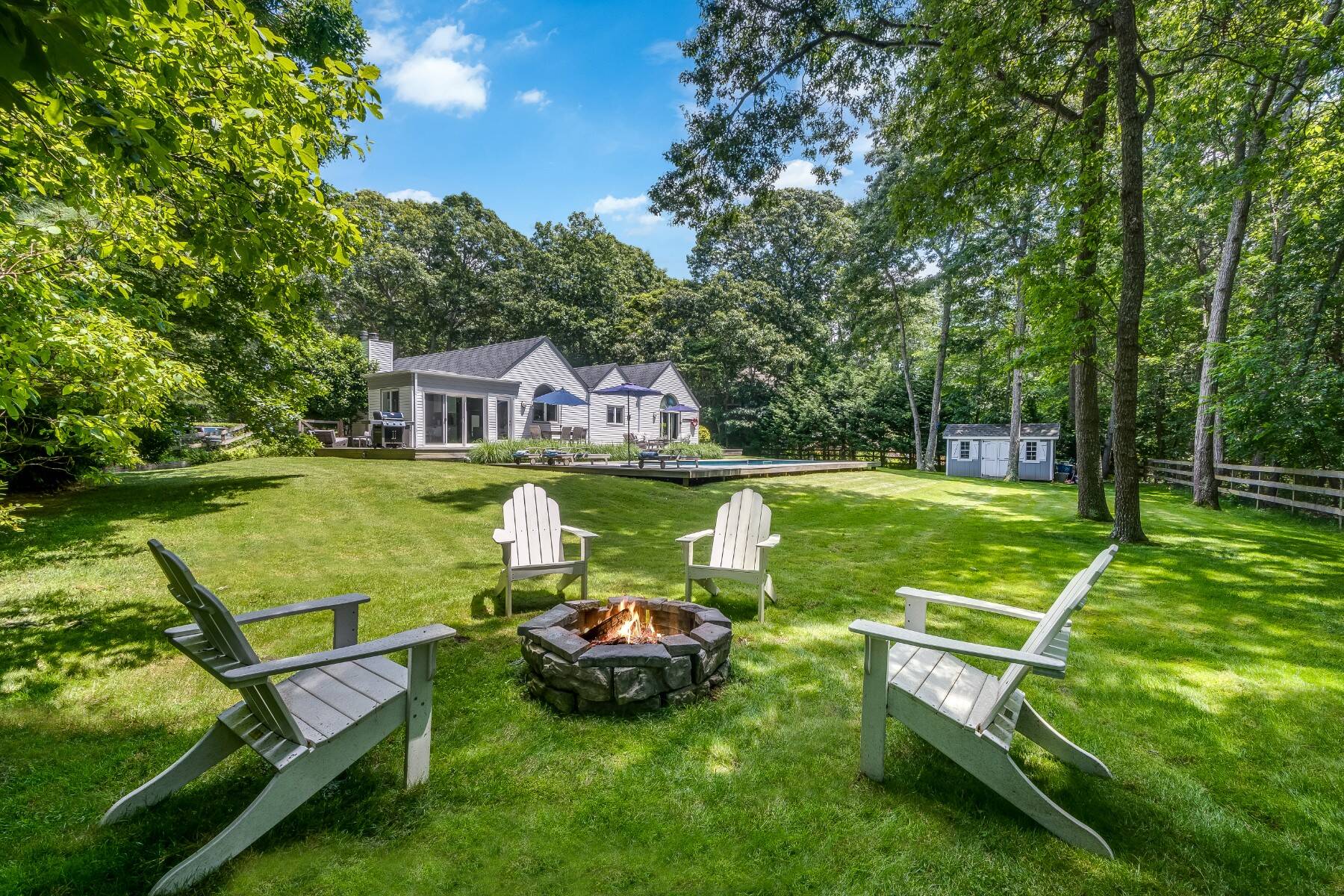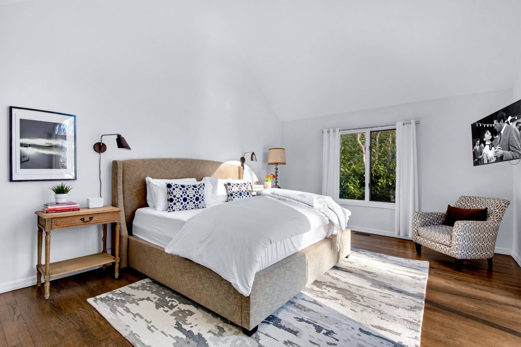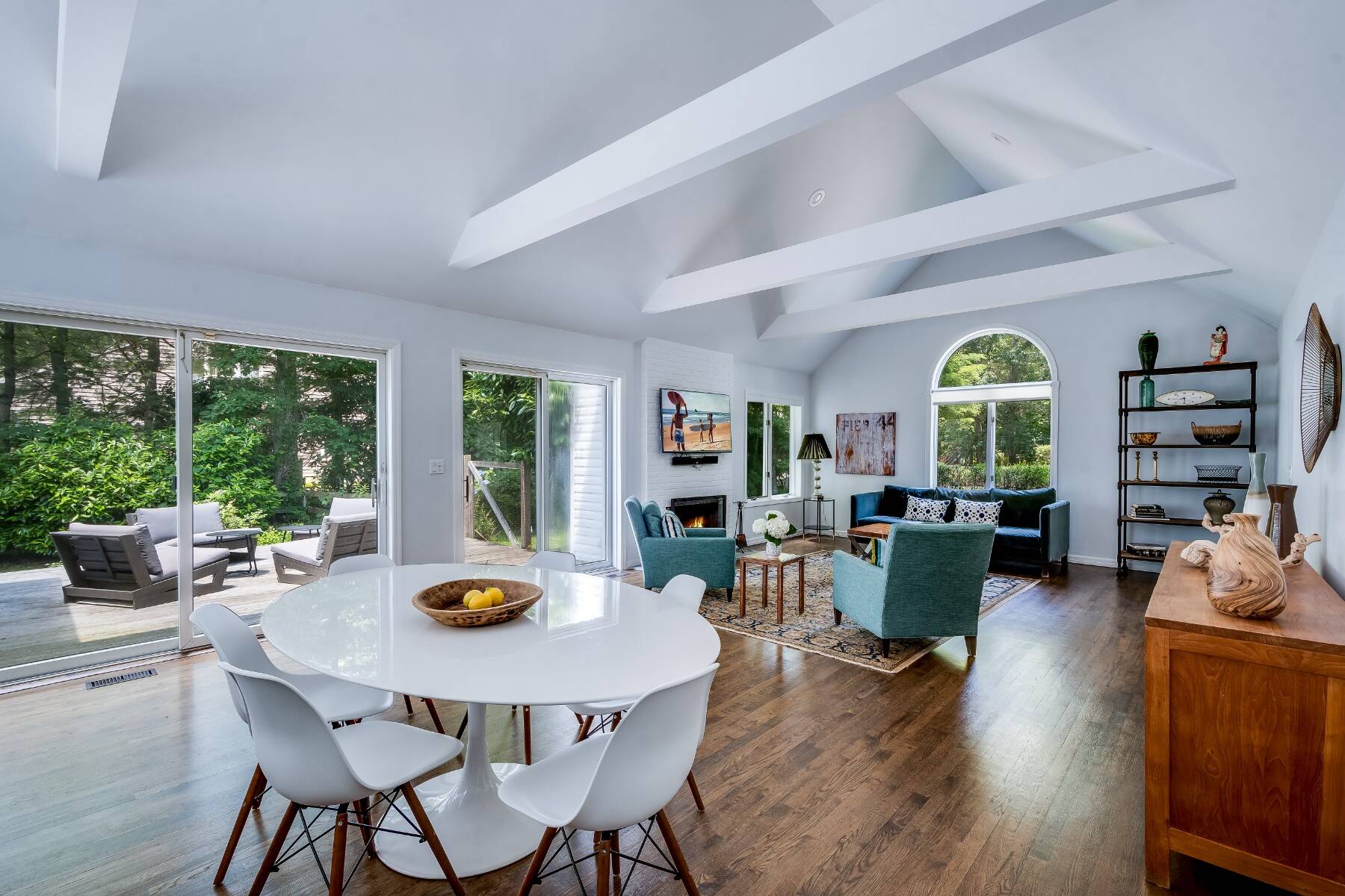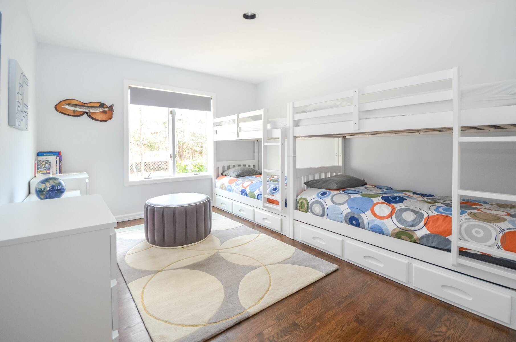 Bright and open home offers an inviting living space complimented by vaulted ceilings over sized windows and sliding glass doors. A perfect environment for socializing and gathering. The home is designer decorated with a mix of contemporary and country farmhouse beachy furnishings. Muted greys & blues are found throughout the home. The centrally air conditioned home features an open concept with the kitchen opening up to the living room and dining area. Professional appliances and every imaginable kitchen gadget needed for a gourmet chef. The Carrera marble island is a perfect gathering spot for morning coffee. There is a farm table with seating for 8. Each of the bedrooms has comfy beds with brand new linens including comforters with 100% high thread count cotton duvet covers. The home is supplied with bath towels and separate pool towels. There is a lower level media room for watching your favorite movie and huge indoor recreation area that includes a hockey/soccer rink and some toys. Step out of the sliding backdoors onto a deck which overlooks the pool. The backyard of the home looks onto a private 50 acre reserve where you will find running and hiking trails. The deck is well equipped with dining areas, seating, lounge chairs and gas BBQ. Additional accessories will include beach chairs, umbrellas and coolers for beach. 3 bedrooms , 3 bathrooms Finished Basement with TV room/Playroom/Hockey Soccer Rink Open kitchen/living/dining space with vaulted ceilings Bright open sunny home Fully equipped gourmet kitchen Central A/C Heated Natural Salt Water Pool Located on quiet cul de sac in private community 4 miles to Ocean Beach 2 miles to downtown Bridgehampton 3 miles to downtown Sag Harbor Keyless Entry System Private VIP Concierge Services Available during Summer Season Bedroom One: King Bed with ensuite bathroom Bedroom Two: Queen Bed with shared bathroom Bedroom Three: Two sets of bunkbeds, four twin beds with shared bathroom. [[Rental Registration # RP230214]]