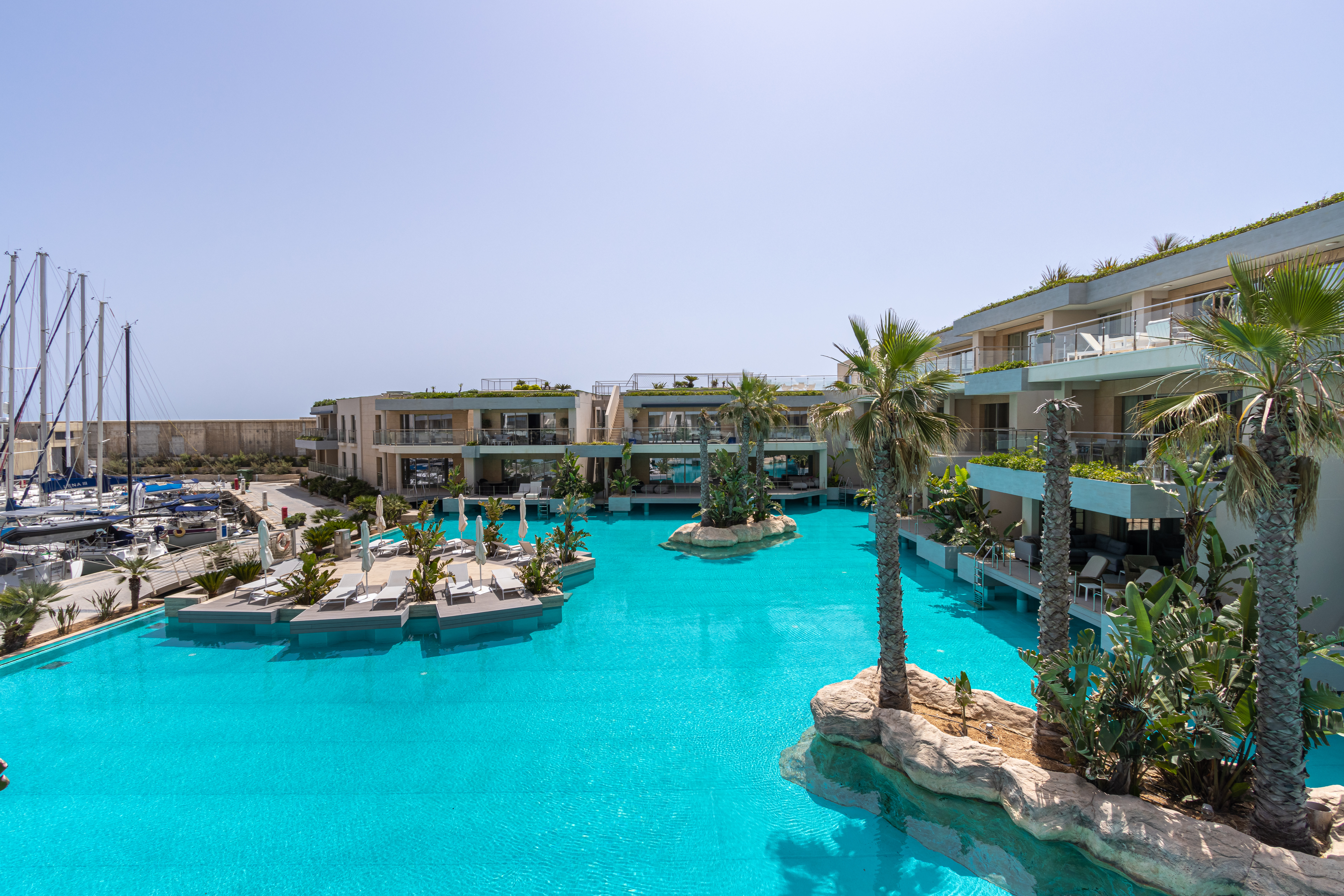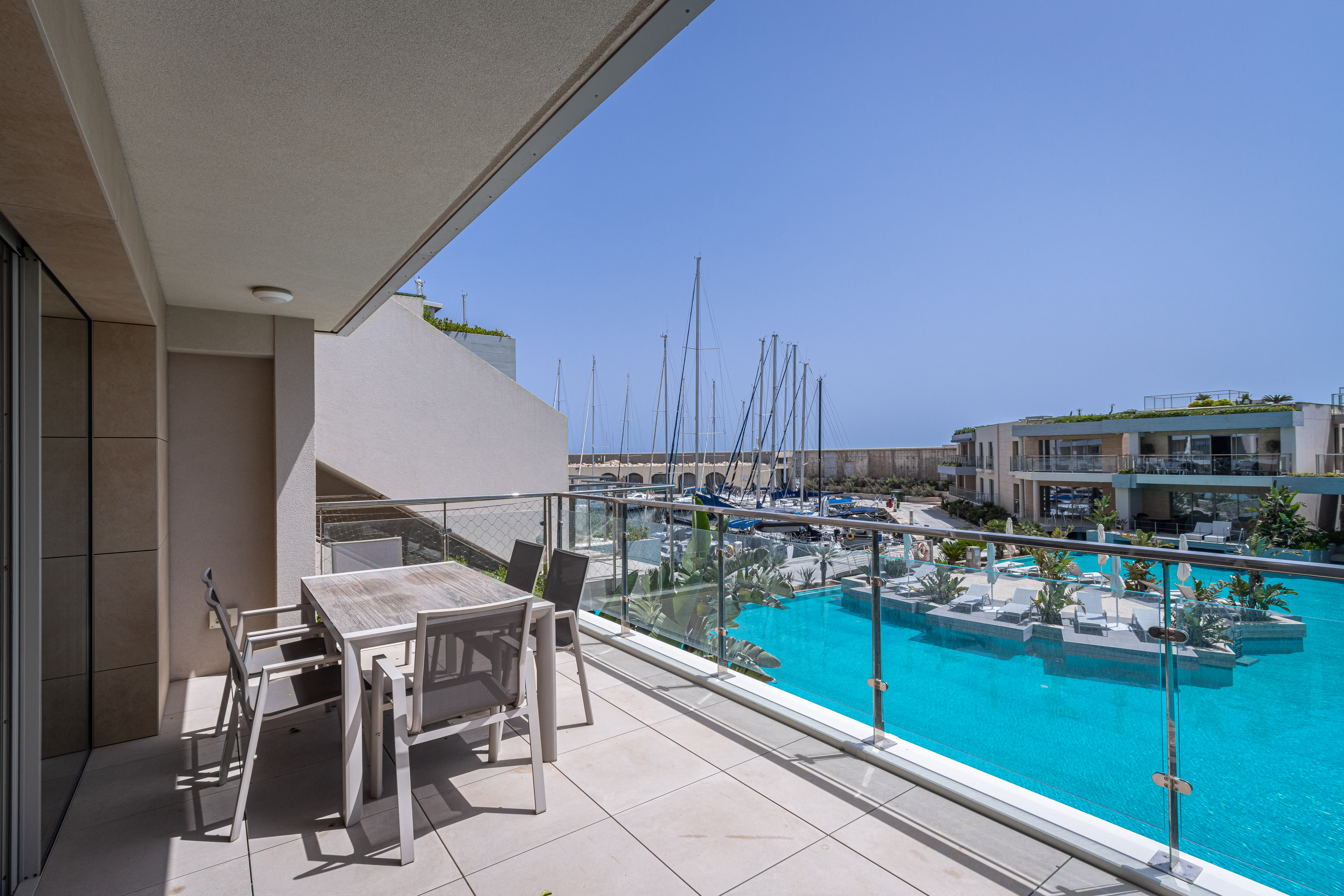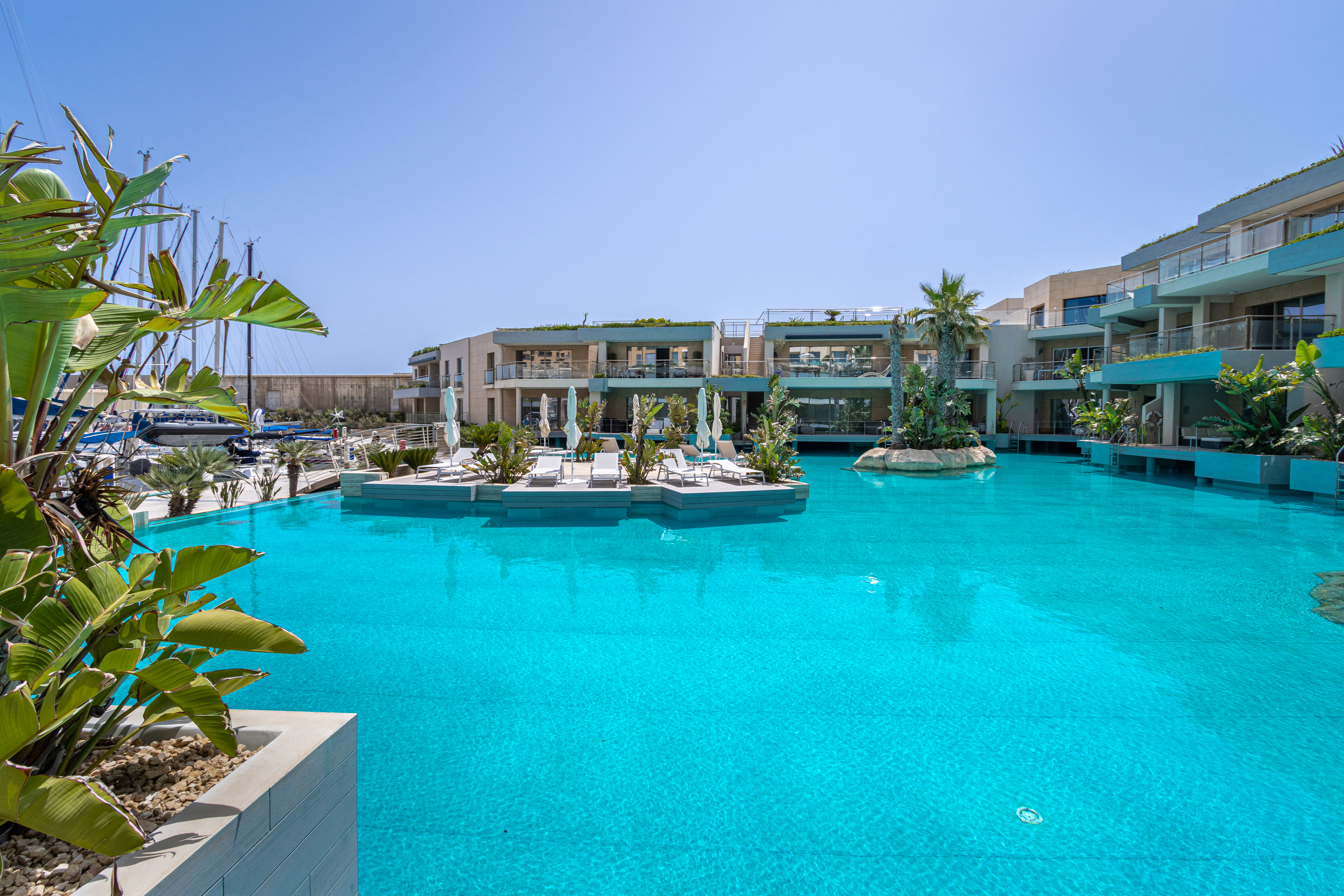 A modern, luxuriously finished, and fully furnished, two bedroom 166 sqm waterfront apartment in the new and unique Laguna development in Portomaso. This development is an extension of the Portomaso residential development, located adjacent to the existing marina and the sea. Here one can enjoy the private residential lagoon with direct access from your private deck from each apartment and swim out into the lagoon. Set on the second floor the layout comprises a welcoming entrance hall, washroom and guest WC, a modern fitted and fully equipped kitchen, which leads onto a bright and airy spacious open plan living and dining area opening onto an 18 sqm front terrace overlooking the Laguna, perfect for sundowners and outdoor entertaining. The sleeping quarters comprise two double bedrooms both with en-suite facilities. Other amenities include Parquet flooring in bedrooms and underfloor heating throughout, gypsum soffiting, and concealed air-conditioning. Also included is a 1 car space. Ideal for a couple.