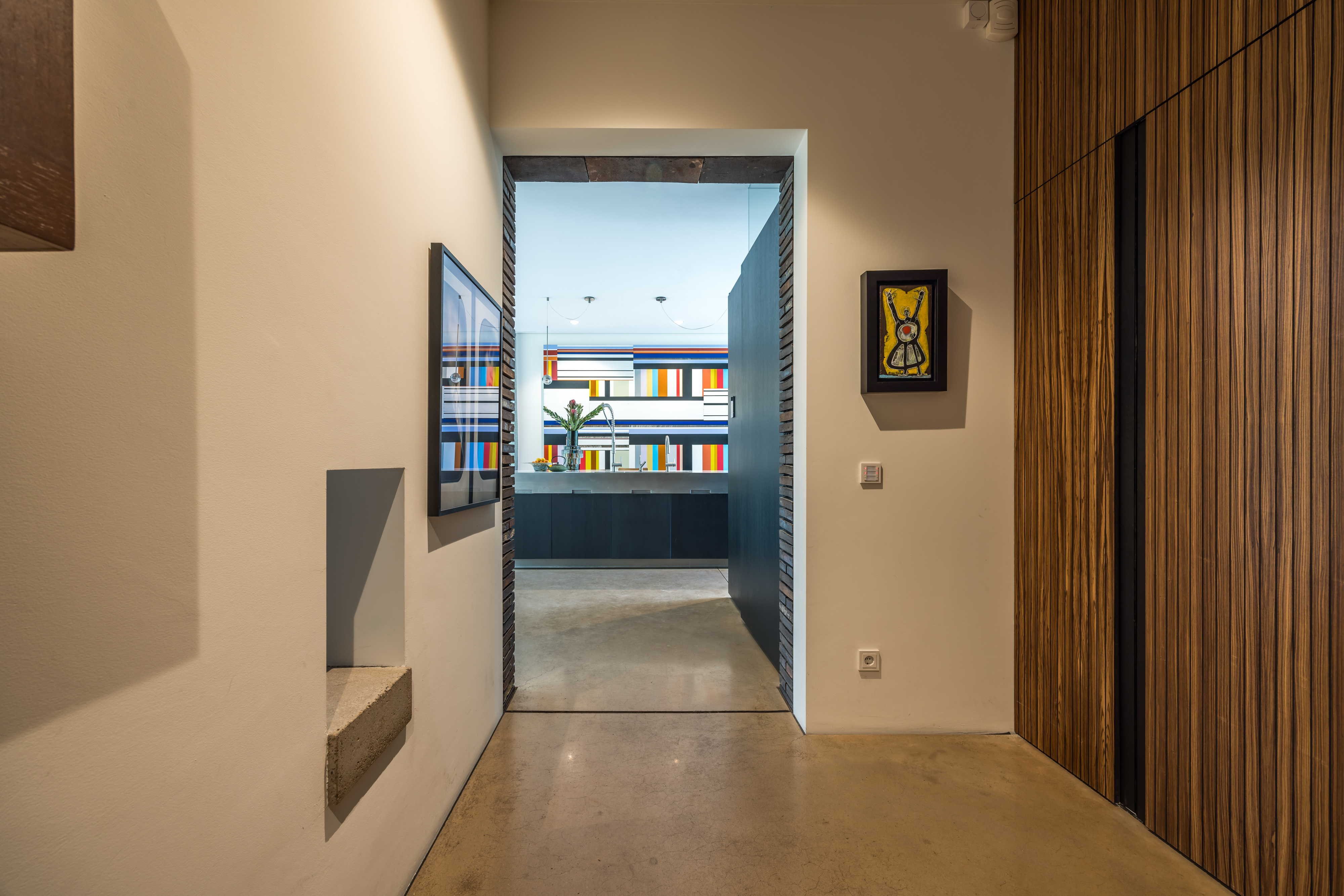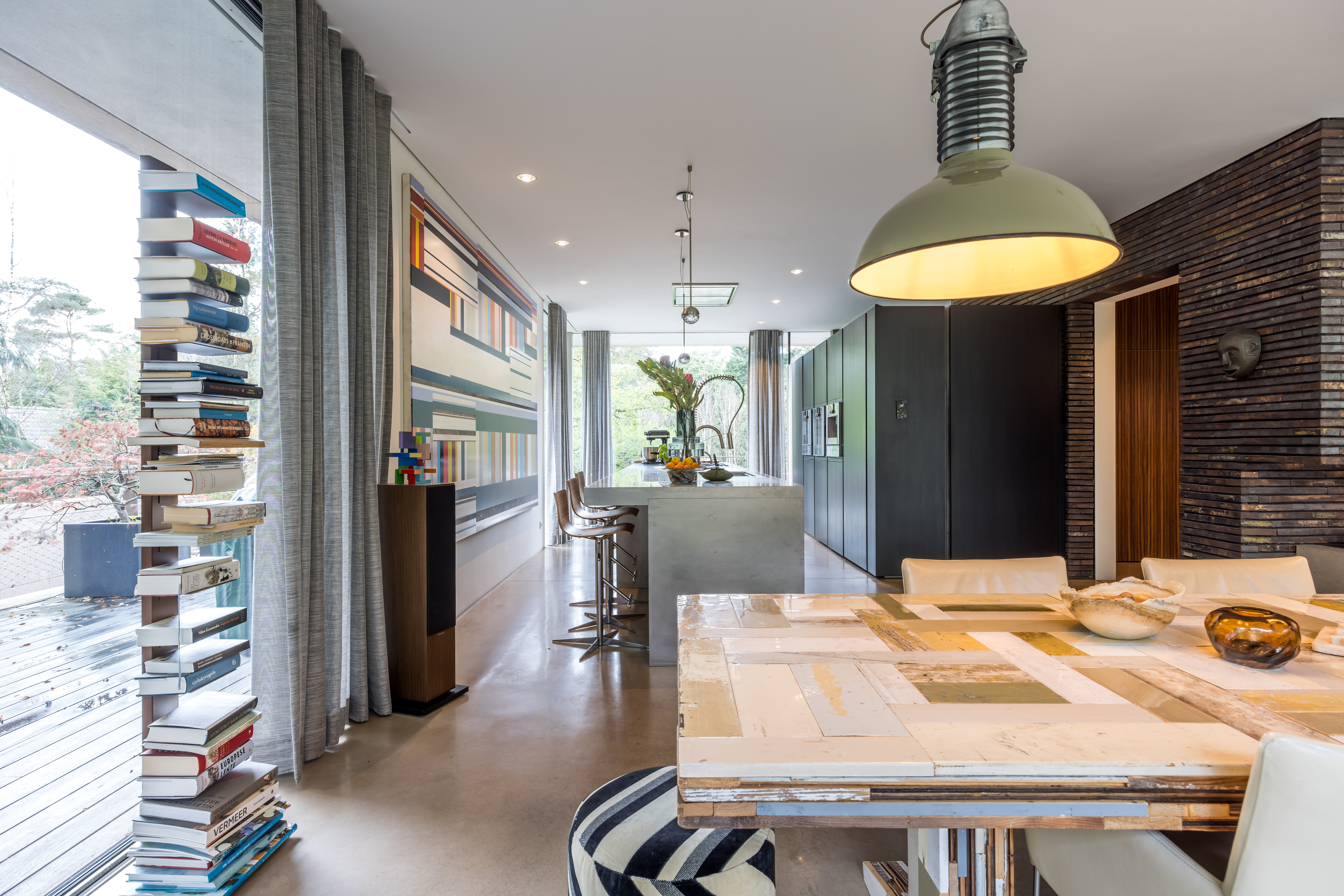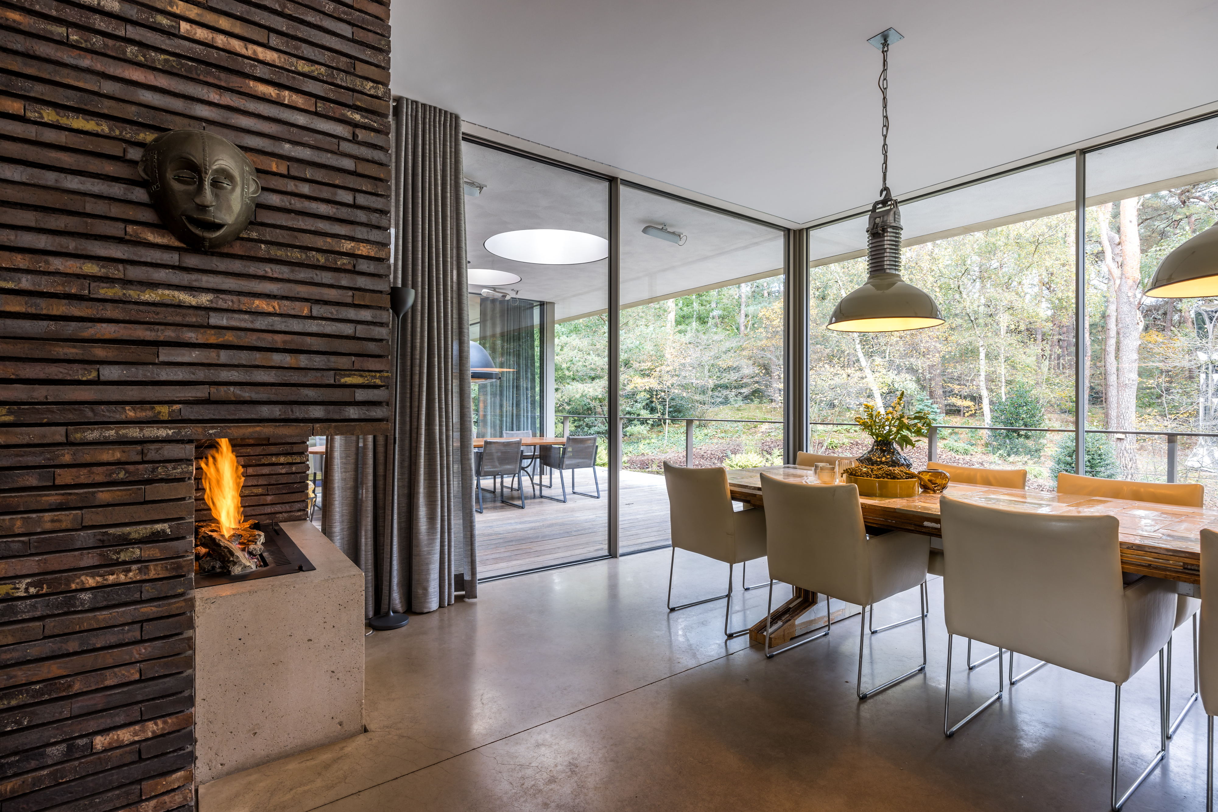 First Floor: The expansive living room and kitchen, offering breathtaking views of the forest garden, are perfect for relaxation or entertaining. An acoustic ceiling, also applied in the pool area, enhances the serene ambiance. A unique Piet Hein Eek-designed library, featuring glass shelves among birch trunks, adjoins the office space.