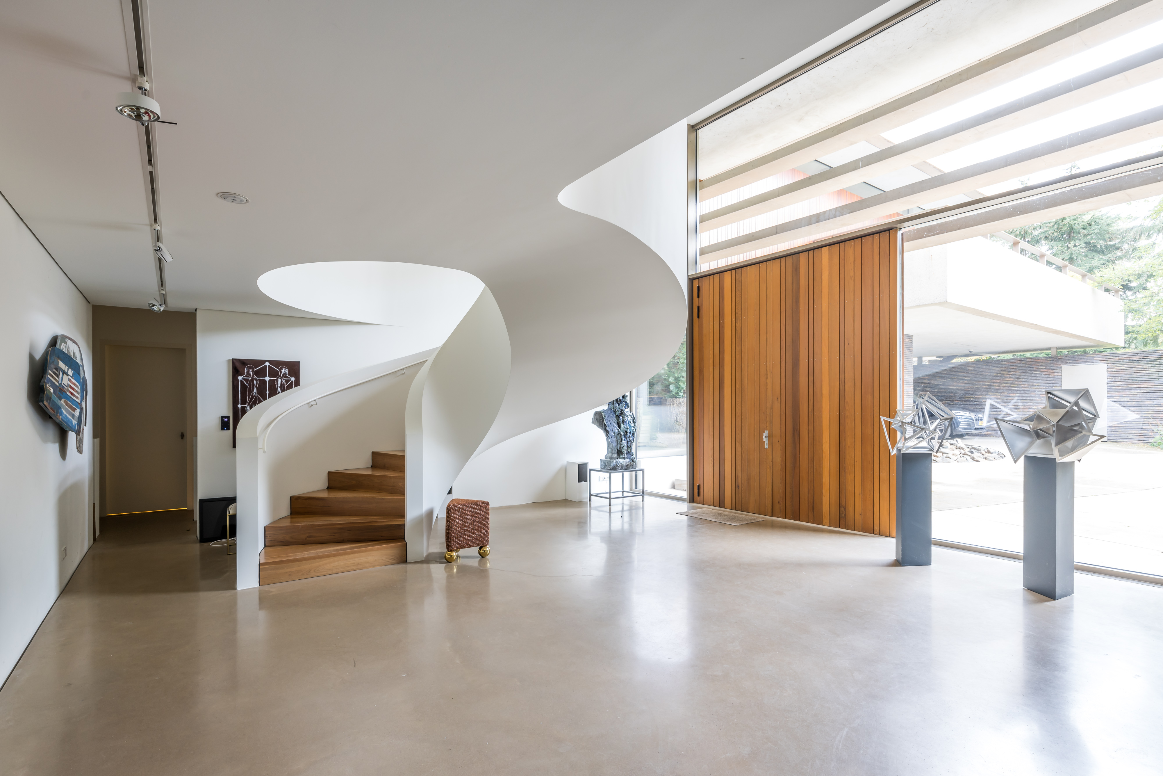 Ground Floor: Passing through the entrance gate, you are welcomed by views of the villa and beautiful pond, discreetly hidden from passers-by by rhododendrons, birches, and acacias. The entrance hall, featuring a sculptural staircase, is designed to also serve as an exhibition space. On the left are three luxurious bedrooms with two bathrooms overlooking the beautifully landscaped garden. To the right, there is a laundry and ironing room with a pantry. The spacious wellness pool, with large sliding glass doors, offers views of the forest garden and can, when open, create an outdoor pool feel. The large garage accommodates three cars.