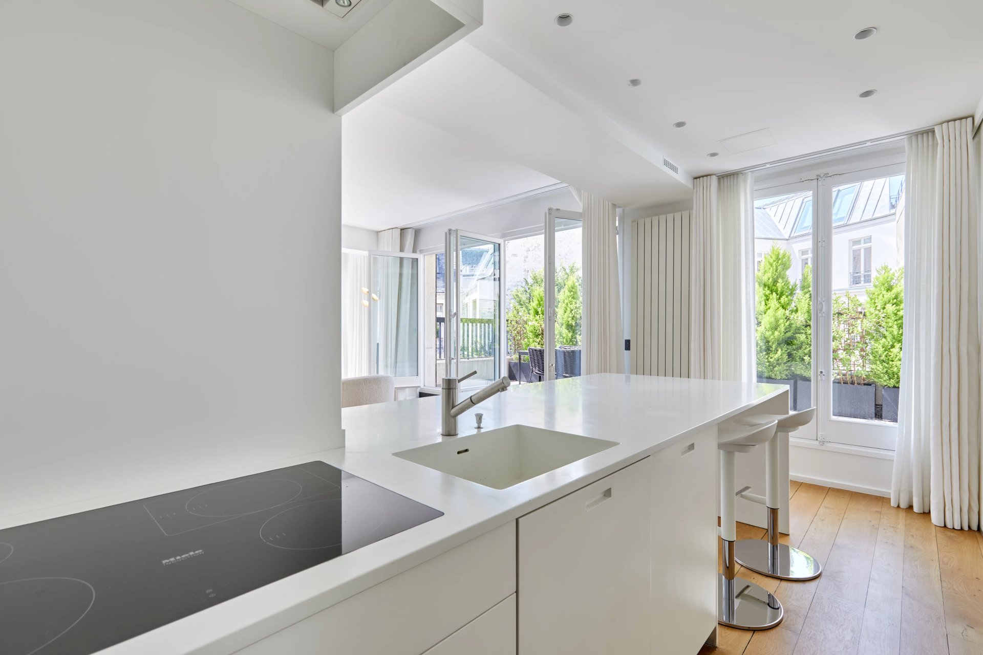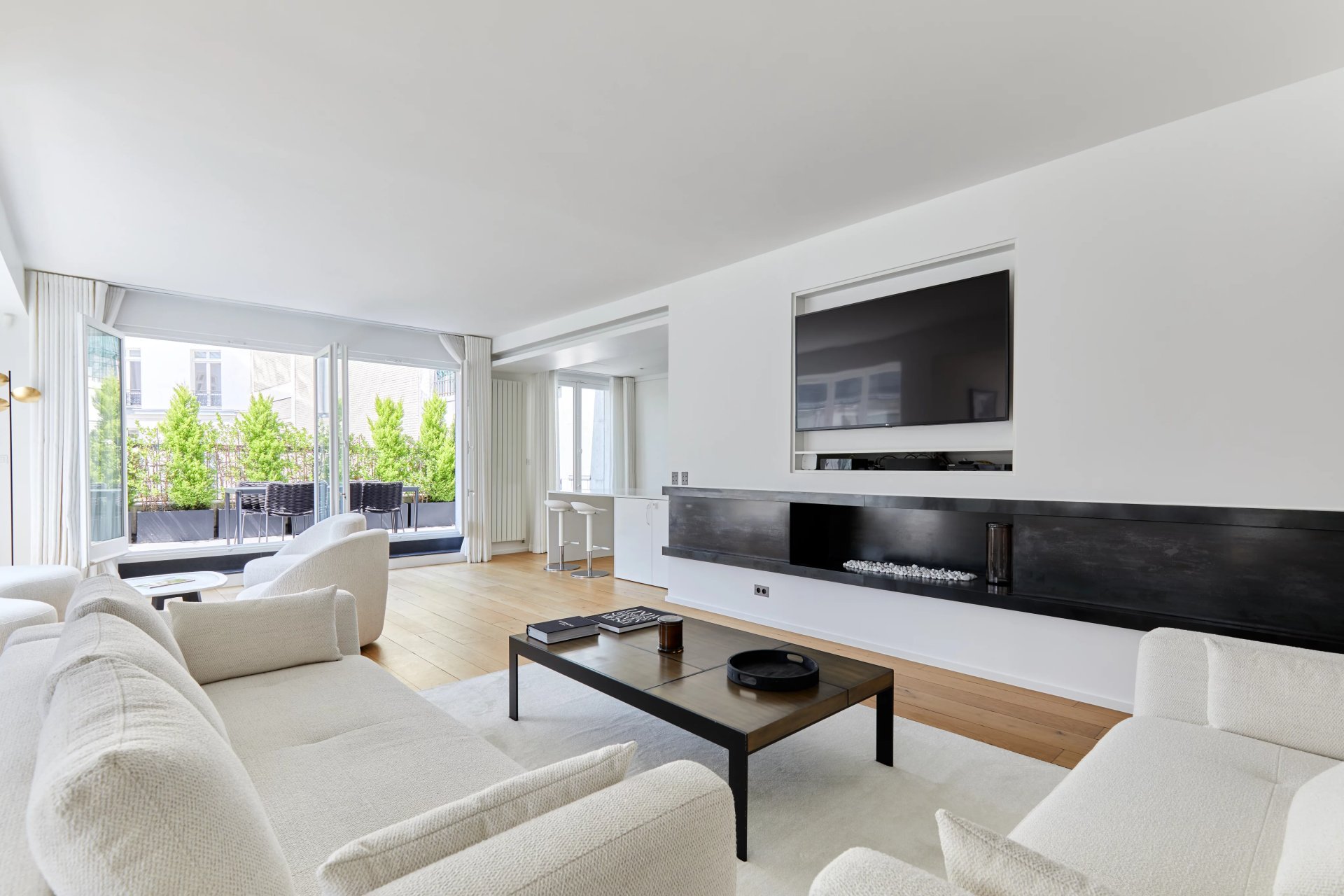It includes a double living/reception room opening onto a terrace, a fitted and equipped kitchen, a master suite with a bathroom and dressing room, two further bedrooms, a shower room, two separate wc and fitted closets.