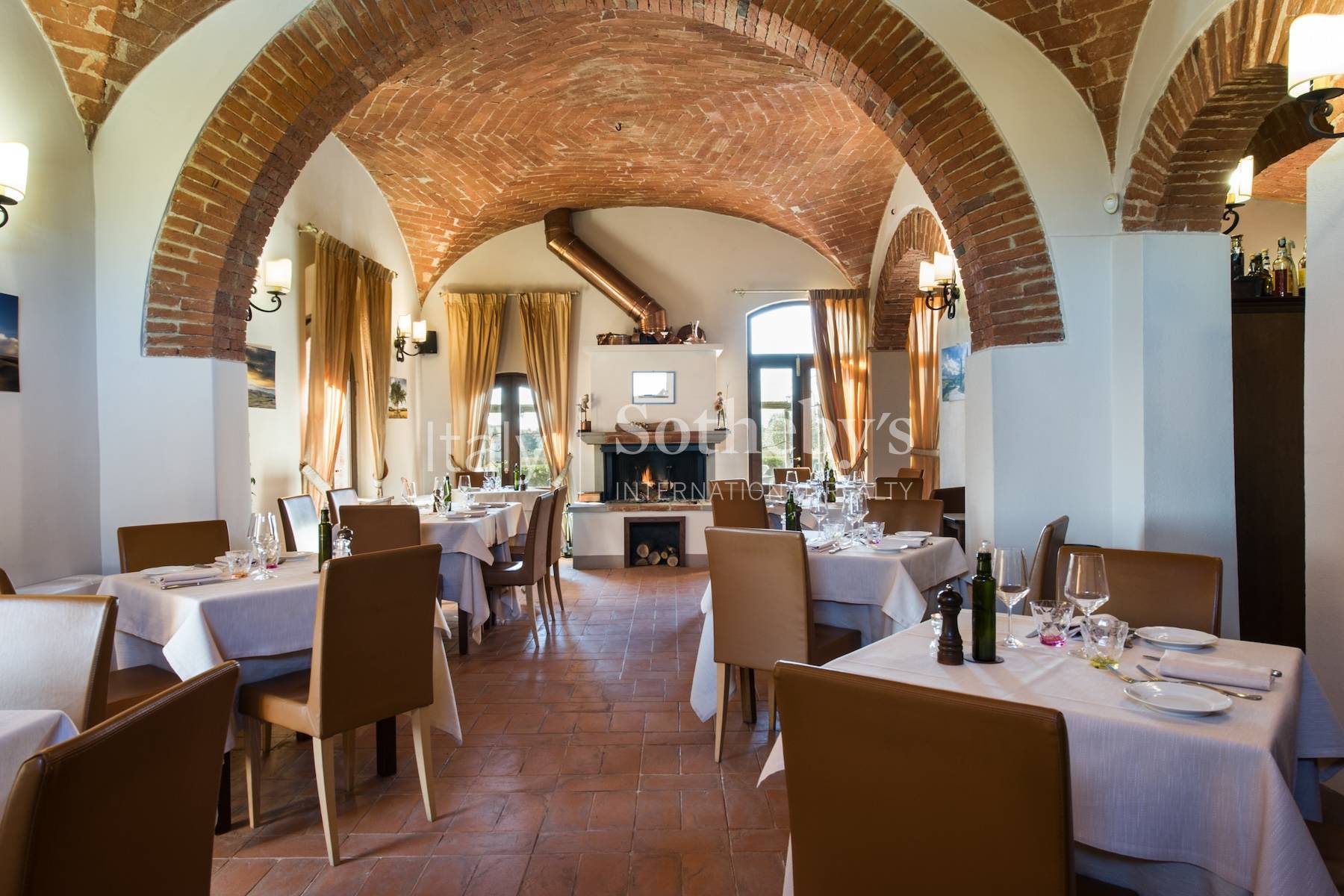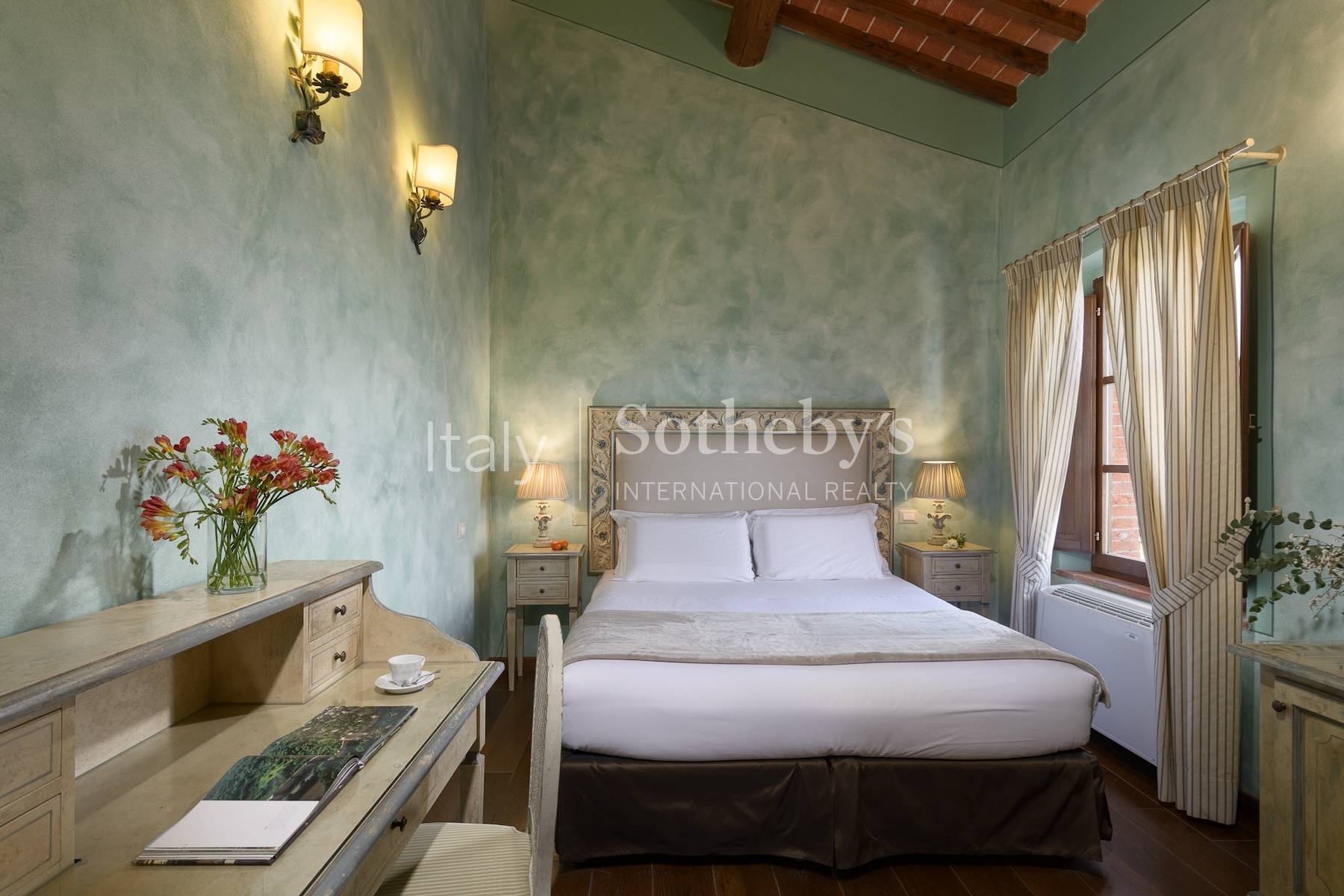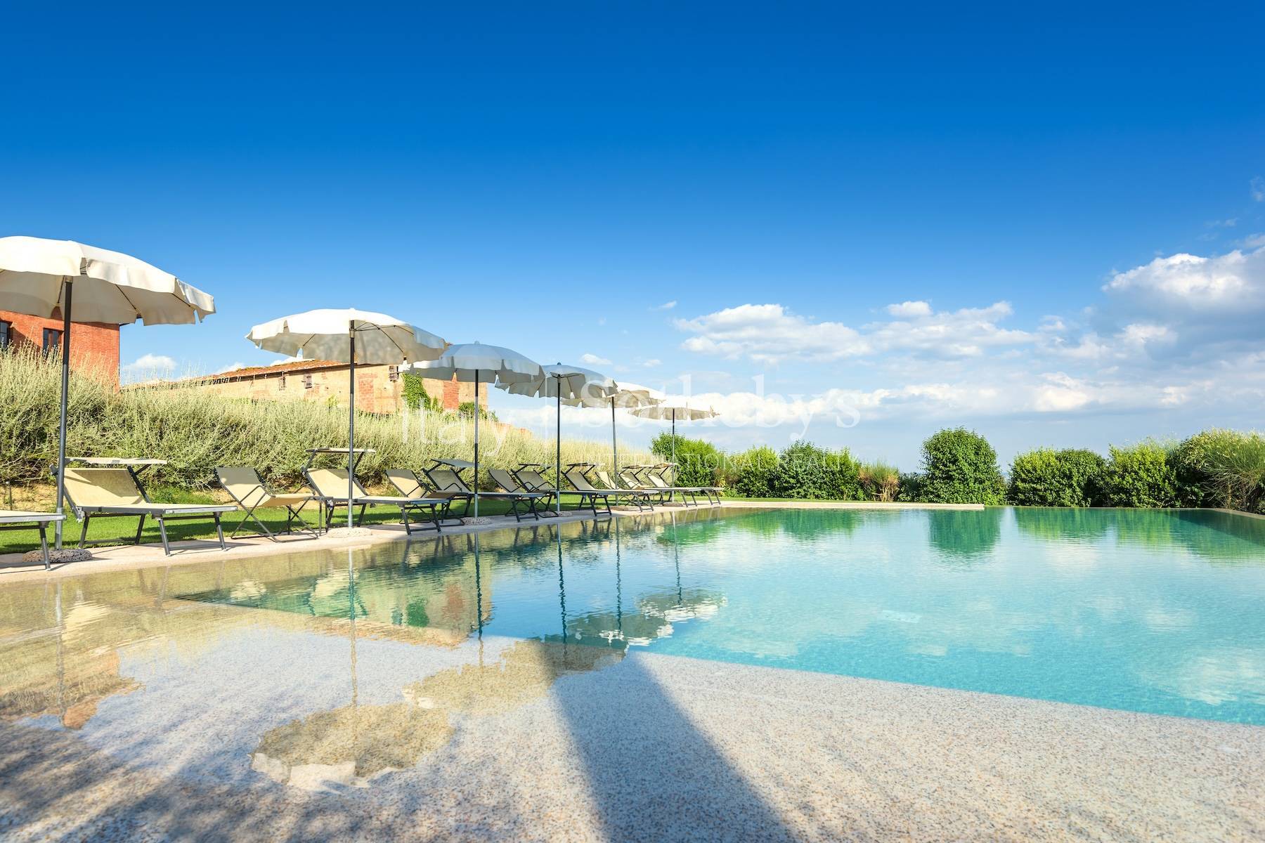 Set in the heart of the stunning Sienese countryside, between the charming towns of Montepulciano and Torrita di Siena, this magnificent Leopoldine villa offers a rare opportunity to acquire a prestigious estate with timeless appeal. The property spans approximately 900 sq.m. and consists of multiple buildings, harmoniously blending historical charm with modern comfort. The main villa, meticulously restored in 2009, currently houses an elegant restaurant and six refined suites. The ground floor is entirely dedicated to dining, featuring a bright and spacious dining room that accommodates up to forty guests, guest restrooms, and a fully equipped professional kitchen with a dedicated service area. Outside, a beautiful terracotta-tiled terrace overlooks the manicured garden, which boasts a beautiful swimming pool and shaded pergolas-perfect for relaxing on warm summer days or enjoying delightful al fresco dining. An external staircase leads to the upper floor, where a grand central hall connects to five generously sized bedrooms, each with an en-suite bathroom. From the hall, an internal staircase ascends to the picturesque dovecote, which has been transformed into an enchanting bedroom with a private bathroom and garden views. The property also includes a 294-sq.m. historic tobacco barn, which requires complete restoration but holds great potential for conversion into a guesthouse with four independent apartments. Additionally, a former pigsty, currently used as a storage space, offers further possibilities for guest accommodations. Surrounded by approximately 3,200 sq.m. of beautifully landscaped gardens, adorned with flowers and ornamental plants, the estate also provides two convenient guest parking areas. The property is completed by 3.4 ha of agricultural land, offering the ideal conditions for planting a vineyard and producing a refined private-label wine.