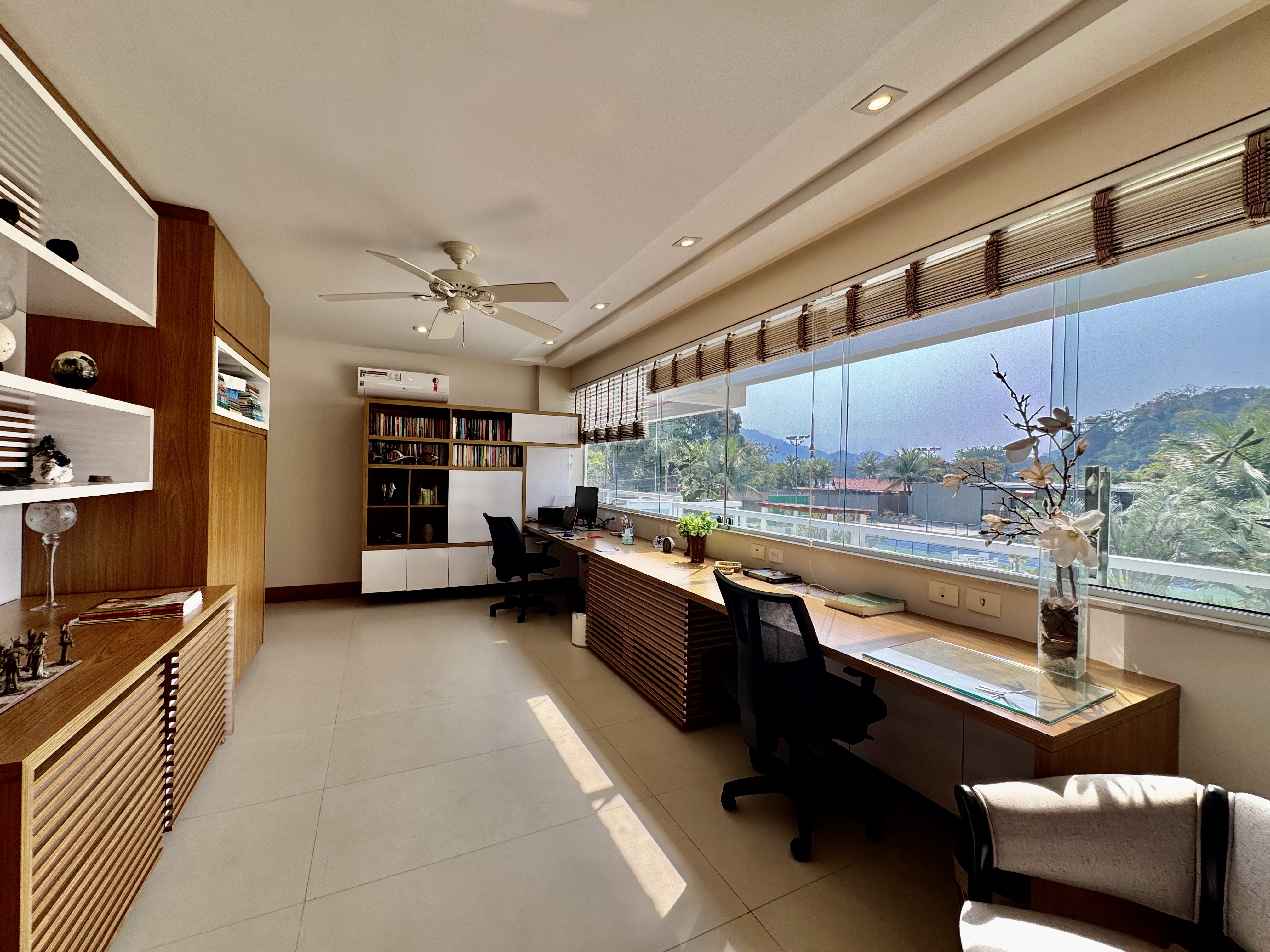 Set along one of the most desirable navigable canals in Angra dos Reis, this exceptional property combines comfort, entertainment, and complete infrastructure across a lush and thoughtfully landscaped plot. The residence features eight air-conditioned suites, including a 495 sq. ft. master suite with walk-in closet and a private balcony overlooking the canal. The spacious social area includes integrated, climate-controlled living and dining rooms, along with a home theater equipped with a 60-inch TV. An indoor gourmet space, also climate-controlled, is fitted with a pizza oven, gas and charcoal barbecues, crepe machine, and freezer. The covered veranda opens to an outdoor leisure area with a heated pool, spa with hydromassage, sauna, and multiple lounge spaces designed for relaxation. Additional highlights include a professional tennis court with lighting and a multi-use field for beach tennis, soccer, or volleyball. To host with ease, the outdoor gourmet kitchen offers a wood-burning stove, pizza oven, barbecue, and a large dining table. The leisure structure also features a game room with official billiards table, darts, sound system, and a restroom. A detached guest chalet includes a cozy living room, kitchen, and two bedrooms sharing a bathroom. The waterfront deck with floating dock accommodates vessels up to 70 feet, and includes a covered boat ramp with an 8-meter beam and an 8-ton winch. The property also offers garage space for eight vehicles, a 70kVA generator, and solar panels. Fruit trees attract birds that enrich the natural atmosphere, with accommodations for up to 16 guests in the main house and four more in the chalet. Located within Porto Bracuhy—a privileged, gated community nestled between the sea and the Atlantic Forest—the home benefits from deep, navigable canals unique to Brazil. The condominium offers 24-hour security, surveillance system, bike path, private beach, local shops, beauty salon, restaurants, and both dry and wet marinas. Landscaped public areas and gardens create an ideal setting for walking, sports, and enjoying nature.