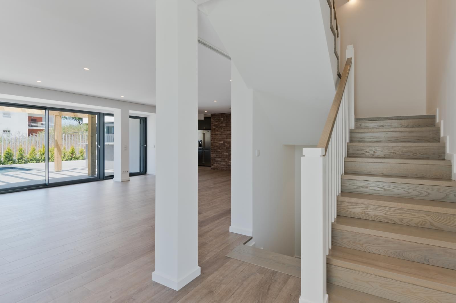 5+1 bedroom villa, of contemporary architecture, located in a quiet area of Carnaxide.This villa is implanted in an 828 sqm lot, with a 300 sqm private gross area, in Vila Utopia.Villa without furniture, with garden and private swimming pool, with an excellent South/West sun exposure, distributed by 3 floors, as follows:Ground Floor (prepared for persons with reduced mobility):- Bedroom: 17.58 sqm with wardrobe and with direct access to the swimming pool and living room- social bathroom: 3,92 sqm - Living room: 66.52 sqm with a gas fireplace and direct access to the swiming pool and barbecue- Fully equipped kitchen: 20.28 sqm in open space with the living room- Laundry area: 4.82 sqm with direct access to the terrace and garden- Outdoor area with swimming pool and a leisure area under a pergola with an electrical awning, garden, barbecue area, with an "Argentina" wood burning barbecue, a gas barbecue, sink, refrigerator and storage area, under a pergola.First Floor:- Master suite: 23.16 sqm with a walk in closet and a 10.93 sqm bathroom with electrical towel rail- Suite: 17.50 sqm with wardrobes and direct access to the terrace, supported by a 5.34 sqm bathroom - Bedroom: 12.70 sqm with wardrobes and direct access to a balcony - Bedroom: 13.09 sqm with wardrobes and direct access to a balcony - Support bathroom: 5 sqmFloor -1:- Bedroom: 15.48 sqm with wardrobe and direct access to a 6.17 sqm patio - Technical equipment and machinery room- Garage box with storage area - Small storage areaThis villa stands out for its modern lines, creating a harmony between the interior and exterior. Large dimensioned window spans provide plenty of natural light to the whole villa. Villa with excellent finishes and the highest quality materials, being equipped with a duct air conditioning system with a ventilation outlet in the ceiling in all the rooms, thermodynamic solar panels for water heating and and prepared for power supply, a garden with an automatic watering system in all its areas, domotics with control panels and remote control by mobile app. Control of interior/exterior lights; electrical blinds; air conditioning; video doorman (interaction is possible via mobile phone); gate for vehicles; exterior cameras; alarm connected to the central and police (interior and exterior motion sensors, as well as door sensors on all accesses to the house), flooring in Quick Step Laminate and Cinca, box garage for two cars prepared with 2 outlets for charging electrical cars.The maintenance of the garden and swiming pool is included in the rental value.2 km away from the airport and 14 km away from the best beaches of the line.It is within a maximum radius of 15 km from the following schools: PARK International School, the Spanish Institute "Giner de los Rios", Oeiras International School, Lycée Français Charles Lepierre, Saint Julian's School and 10 minutes away from the Oeiras Park shopping centre, with several shops, including cinemas, banks, pharmacy, hypermarket and restaurants.Vila Utopia is the first urban development of contemporary architecture, composed by exclusive single family villas, with good accesses to Lisbon, Cascais and shopping areas.