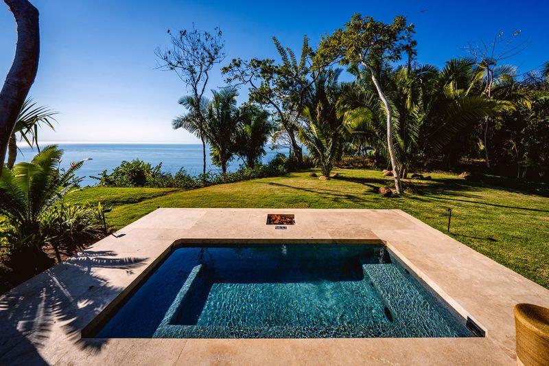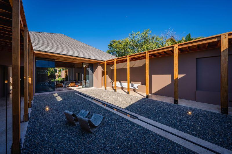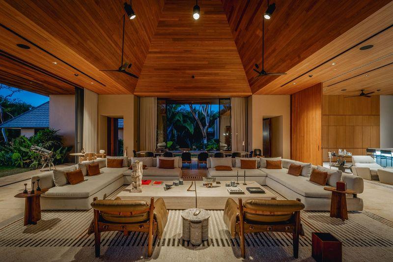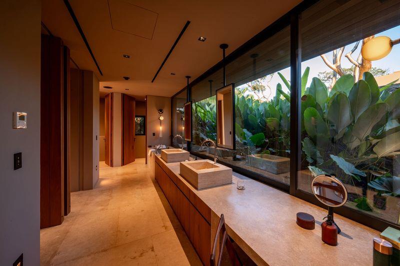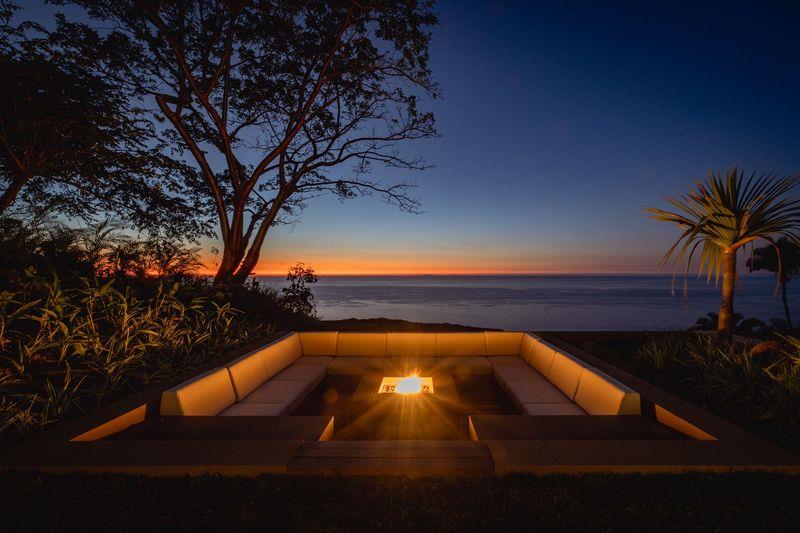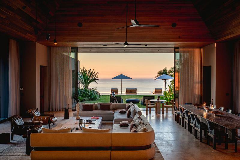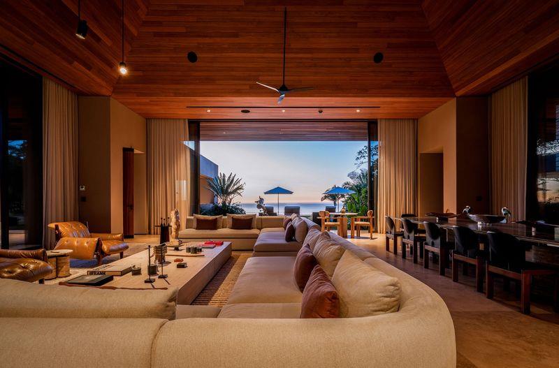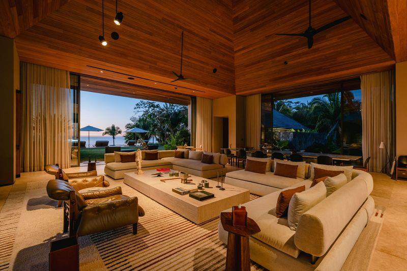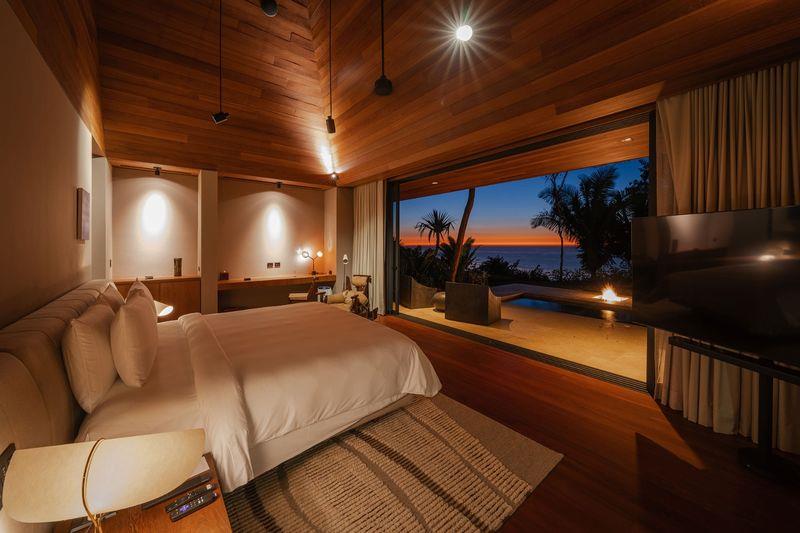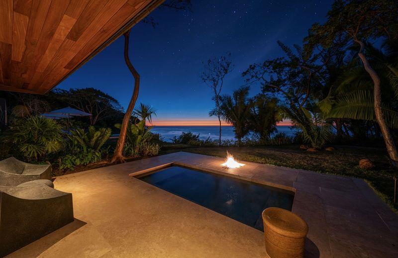 The property comprises seven thoughtfully designed bedrooms. Three master suites offer refined tropical luxury with private plunge pools, illuminated by discreet fire pits under palms and ancient Higuera trees—each space capturing the warm glow of a near-perpetual sunset. In a more intimate area beneath the main pool, three guest bedrooms provide quiet ocean views and direct access to a landscaped grass patio.