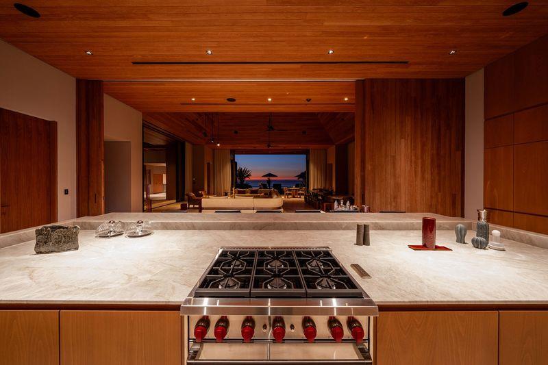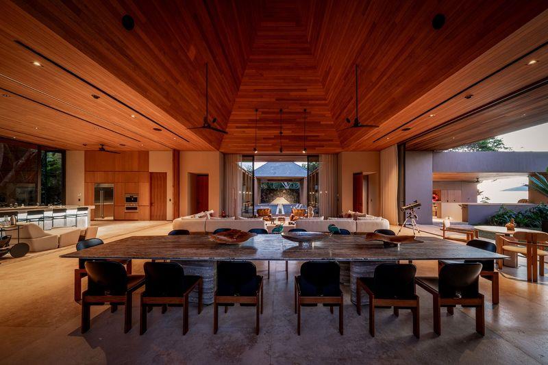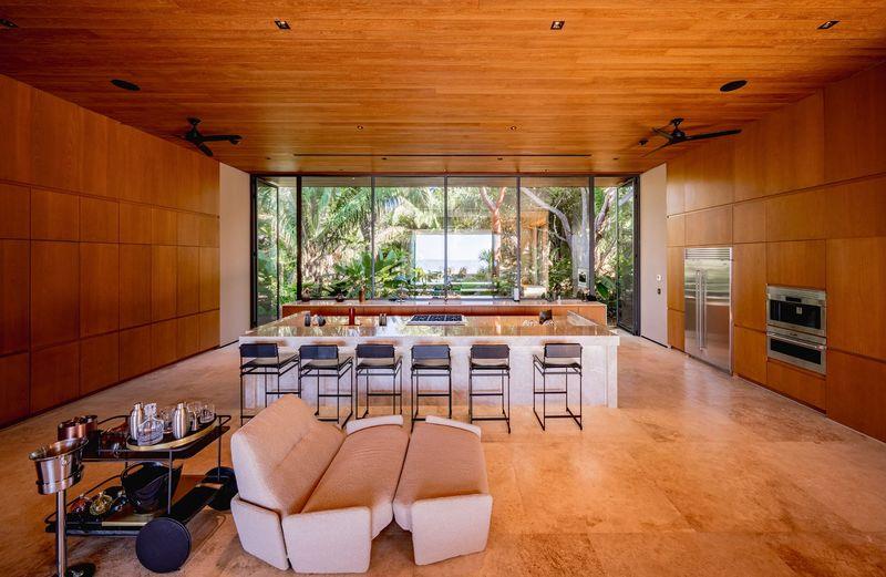 Every element of the villa is carefully considered. High ceilings and a continuous water feature direct movement across the courtyard into a secondary great room, while natural materials like wood and stone define a modern, minimalist aesthetic with a hint of brutalist refinement. The expansive gourmet kitchen, centered around a striking green marble island, offers sweeping views that connect the indoors with meticulously planned outdoor spaces—lawn, pool, and umbrellas set against the backdrop of a jungle and ocean vista.