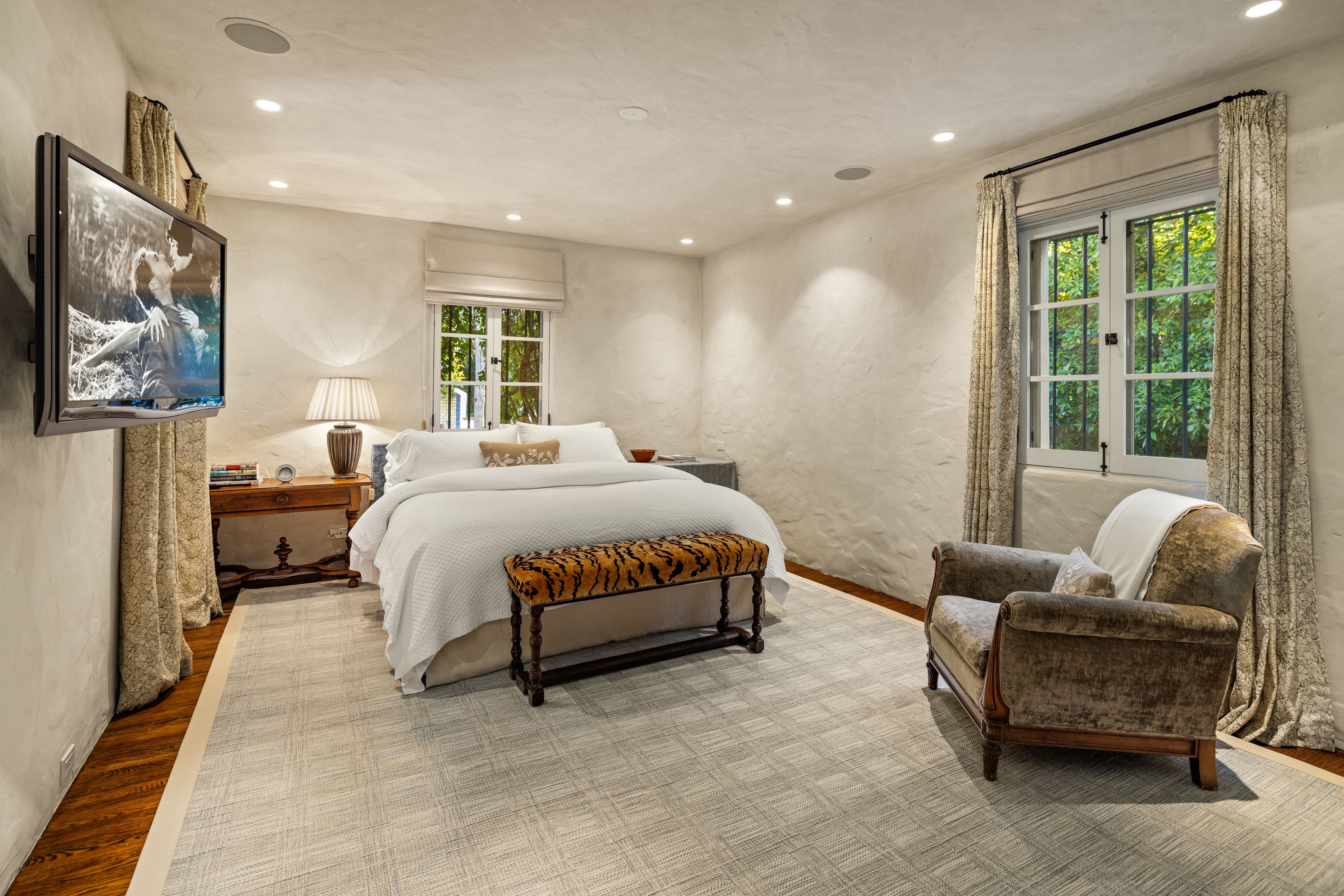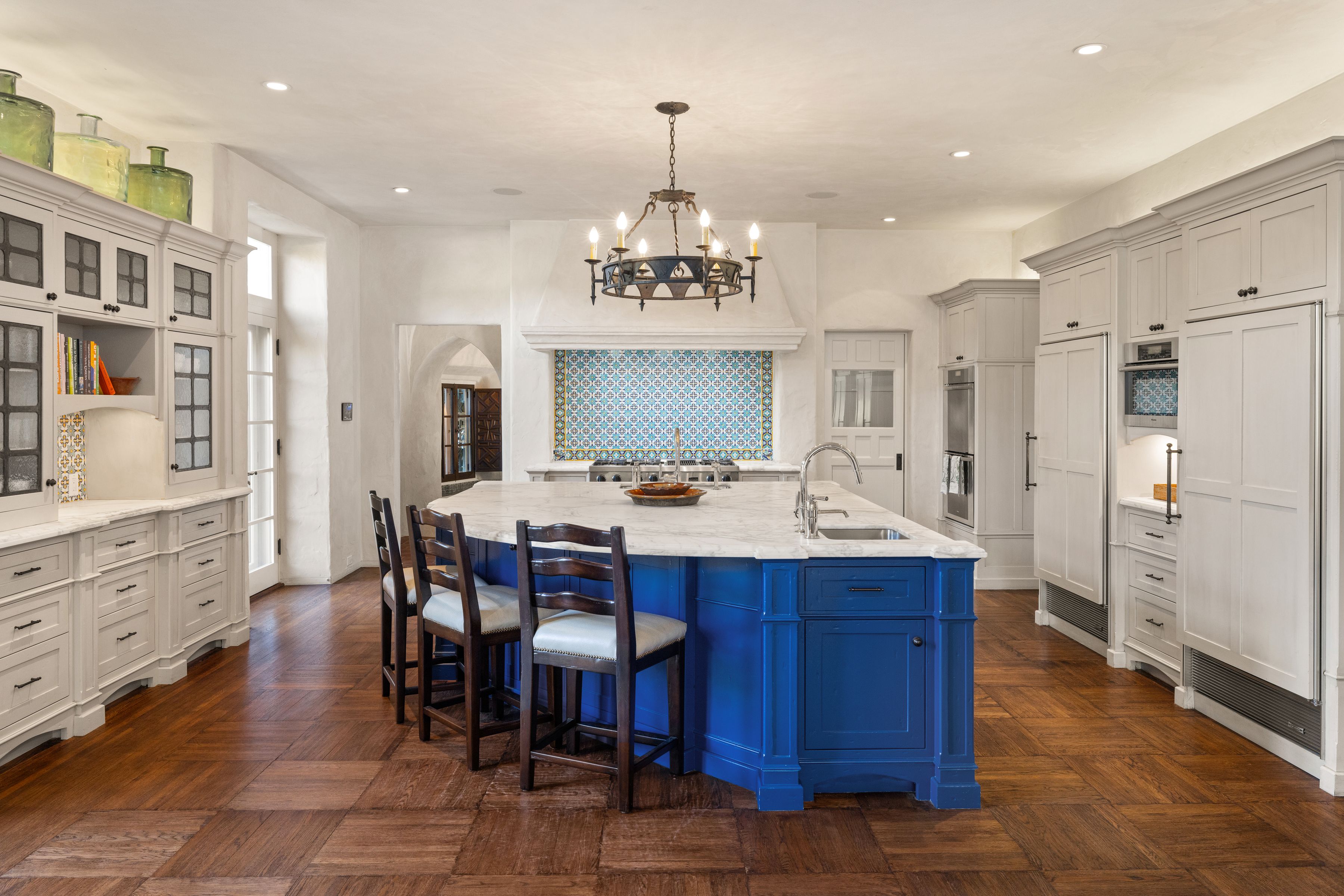 The estate's façade showcases signature Spanish Colonial Revival elements and white stucco walls, terra cotta roof tiles, wrought iron detailing, and intricately carved wooden doors. Upon entering, the home's grandeur is immediately evident.