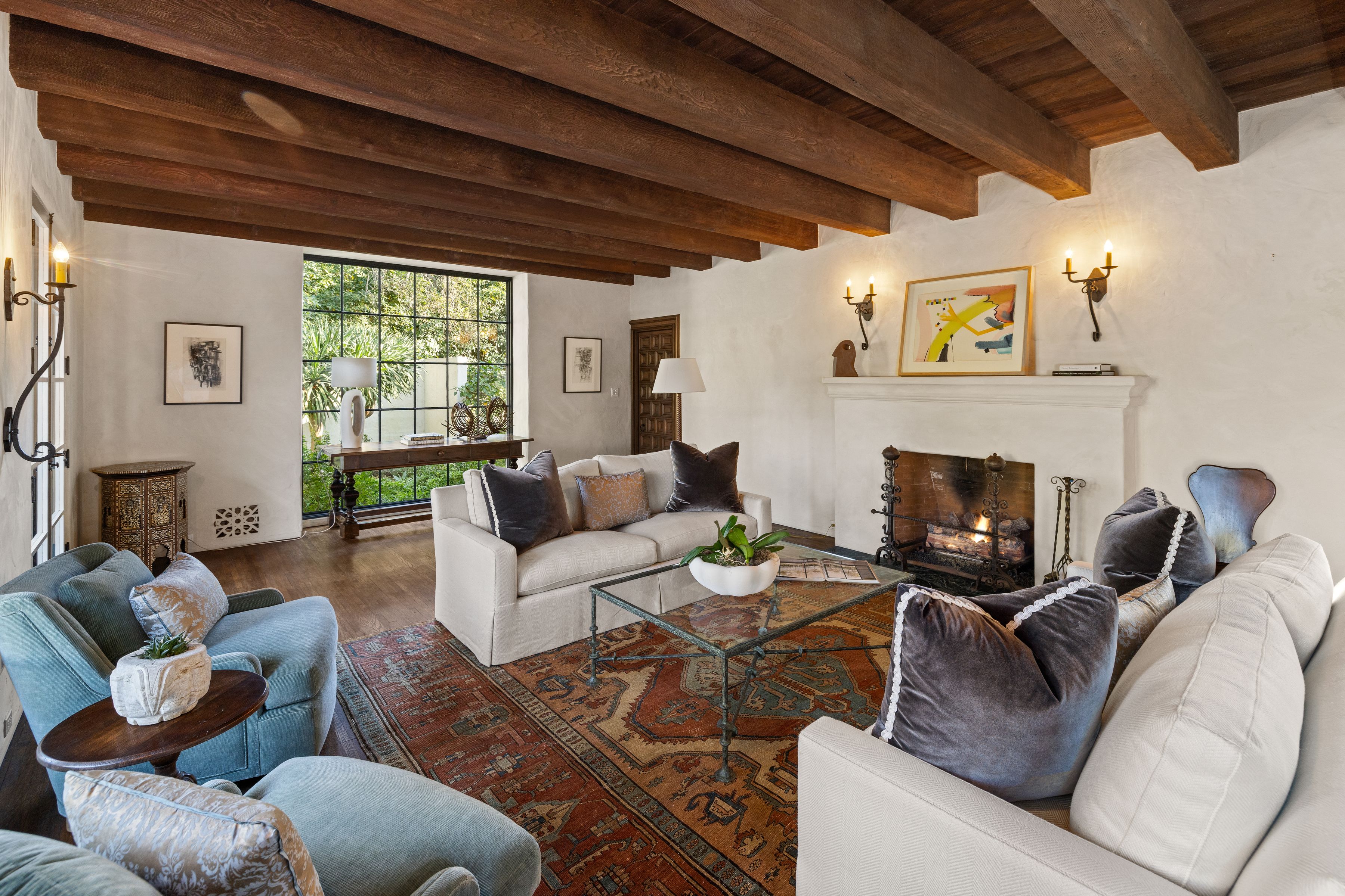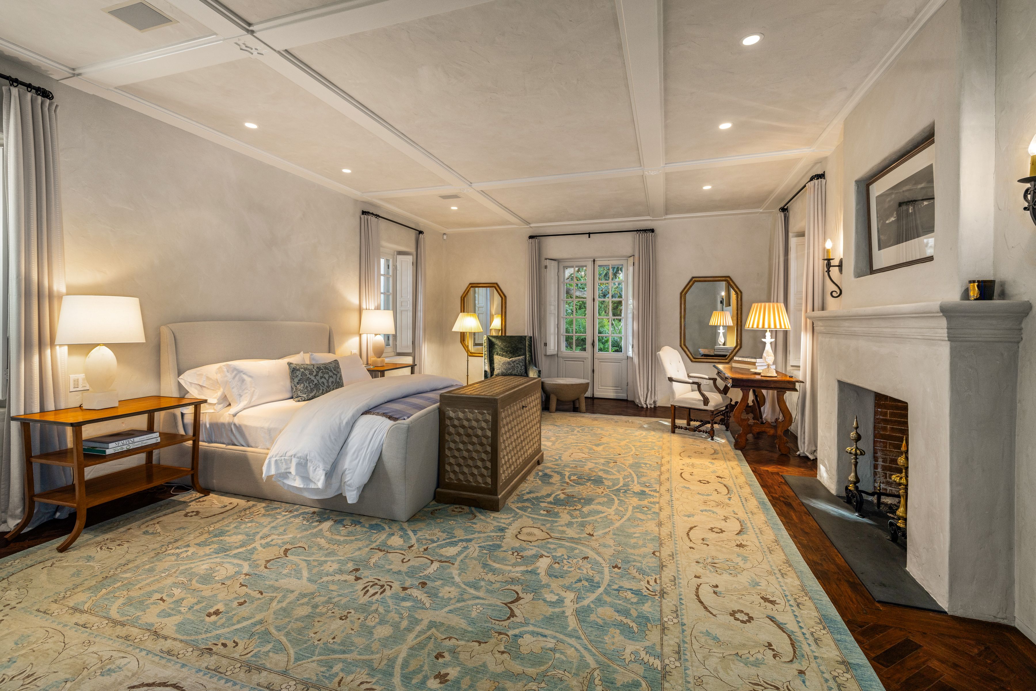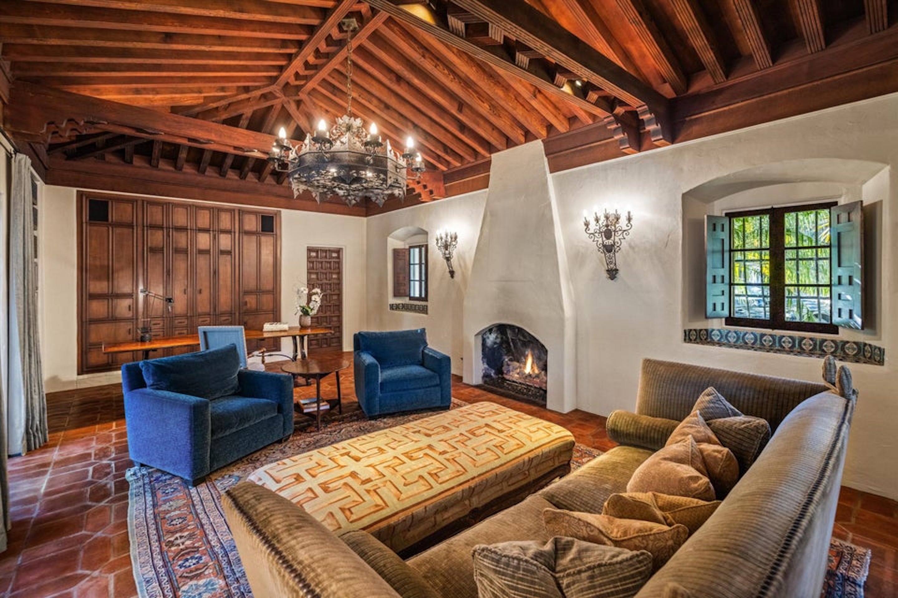 The grand living room, with soaring beamed ceilings and a striking fireplace, exudes warmth and sophistication. French-style doors open to sun-drenched terraces, creating a seamless connection between indoor and outdoor living. Adjacent to the living room, a richly appointed library with built-in bookcases and a half bath offers a cozy retreat.
