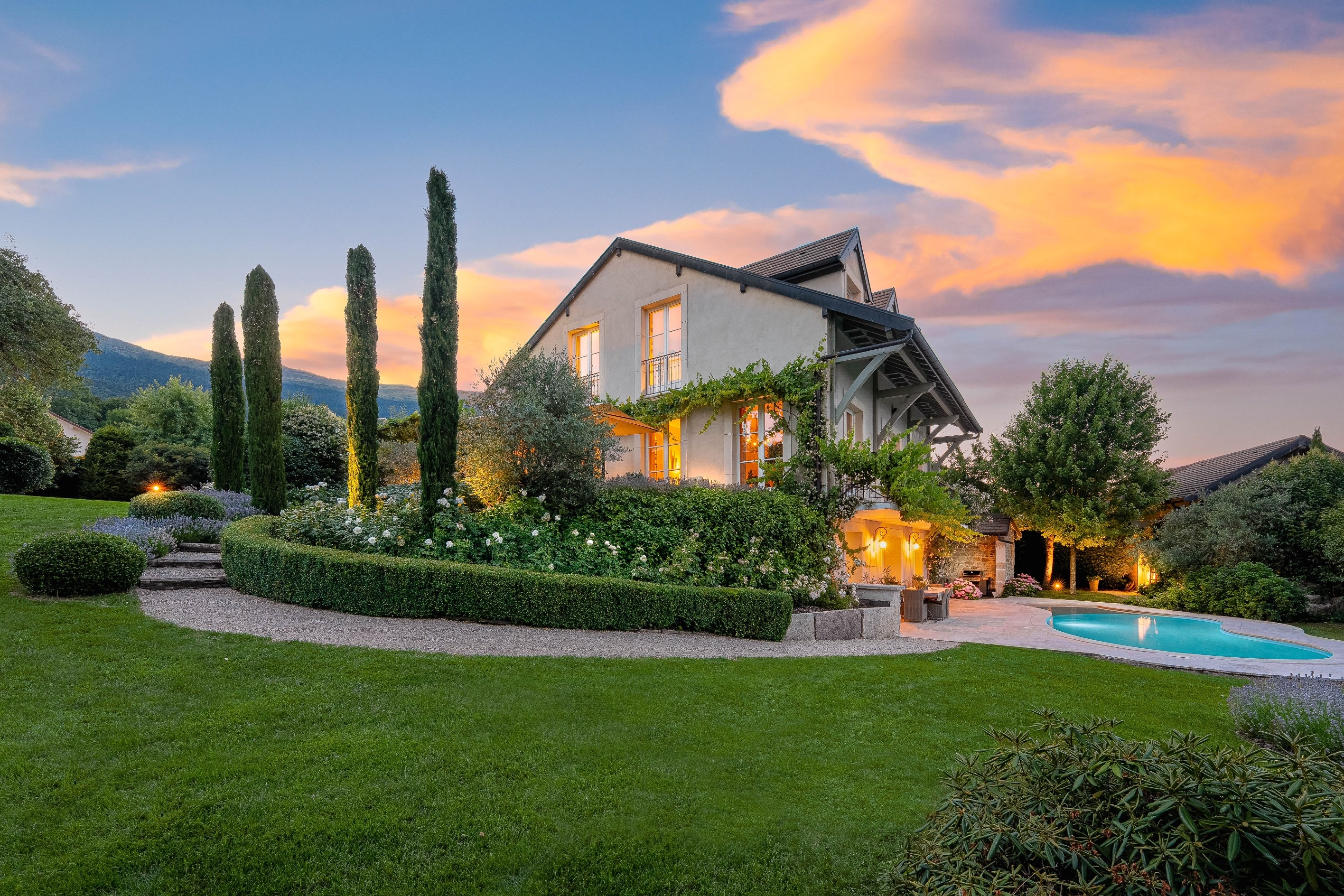 DIVONNE SOTHEBY'S INTERNATIONAL REALTY offers you this unique property, ideally located just 20 minutes from Geneva. Domaine de la London presents a rare opportunity to own an exceptional estate in a privileged and charming environment. Originally the site of a romantic farmhouse nestled among apple orchards, walnut groves, and cherry trees, the estate has been meticulously restored to meet the highest standards of comfort, sustainability and energy efficiency—preserving its authentic charm while incorporating modern architecture and refined finishes. Property Highlights: • Plot size: ~9,000 m² of landscaped grounds and pastures, integrating elegance and nature • Living space: Over 415 m², including main residence and annexes • Bedrooms: 7 total (including 2 en-suite), ranging from 16–22 m² • Bathrooms: 5 (2 with bathtubs), plus 3 separate WCs • Kitchen: Elegant kitchen of 22 m² • Living areas: 2 separate lounges—one for entertaining, one facing a lagoon-style pool • Additional features: Home gym, vaulted wine cellar, and a 65 m² independent two-story annex. From the moment you pass through the automated wrought-iron gate and follow the paved driveway under a magnificent quince tree, you are greeted by a sense of serenity and timeless elegance. Expansive windows fill the interiors with natural light and frame spectacular views of the Jura, Mont Blanc, and the nearby golf course. This residence is designed for both elegant entertaining and relaxed everyday living—a perfect retreat for families, nature lovers, or those seeking proximity to Geneva while enjoying the tranquillity of the French countryside. Whether you are relocating, investing, or searching for a refined second home, Domaine de la London combines historic charm, modern luxury, and an unrivalled setting. DIVONNE SOTHEBY'S INTERNATIONAL REALTY, your expert in the sale of luxury properties in Pays de Gex and Genevois (Greater Geneva). Georisks Information on the risks to which this property is exposed is available on the Georisks website https://www.georisks.gouv.fr