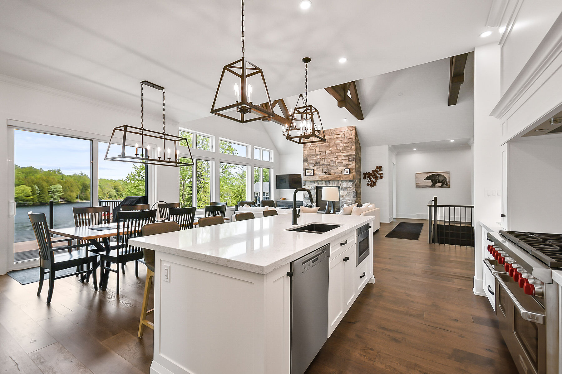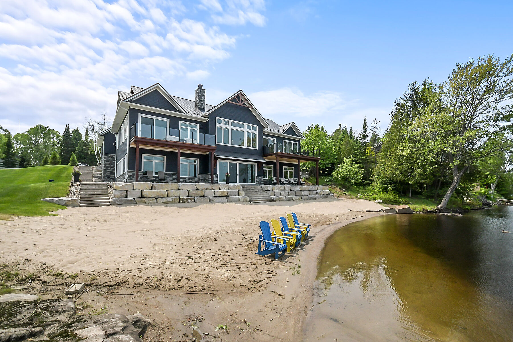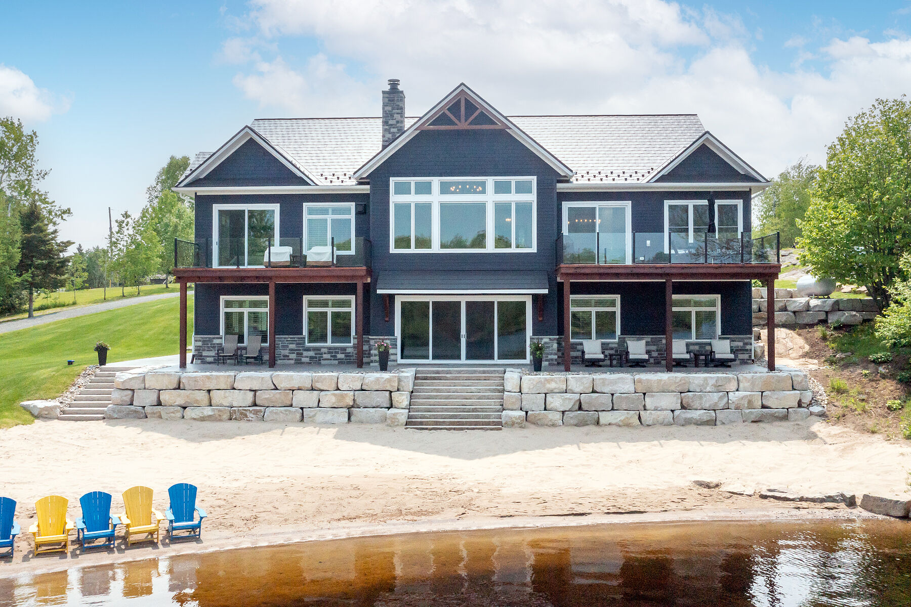 Welcome to 19 Bears Paw, a Muskoka styled luxury waterfront new build on sought-after Whitestone Lake, offering a private clean, sandy shoreline and all-day sun. Set on a gently sloping landscaped lot, this turnkey, fully winterized property delivers approximately 5,000 square feet of luxury living space across two levels. The main level features vaulted ceilings, wide-plank hardwood floors, and custom millwork throughout. The gourmet kitchen is equipped with a Wolf stove, Miele fridge, beverage fridge, and ice maker. The home offers five bedrooms, including a main floor primary suite with a spa-inspired ensuite and walk-in closets. Second primary bedroom with ensuite bathroom. The walkout lower level is ideal for entertaining, complete with a wet bar, games area, gas fireplace, home gym, and sauna. A heated garage. A rare opportunity to own a premium waterfront home or cottage with high-end finishes and stunning landscaping in a desirable four-season location. Incredible value here, enjoy the Muskoka lifestyle for a fraction of the price here at Whitestone Lake.