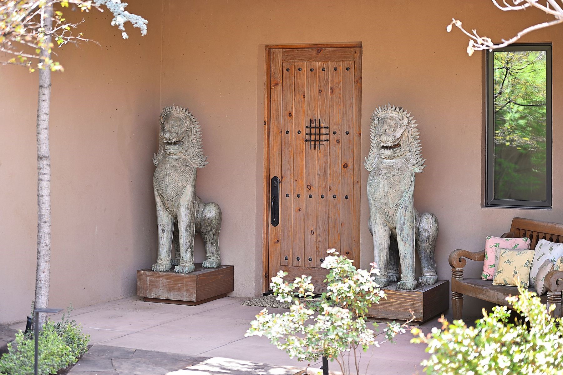 In the rugged reaches of exclusive Las Campanas this secluded estate—a sophisticated home and guesthouse—was custom-designed and -built amid blossoming trees, aspens, and stalwart evergreens. The residence is a bastion of color and volume featuring three luxuriously restful bedroom suites, formal living and dining rooms, a vast cook’s kitchen with a wet bar and a family room, an inviting guesthouse with a full kitchen and bath, and painstakingly landscaped grounds. Vibrantly colored polished plaster walls combine with soaring ceilings, wide windows, multiple fireplaces, a collection of portales, a roof deck, and a swimming pool shaded by a pergola to create an ideal setting for grand entertaining, a haven crafted for the appreciation of the outdoors, and the perfect venue for the display of art. Surrounding the home are natural greenery, carefully chosen landscaping, sculpture gardens, water features, and a water-wise artificial turf lawn.