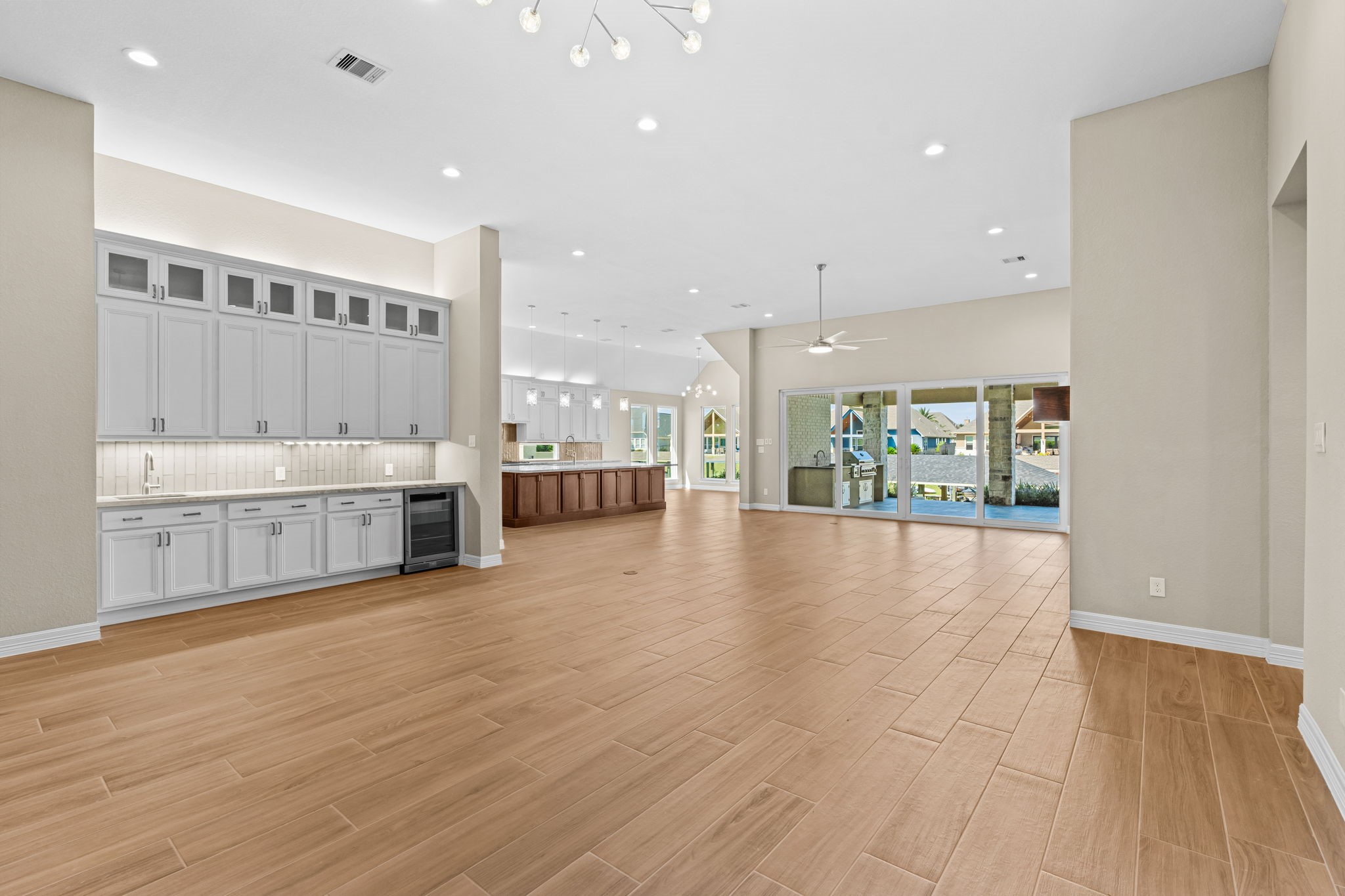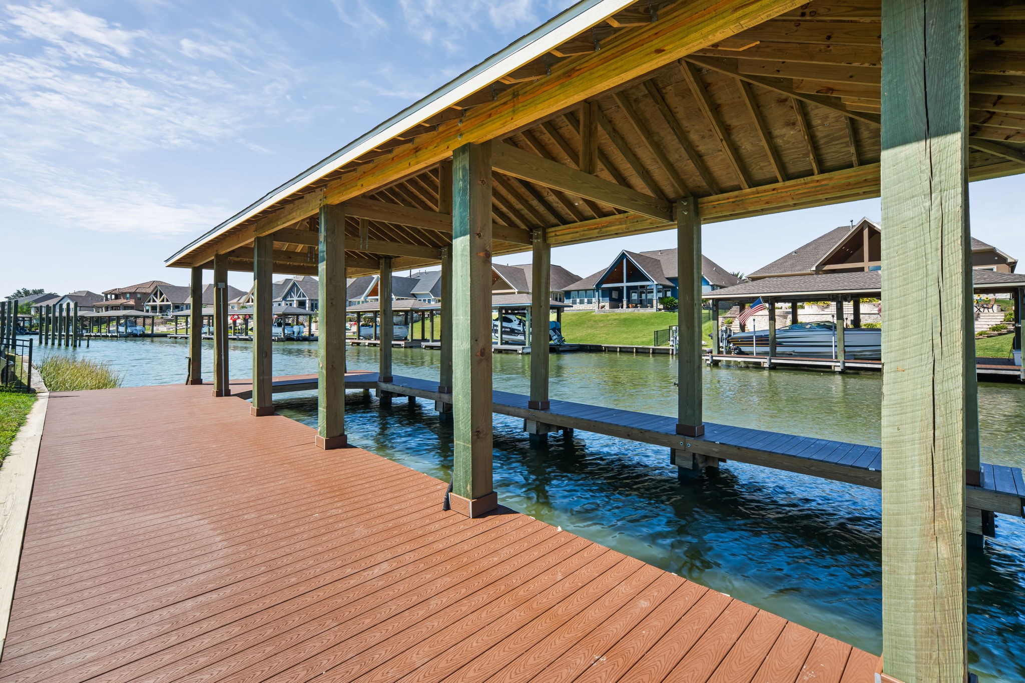Stunning new custom waterfront home with over 100ft of water frontage and a 40+ft covered dock, ideal for boaters with direct deep water access to Clear Lake and Galveston Bay. Built on a bell-bottom pier foundation, this luxury home features soaring ceilings, beautiful custom finishes, and open layout ready for entertaining. The chef's kitchen includes Thermador appliances and impressive quartz countertops. The prep kitchen off the main is an added bonus. First-floor living features a primary suite with water views, a spa-like bath and expansive closet. There is also a home office and additional secondary bedrooms with en suites. The second floor boasts a game room and bonus room. Sleek sliding glass doors open to a spacious patio with a cathedral ceiling, outdoor kitchen and breathtaking waterfront views. There is gated side access for a boat or trailer. A rare fusion of elegance, luxury and coastal beauty - ready for you to begin your waterfront lifestyle.