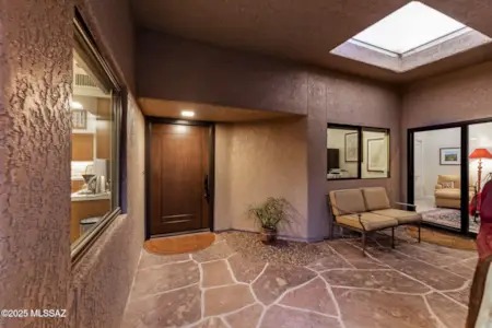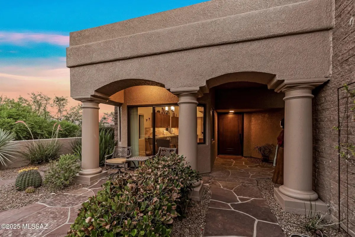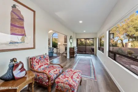 Welcome to your dream home nestled within the highly sought-after gated community of Ventana Canyon Country Club. Exquisite 2-bedroom, 2-bathroom residence, complete with a versatile den, sits on a stunning corner lot, offering breathtaking views & unparalleled privacy next to a natural wash. Meticulously landscaped front yard & shaded courtyard create an inviting entrance. Inside, the expansive great room boasts soaring ceilings & abundant natural light, connecting to a formal dining area- ideal for both intimate gatherings & grand entertaining. Spacious kitchen is a chef's delight with its modern updates, including a new gas range, fresh paint, under-counter lighting, & stylish backsplash and counters. A cozy breakfast nook sits at the end, with a lovely view