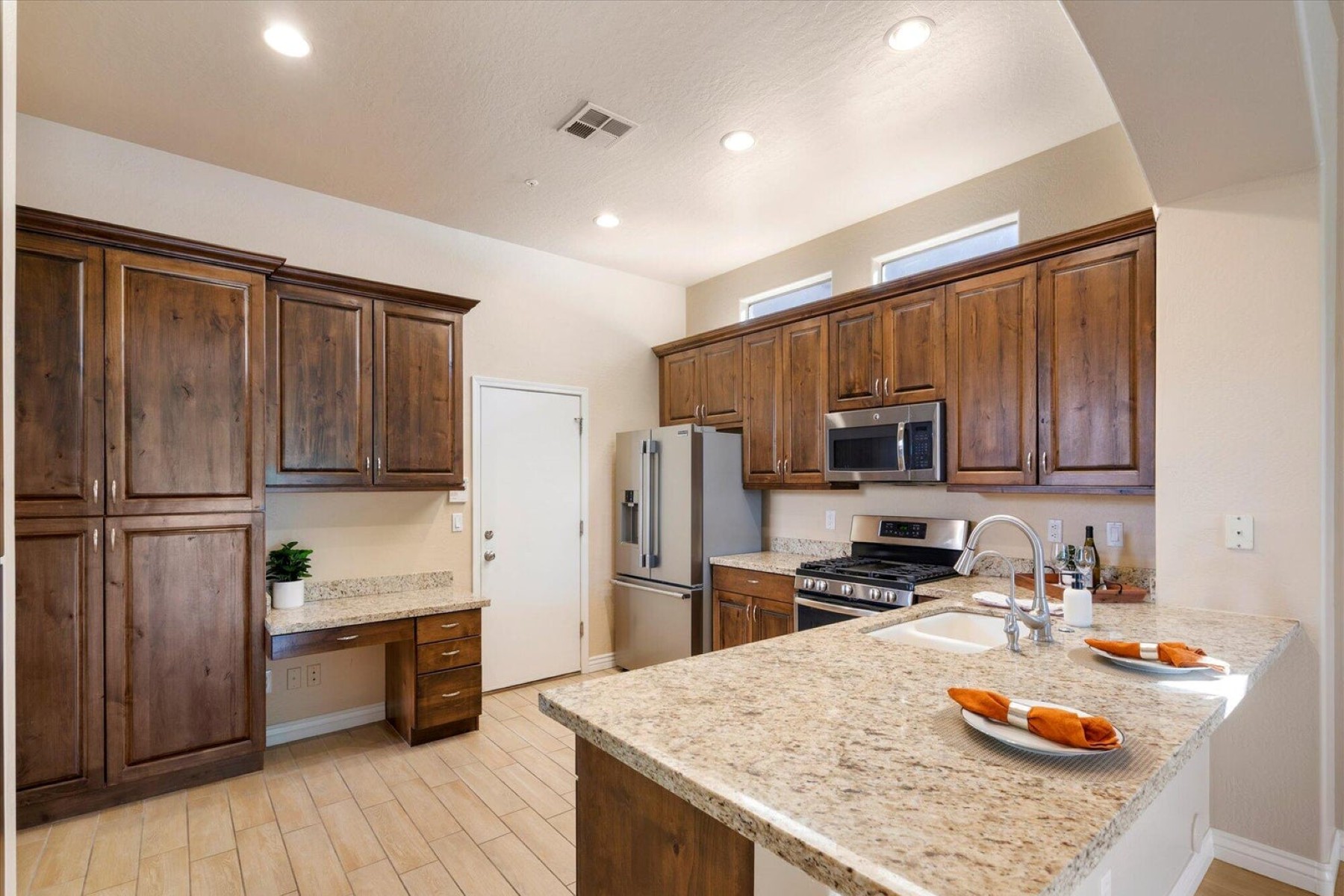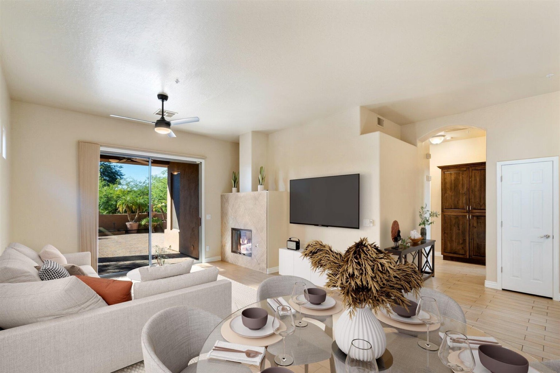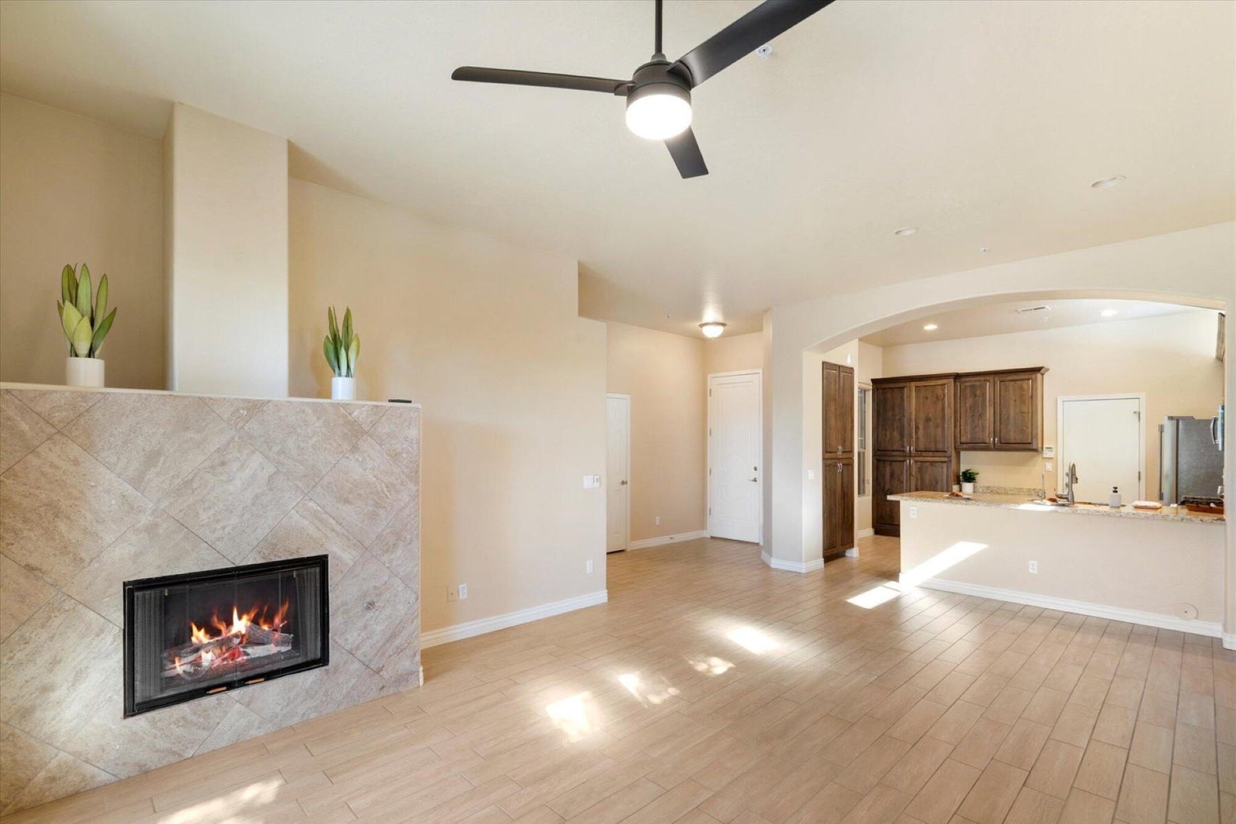 The primary suite is a peaceful retreat, featuring a luxurious bathroom with a stand-alone soaking tub, a stunning glass-enclosed shower, and a generous walk-in closet. Enjoy your morning coffee in the gated front courtyard with paver flooring, or relax in the private backyard, also finished in pavers and enhanced with vibrant flowerpots and low-maintenance landscaping. The two-car garage features brand-new epoxy flooring. Residents of Legend Trail enjoy access to a world-class community center offering multiple fitness rooms, two heated pools, a spa, pickleball and tennis courts, all included in the affordable $300 quarterly HOA fee. The community also features a public golf course and on-site restaurant. This home offers the perfect blend of comfort, style, and resort-style livingready for you to move in and enjoy the Legend Trail lifestyle! See the Virtual Tour links for see more on the home as well as the Legend Trail Community!