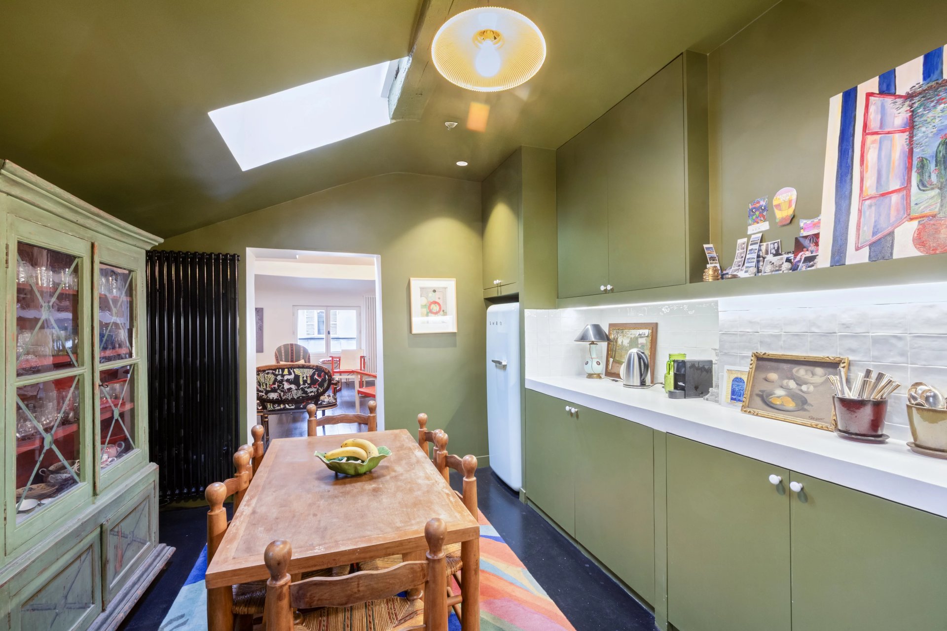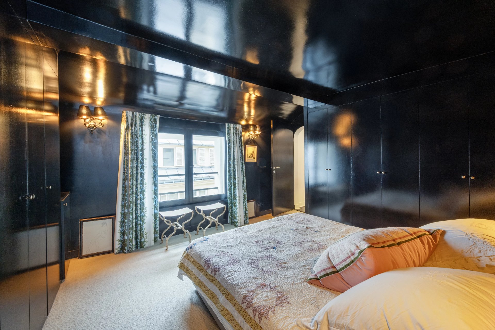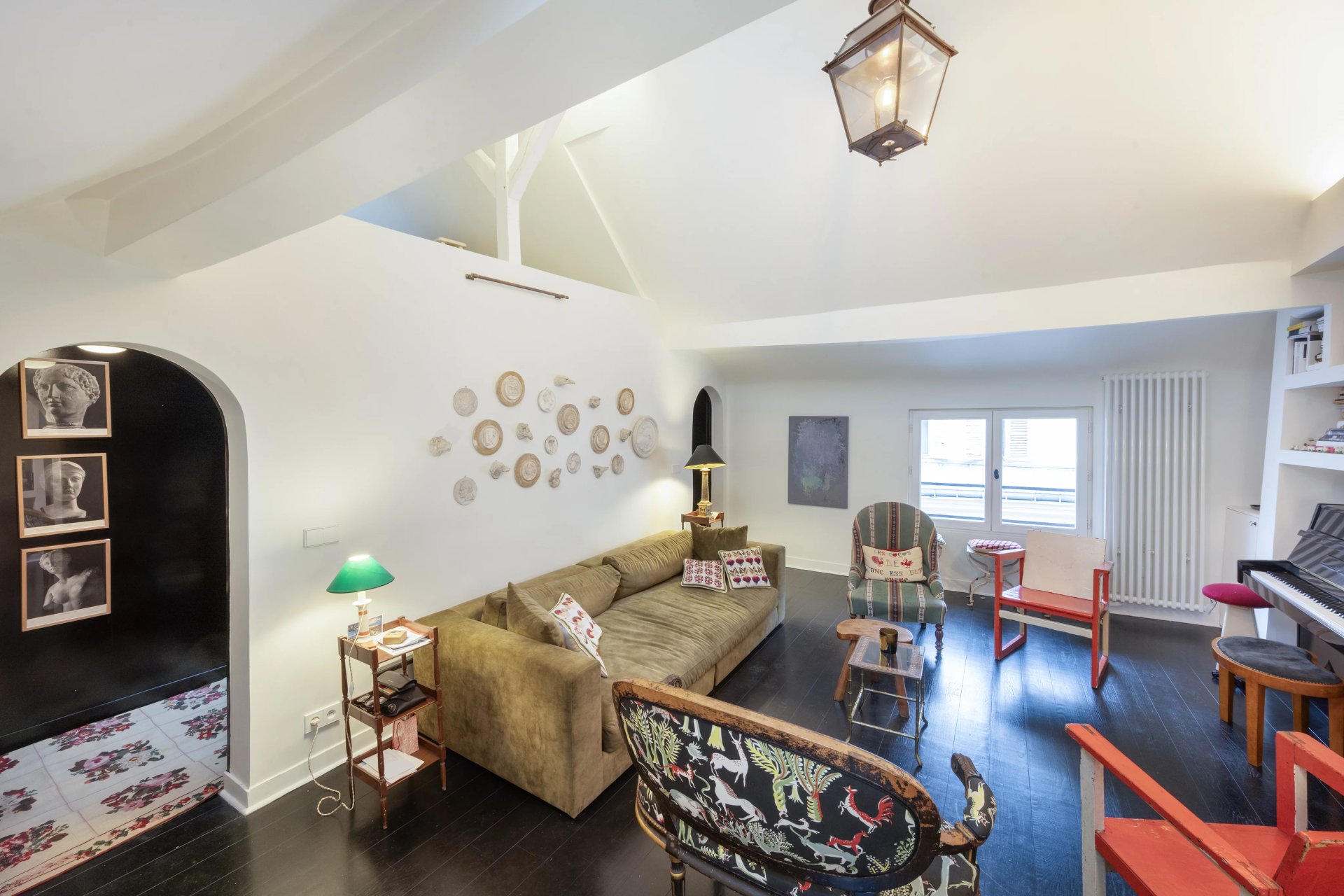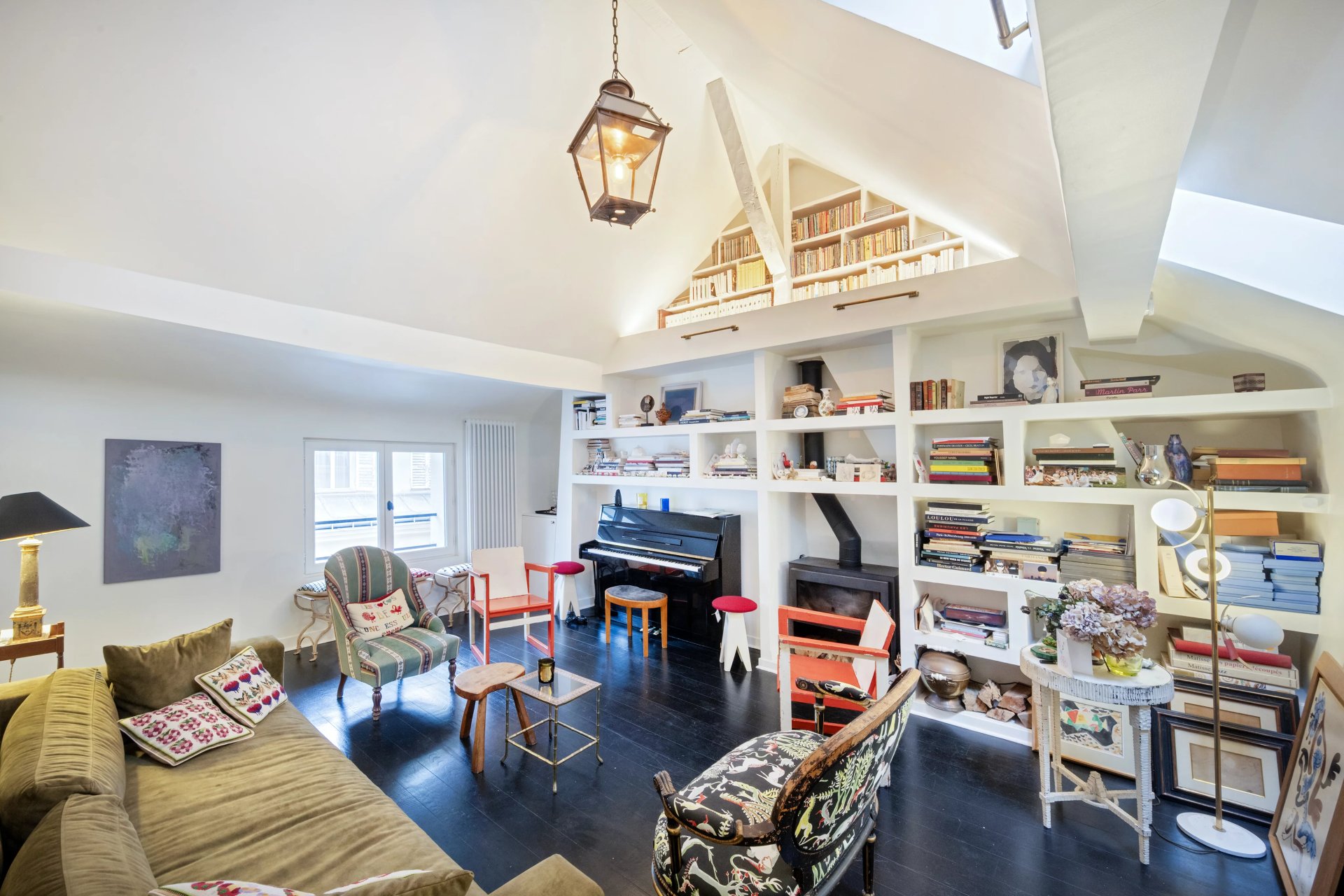 Rue de Verneuil. This bright split-level apartment with the feel of a private house is on the top floor of a fine period building located in the capital's Carré des Antiquaires neighbourhood. It includes a living/reception room featuring a soaring ceiling, a kitchen with dining facilities, a spacious bedroom with a shower room, and a study. The lower floor comprises a second bedroom with a bathroom and wc.