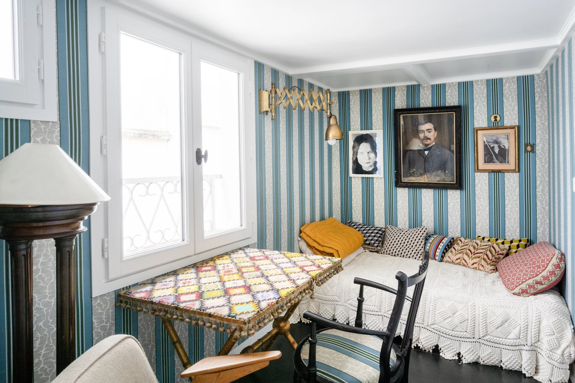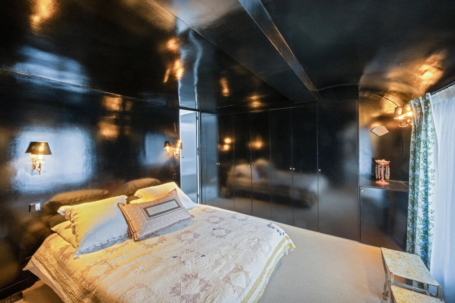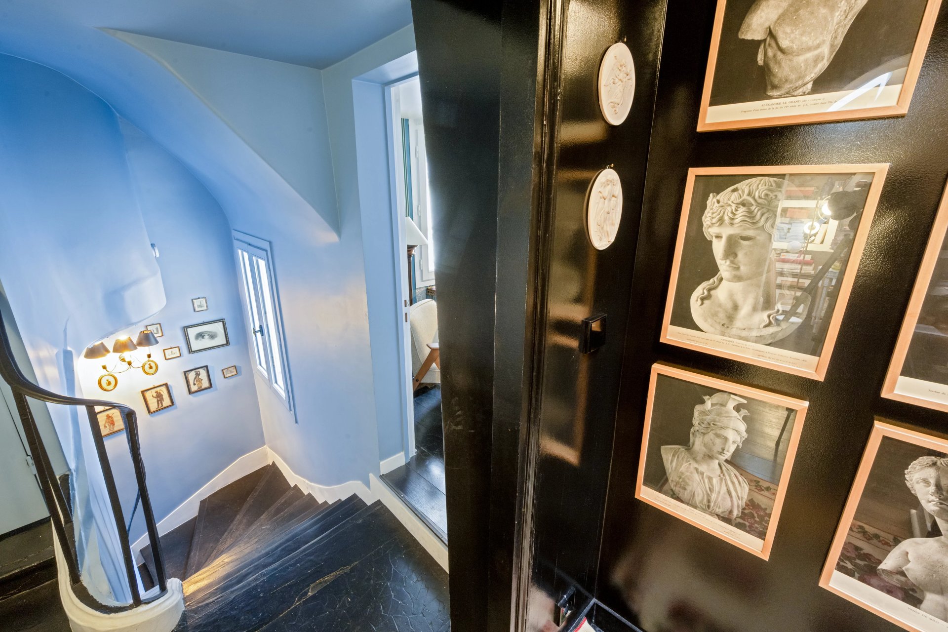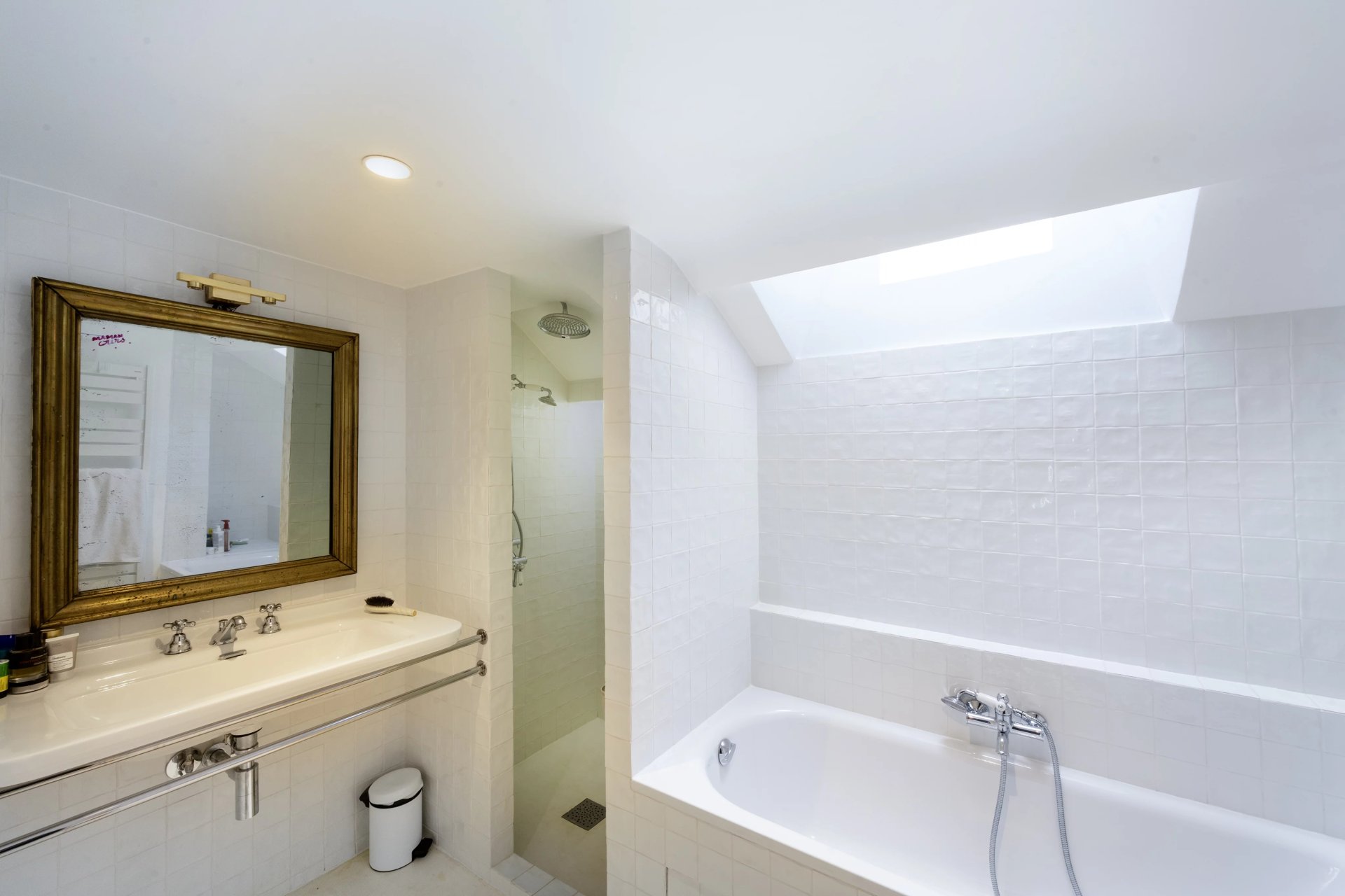 Rue de Verneuil. This bright split-level apartment with the feel of a private house is on the top floor of a fine period building located in the capital's Carré des Antiquaires neighbourhood. It includes a living/reception room featuring a soaring ceiling, a kitchen with dining facilities, a spacious bedroom with a shower room, and a study. The lower floor comprises a second bedroom with a bathroom and wc.