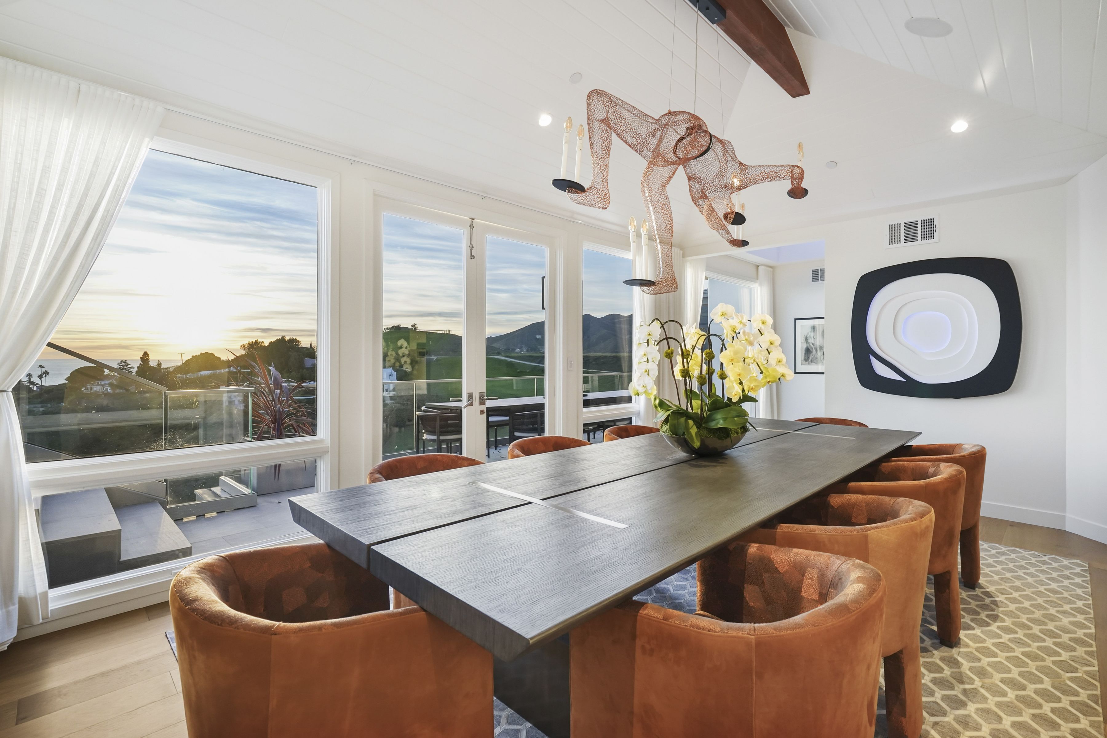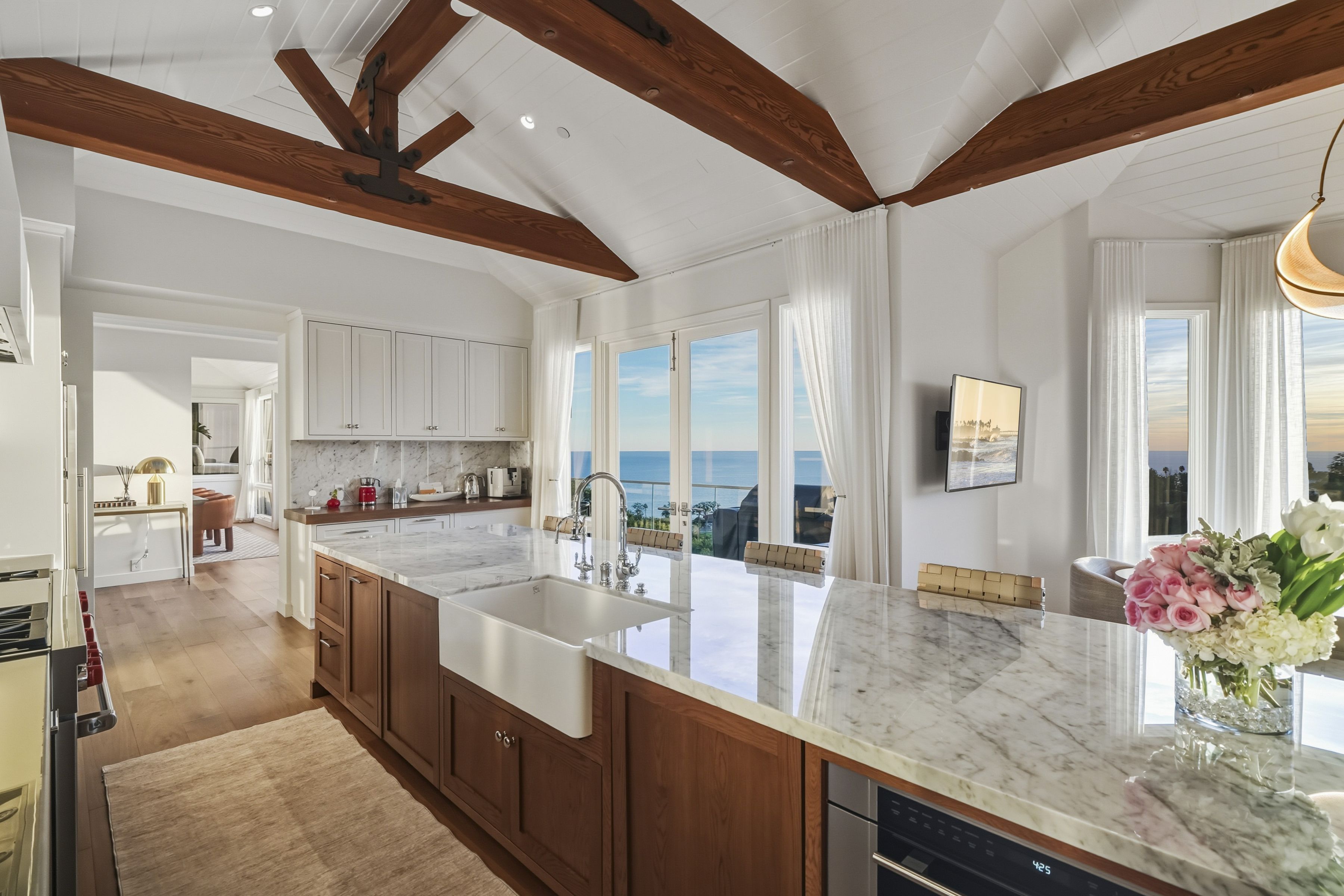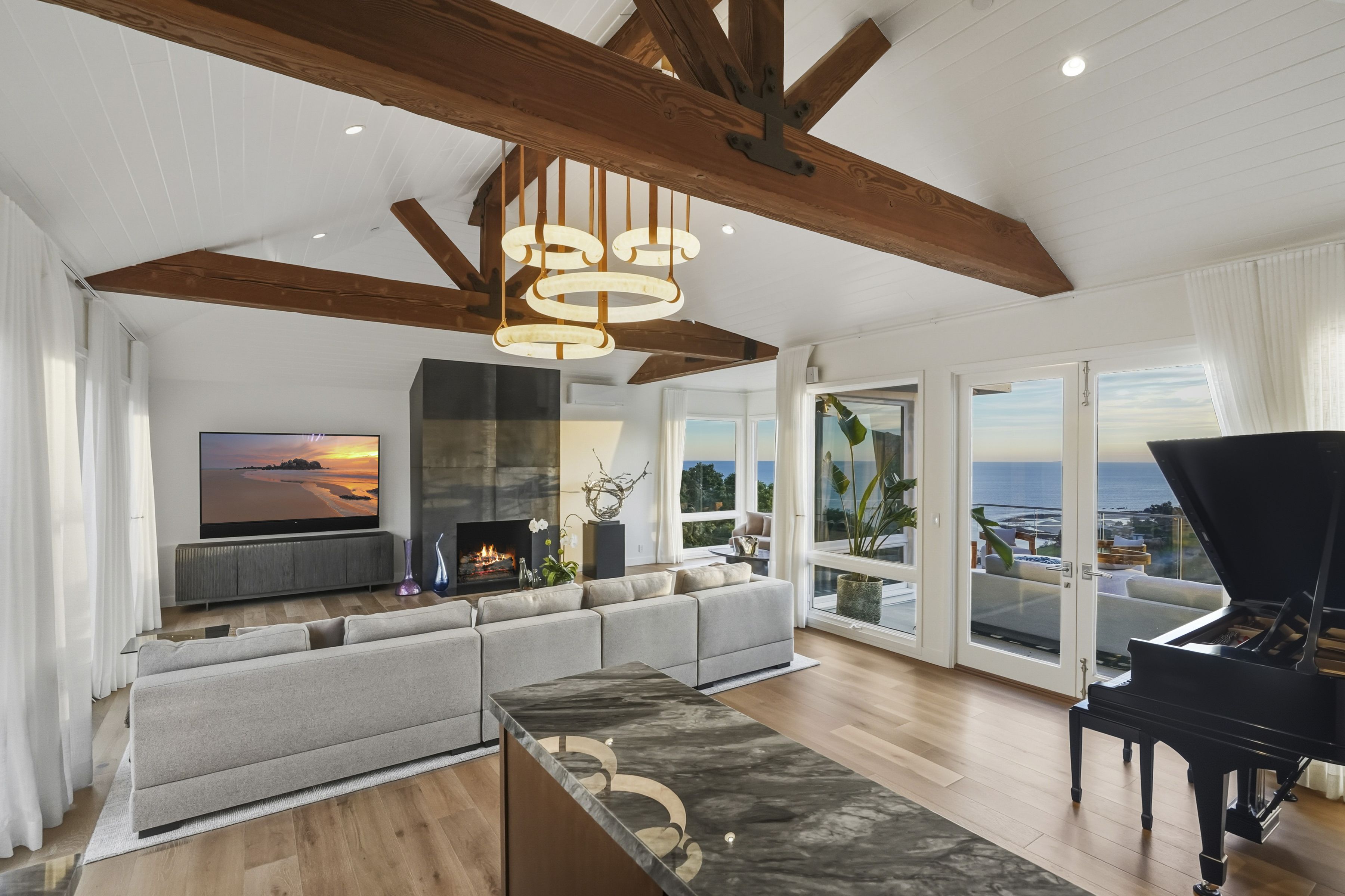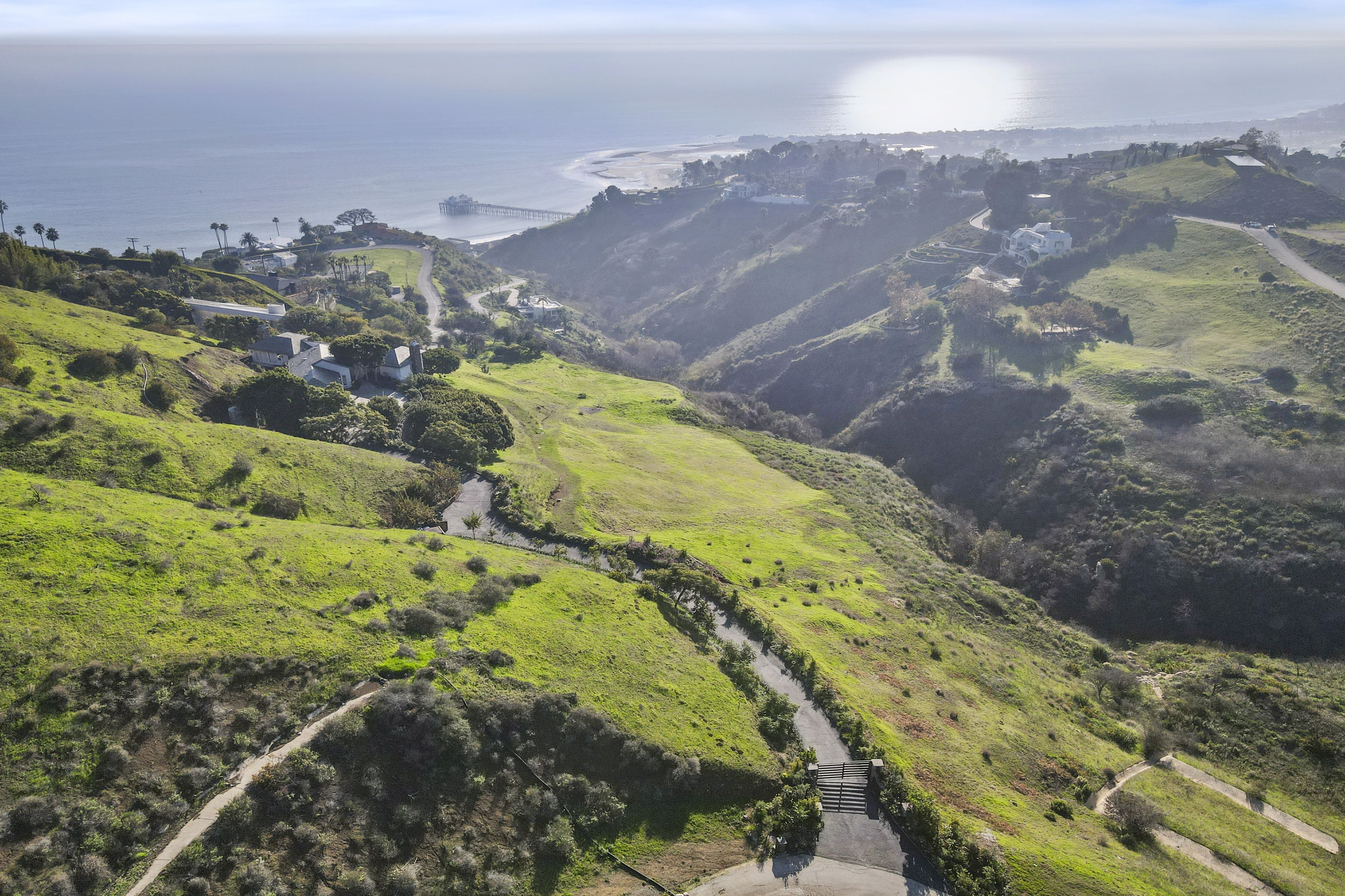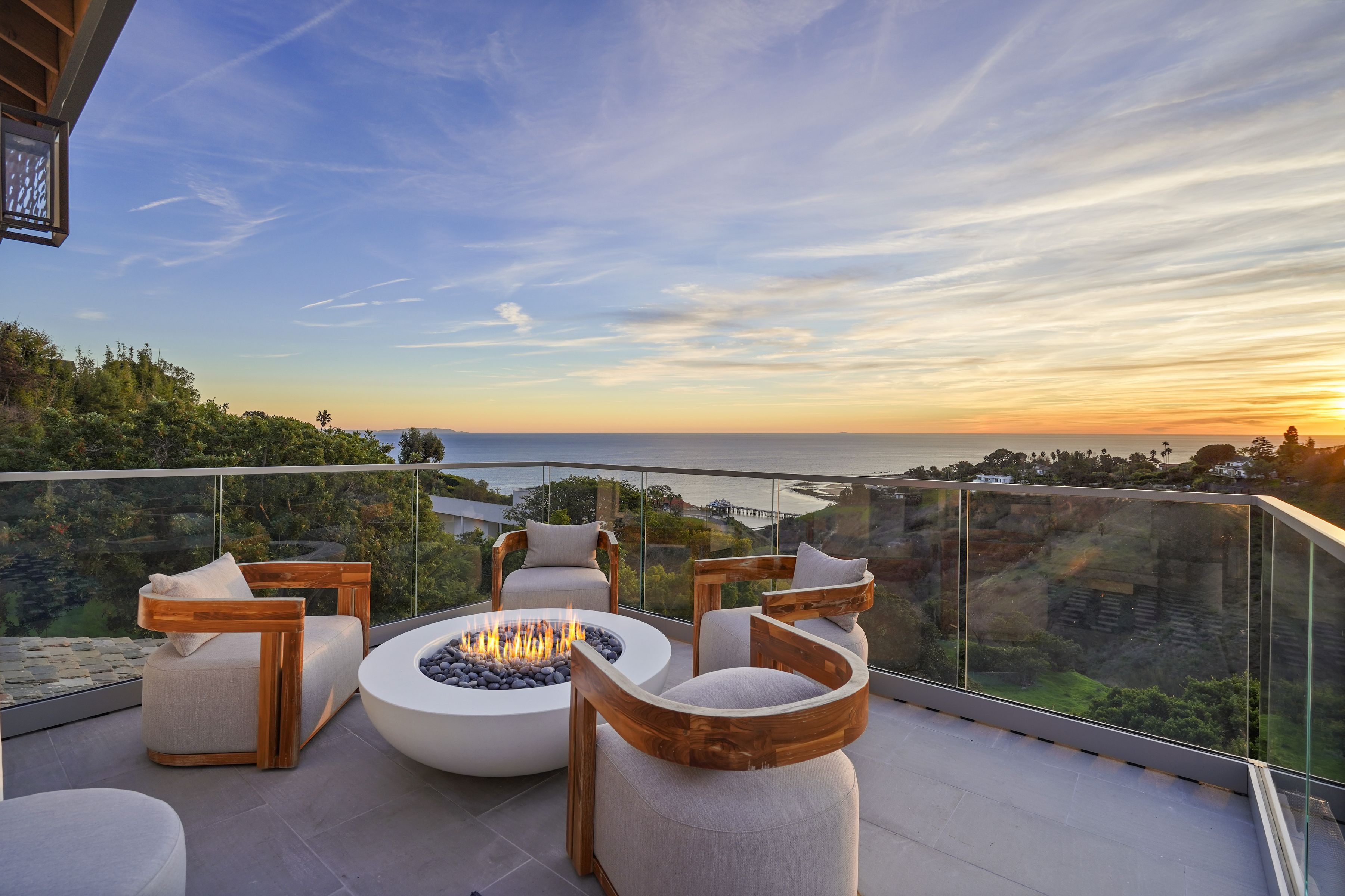 A pristinely redone and truly breathtaking Malibu "Serra Retreat" estate with commanding ocean views spanning the Malibu Pier, Surfrider Beach, and the endless whitewater coastline, securely positioned behind the 24-hour guard gates of Serra Retreat, Malibu's most prestigious private enclave. A future equestrian estate awaiting vision and execution, this extraordinary offering presents a rare opportunity to create a world-class compound with a riding ring, guest residence, staff quarters, and resort-style amenities (buyer to conduct their own due diligence). Completely remodeled, the home is an elegant fusion of farmhouse-inspired exterior architecture and a richly layered warm-modern interior, embodying refined luxury, quiet sophistication, and one of the most commanding coastal vantage points in all of Serra Retreat. Every detail has been thoughtfully curated to elevate both form and function, creating a residence that feels timeless, substantial, and undeniably glamorous. Privately set on 3.3 acres across two parcels, the estate offers immediate luxury paired with exceptional future potential. The second parcel allows for the addition of a pool, tennis court, guest home, and equestrian riding ring (buyer to conduct their own due diligence), while directly bordering miles of protected hiking, biking, and horseback riding trails; an extraordinary blend of oceanfront drama and serene natural beauty.The residence spans approximately 5,548 square feet and features four ensuite bedrooms and four-and-a-half baths. A long, private gated drive leads to a formal entry where dramatic ocean views immediately captivate, framed by soaring vaulted ceilings, exposed wood beams, bespoke detailing, and expansive walls of glass capturing the coastline from nearly every room. From the moment of arrival, uninterrupted sightlines draw the eye outward to the Pacific, with sunlight dancing across refined interiors.A full-length ocean-view balcony extends across the home, offering a front-row seat to glowing sunsets, rolling surf, and the iconic Malibu Pier below. The main level is masterfully designed for both grand entertaining and intimate daily living. A sun-drenched living room features vaulted wood-beam ceilings, a sculptural metal fireplace, and inviting seating perfectly positioned to enjoy the coastline and evening skies. A full bar, formal dining room, and multiple lounging areas appear to float above the ocean, creating seamless flow throughout. The chef's kitchen is both striking and highly functional, appointed with custom white-oak cabinetry, high-end stainless steel appliances, an expansive center island, fireplace, and walk-in pantry ideal for refined entertaining or quiet mornings overlooking the sea. Completing the main level are a guest bedroom with a second-story loft and additional sleeping area, a well-appointed laundry room, and a private dry sauna.A wide custom staircase leads to the lower level, where a generous entertainment lounge transitions into the primary suite; a luxurious private retreat bathed in natural light and breathtaking coastal views. Floor-to-ceiling windows frame the horizon, while the spa-inspired bath features a soaking tub, separate shower, and dual vanities. The suite opens directly to a private outdoor hot tub, perfectly positioned to capture Malibu's legendary sunsets in complete privacy. Two additional ensuite bedrooms provide beautifully appointed accommodations for family and guests. Additional features include an oversized three-car garage, parking for five or more vehicles, and two graded pads ideal for future enhancements. Just moments from Cross Creek, world-class shopping, dining, and the beach, yet entirely removed from the noise,this remarkable estate delivers a rare combination of security, accessibility, acreage, and awe-inspiring views. Bold, glamorous, and unmistakably Malibu, located within one of California's most exclusive gated communities.