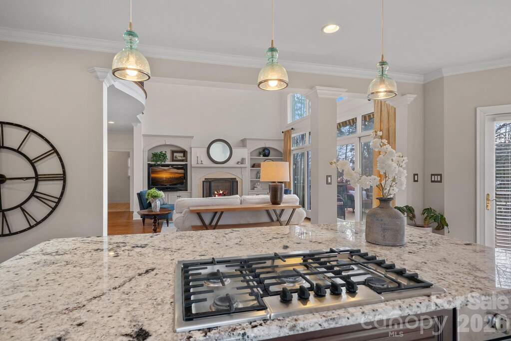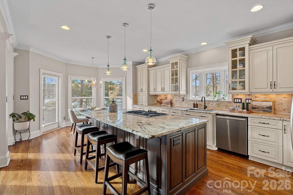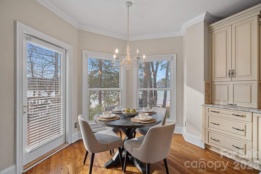 Welcome to the ultimate Lake Norman lifestyle. Nestled on a lush 0.70-acre lot with 110 feet of private shoreline, this home delivers year-round Sunset water views and a private dock in an unrivaled setting. Step inside to find a residence refreshed and ready for its next chapter, featuring fresh interior paint (February 2026) throughout the main living areas and elegant finishes at every turn. The experience begins in the two-story foyer, where a statement light fixture and a grand staircase with iron balusters set a sophisticated tone. Host formal dinners in the dining room featuring a stunning beaded chandelier and bay window, or utilize the fully equipped butler's pantry-complete with granite countertops, a bar sink, and a built-in microwave and dishwasher-for seamless hosting. The gourmet kitchen is a chef's dream, featuring an oversized granite island with bar seating, professional-grade stainless appliances including a 5-burner gas cooktop, and custom cabinetry with an appliance garage and stylish glass-front accents. Adjacent to the kitchen, the breakfast area offers spacious views and direct access to the oversized back deck. The two-story great room is anchored by a gas fireplace and built-in cabinetry, featuring a spectacular wall of windows and sliding glass doors. For guests, the main level includes a dedicated suite with hardwood flooring, a tray ceiling, and a full en-suite bath. The upper level is designed for comfort and privacy, connected by a loft catwalk overlooking the great room. The owner's suite serves as a true sanctuary, entered through double doors and featuring a bay window sitting area overlooking the lake, along with a massive two-room walk-in closet with custom shelving. The grand spa-like bathroom offers an oversized vanity, a Jacuzzi tub with natural light, and a tile-surround walk-in shower with dual heads and a frameless glass door. Two additional bedrooms each provide private vanities and walk-in closets with access to a shared bathroom, while a massive bonus room with dual attic access offers the perfect footprint for a home theater or gym. Outdoor living is effortless and expansive. The multi-level deck features a retractable awning and multiple seating areas, making it the premier spot for sunset cocktails. Follow the concrete walkway through professional landscaping down to your 110 feet of shoreline and private dock, complete with an iron-railed pier and floating boat slip. Modern conveniences abound, including a central vacuum system, a dedicated laundry room with built-in cabinetry, and an oversized garage with a large storage area. This property offers the perfect balance of privacy and prime lakefront access. Community amenities include a pool, two tennis courts, two new pickleball courts, volleyball, basketball, a clubhouse, and a playground.
