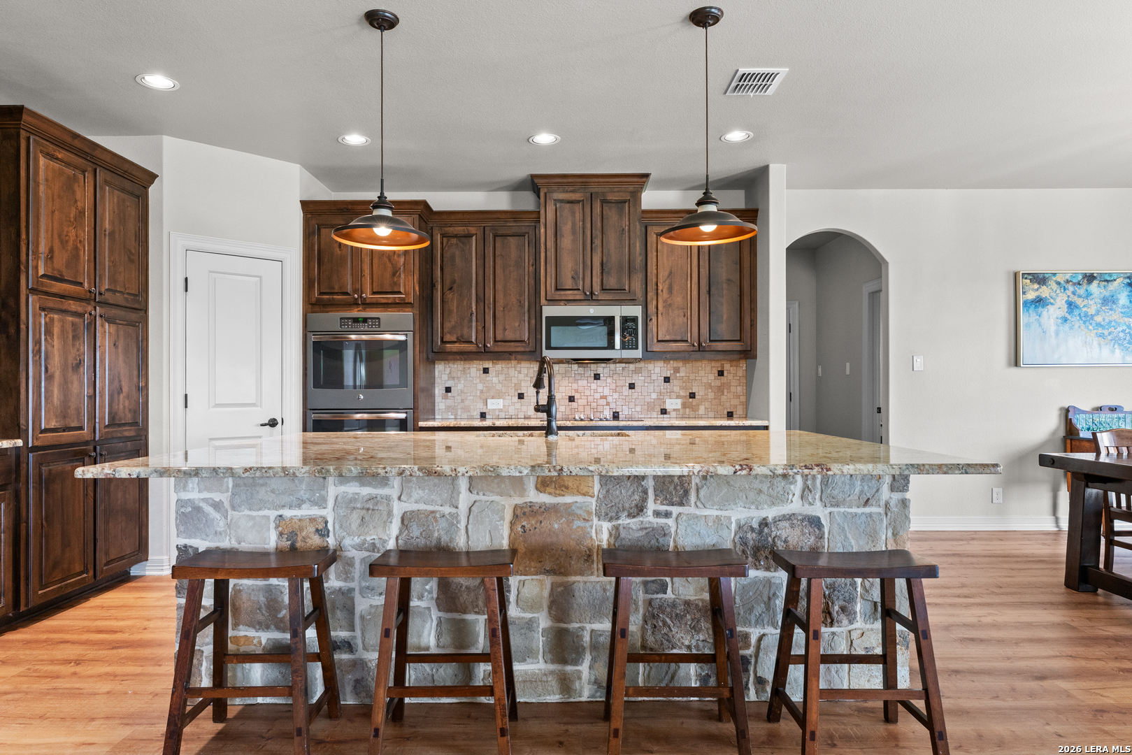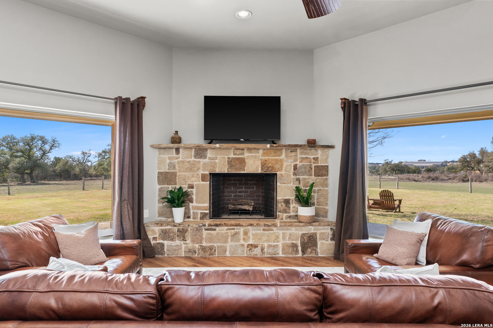 Indulge in this seductive sanctuary nestled in an exclusive gated community where every glance is rewarded with breathtaking panoramic views that stretch across the horizon. Waggener Ranch teases the senses with its exotic wildlife offering its owners ag exemption rights where graceful blackbucks roam freely, their elegant horns and sleek forms adding a touch of wild, untamed allure to the landscape. Step inside to an open, flowing floorplan that invites intimacy and connection, centered around a gourmet kitchen designed to tempt and tantalize. Sleek granite countertops gleam under soft lighting, perfect for late-night culinary adventures or lingering mornings with coffee and stolen kisses. The generously sized bedrooms offer private escapes, each one promising restful nights and lazy mornings tangled in sheets. A spacious master suite boasts indulgent walk-in closets-cavernous, organized spaces waiting to showcase your finest lingerie, tailored suits, or nothing at all. The game room becomes a playful retreat with custom built-in bunk beds-cozy, inviting nooks ideal for whispered secrets, movie marathons, or imaginative overnight adventures. Outside awaits an incredible outdoor kitchen and patio-your ultimate stage for sensual evenings under the stars. Imagine the sizzle of steaks on a high-end grill, chilled drinks lined up on expansive counters, and plush seating arranged for close conversations or slow dances as string lights twinkle overhead. Whether hosting intimate gatherings or stealing quiet moments with someone special, this alfresco paradise beckons with warmth, luxury, and endless possibilities for indulgence. A practical storage shed keeps tools and toys discreetly tucked away, leaving the grounds pristine and ready for whatever spontaneous pleasures the day (or night) brings. This isn't just a home-it's a luscious lifestyle waiting to envelop you.