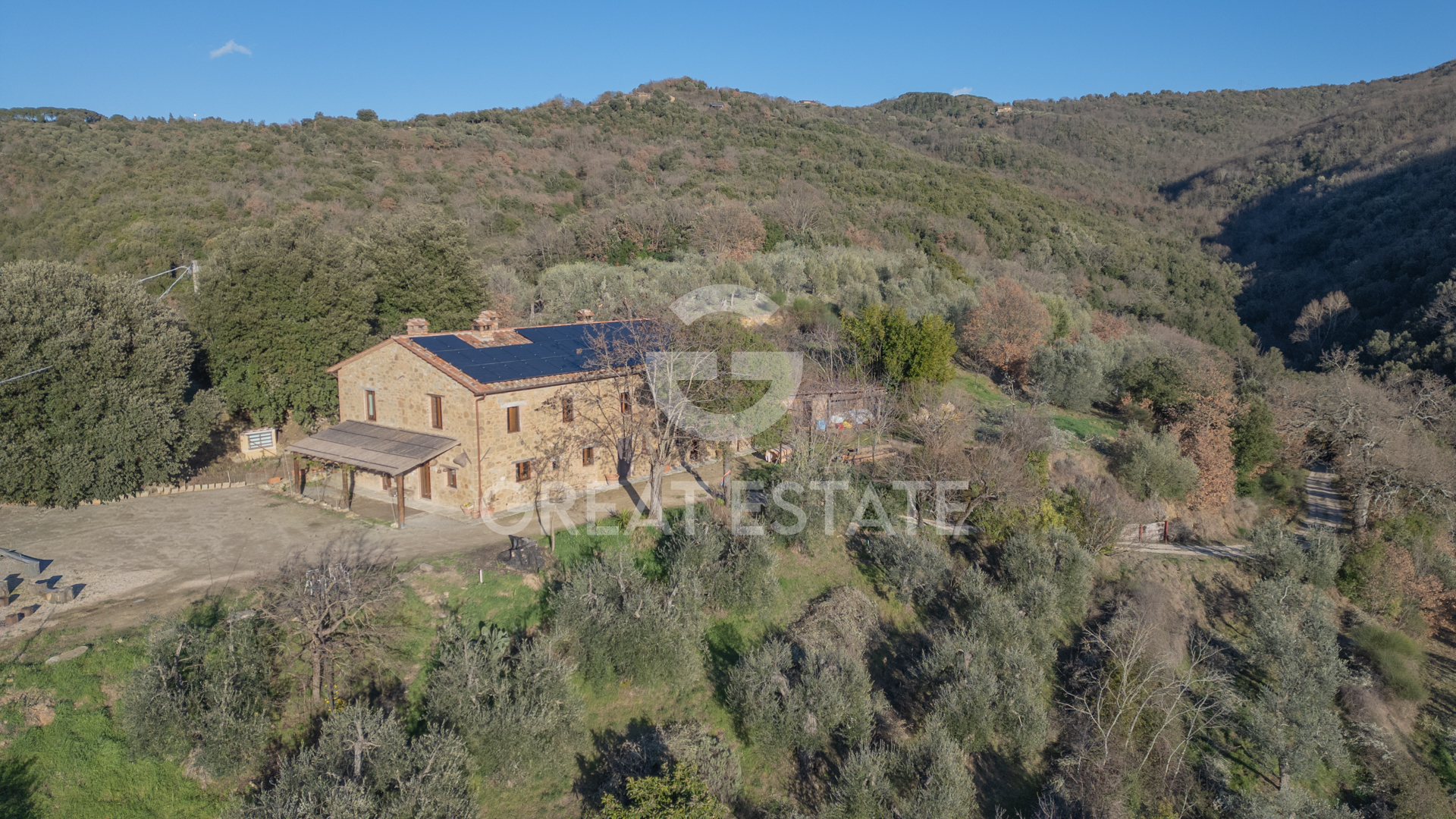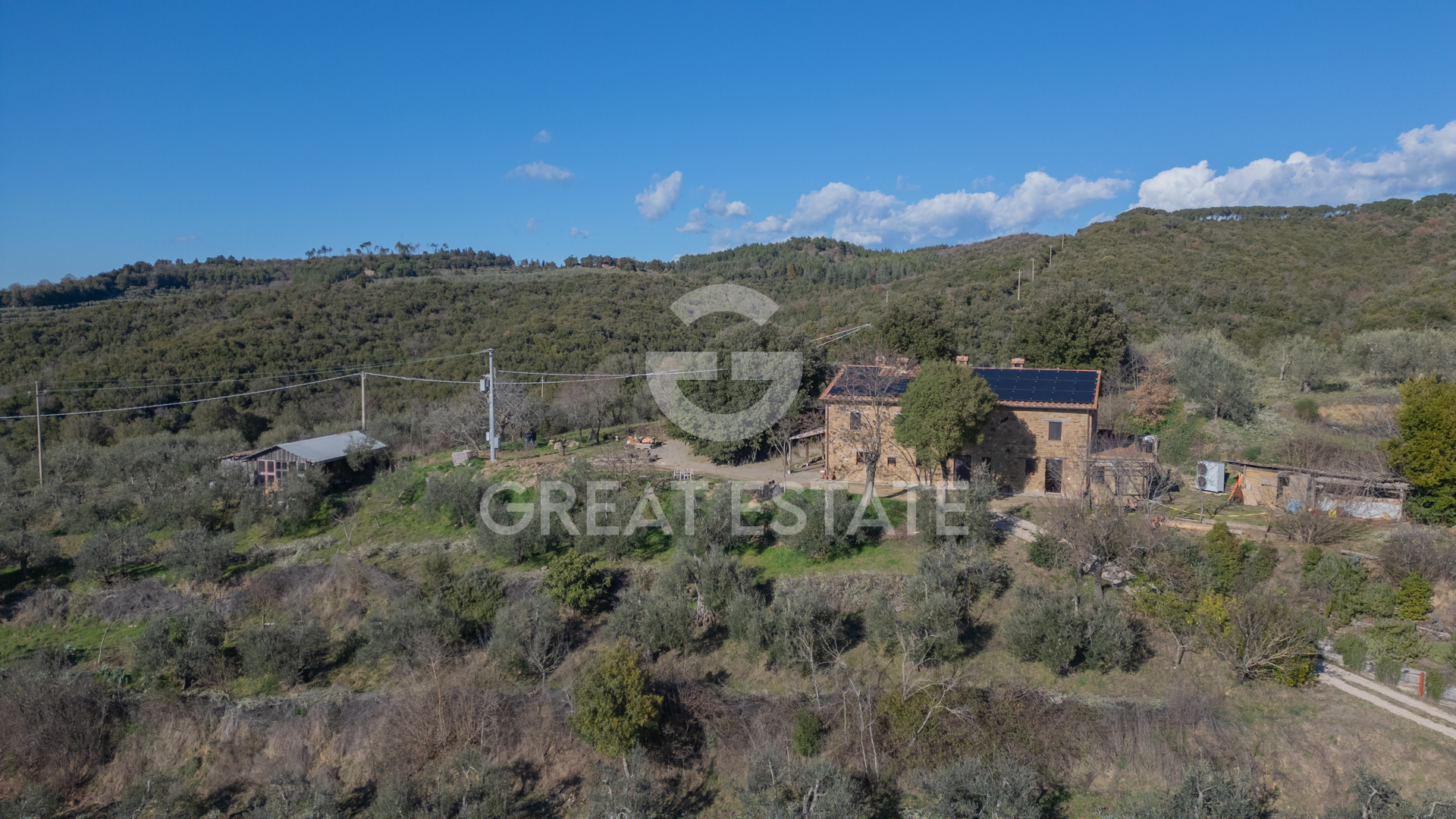 Peace and privacy immediately define the setting, nestled in the Umbrian hills of Citta della Pieve, in a private and sunlit context, at the last inhabited stretch of the road. You are 3-5 km from the historic center, with essential services easily reached in a short time. Montepulciano is about 15 km away, Lake Trasimeno 25 km, Perugia 45 km, Siena 70 km. The landscape opens onto rolling hills, olive groves and woodlands, with wide, uninterrupted panoramic views, ideal at sunset. Access is via a country white road of approximately 2-5 km, enhancing the sense of exclusivity. The hillside position ensures fresh air, pervasive tranquility and a perfect balance between connectivity and seclusion, in one of Umbria's most sought-after areas.