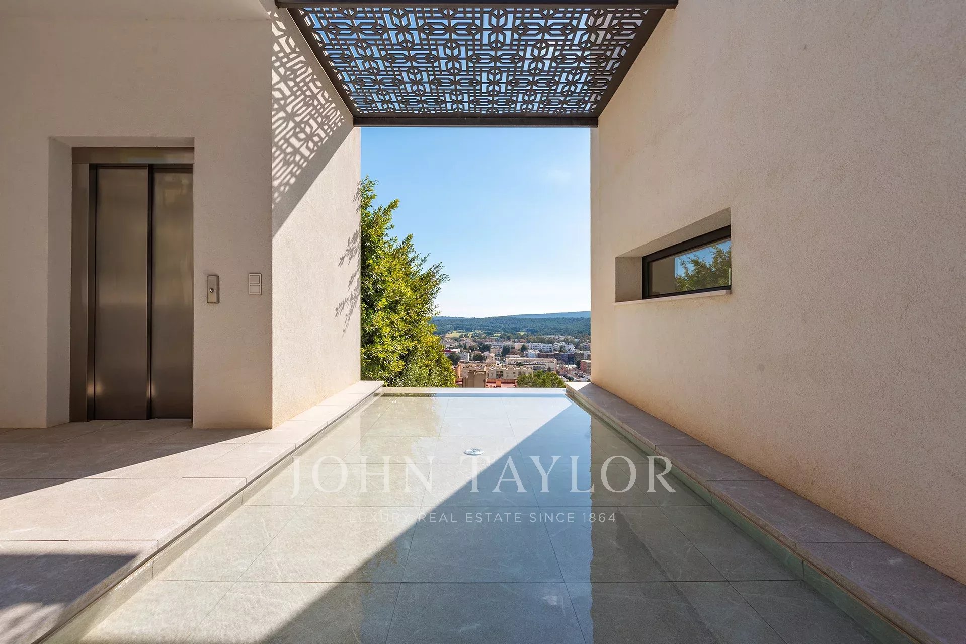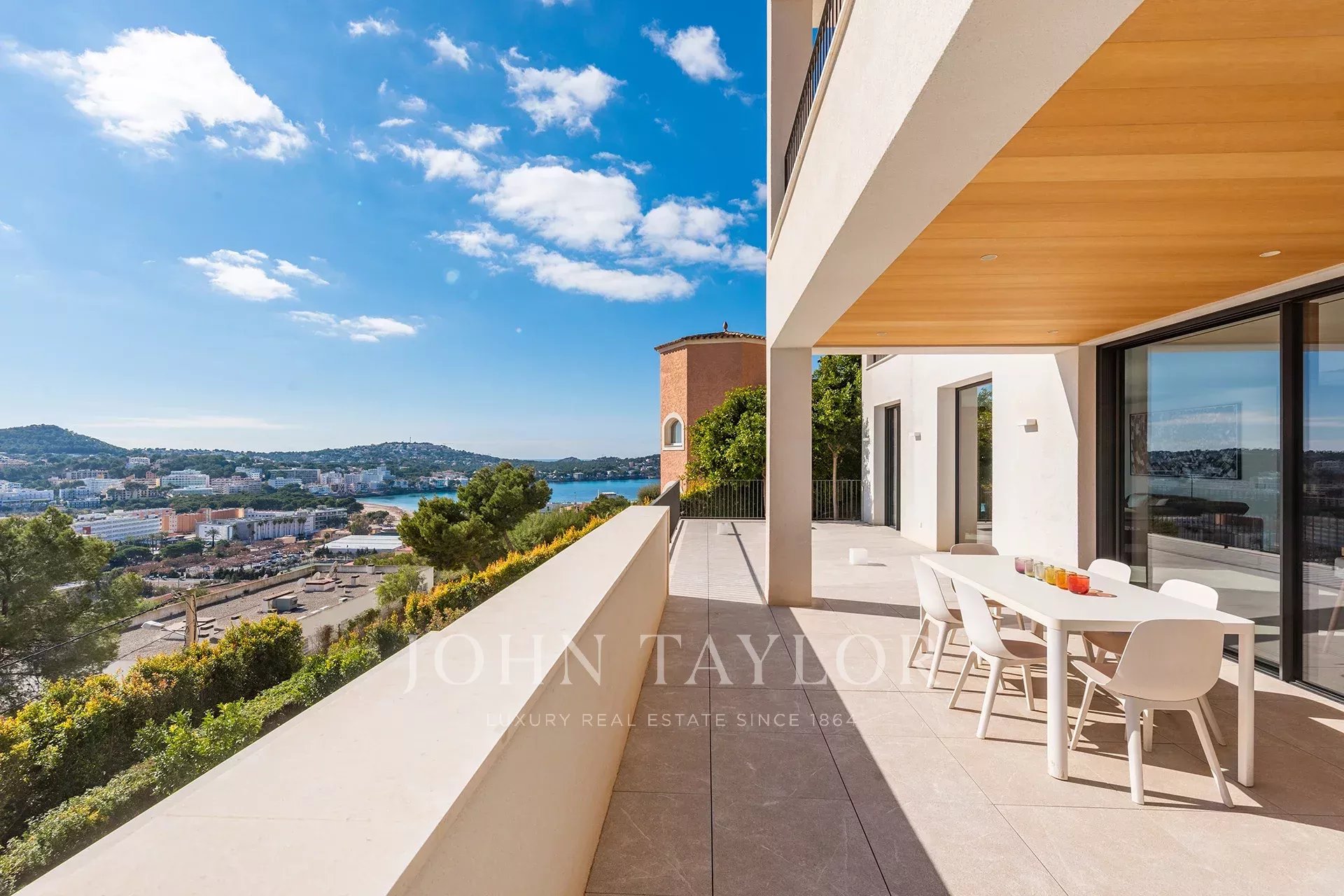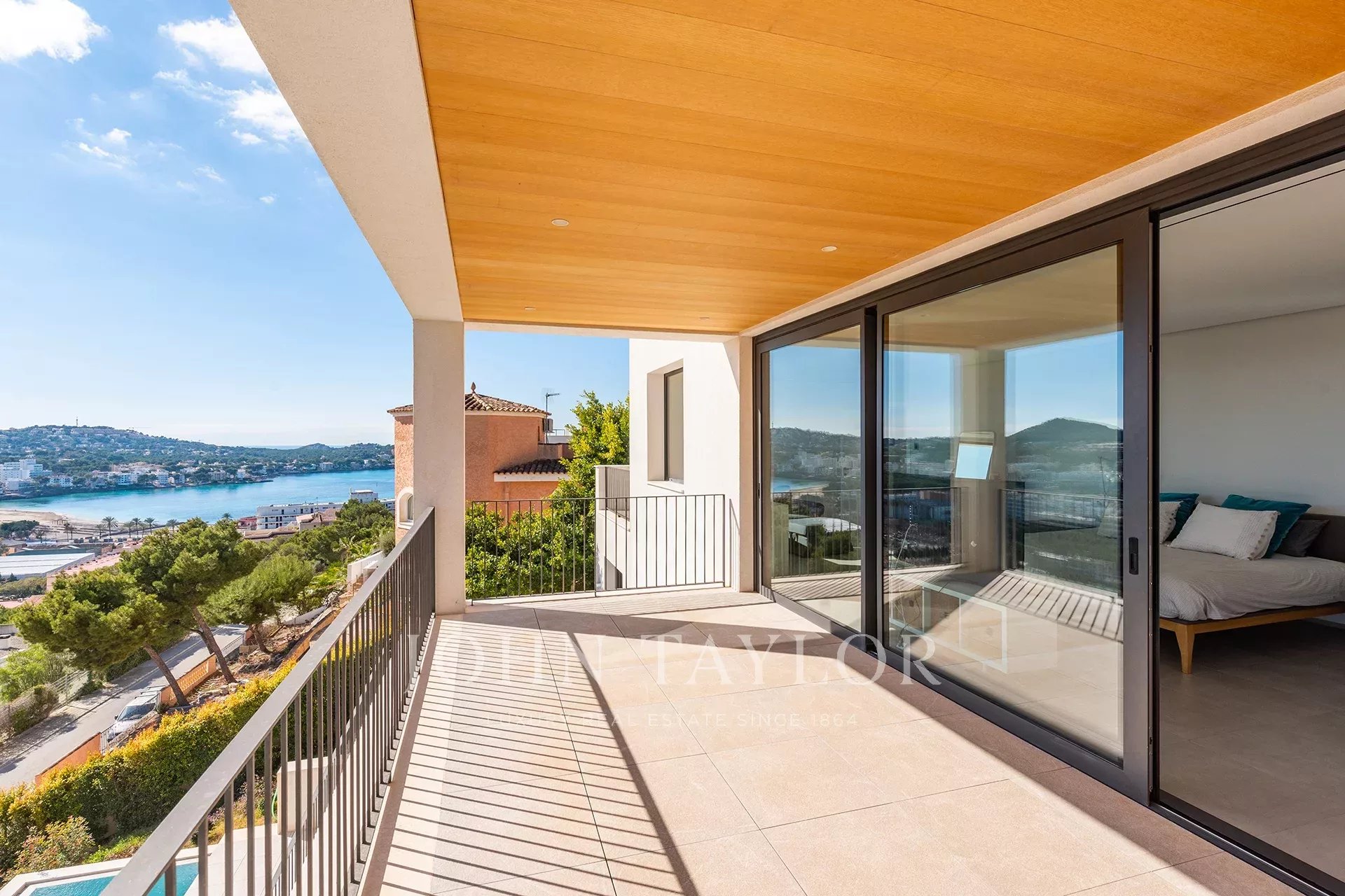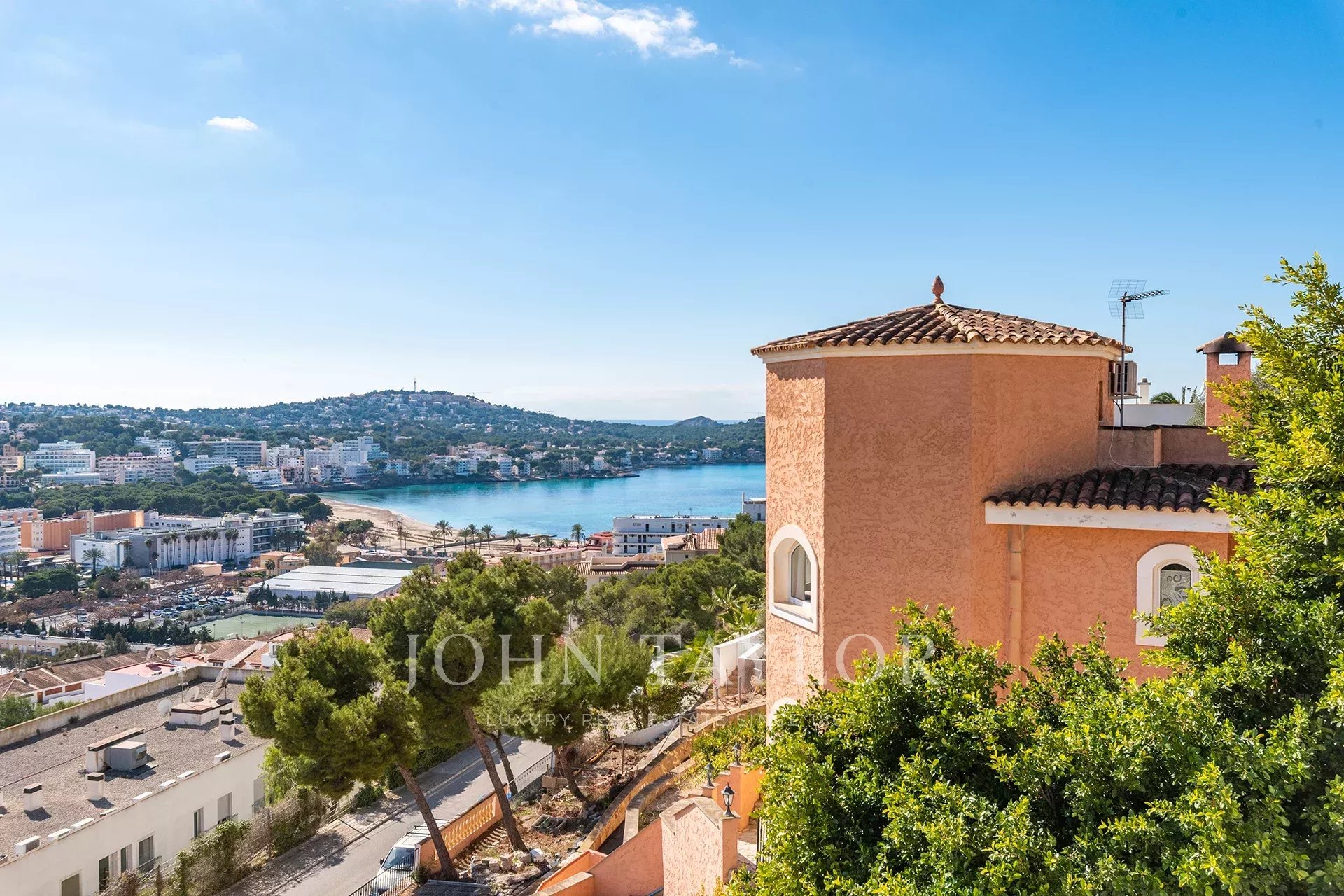 Modern villa with sea views in Costa de la Calma. This wonderful house built in 2019 is located in an elevated position with beautiful views of the Bay of Santa Ponsa and stands out for its brightness. Thanks to its orientation to the south, it enjoys the sun almost all day and its large windows that open onto the terrace area and also to its interior patios always provide good ventilation. A sophisticated solar energy system guarantees a very low consumption of electricity.We enter the property through a large garage for 2 cars at the same level as the street. The elevator takes us to the entrance area with fountains and waterfalls. The ground floor houses the living room with fireplace, a multimedia room, the kitchen, a large dressing room, a bedroom, a bathroom and the laundry room. All the rooms are distributed around an interior patio. The upper floor offers a magnificent master bedroom and 2 more bedrooms, all with their own terrace.The pool area connects to the gym and sauna.Additionally the property has a guest house.It is a very functional and pleasant luxury villa within short distance of the beach and all the services that Santa Ponsa offers.