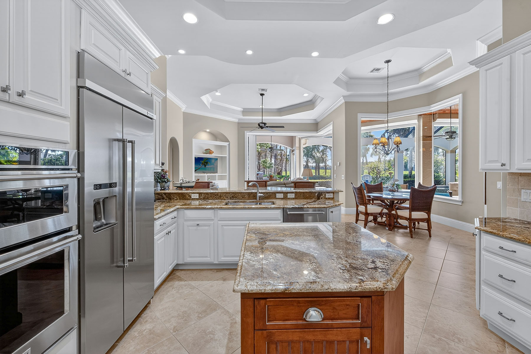 Enjoy sweeping views of the Rookery Golf Course from this light-filled residence in Mahogany Bend within the prestigious community of Fiddler's Creek. Designed to capture the beauty of its surroundings, large windows frame lush fairways and tropical landscaping while filling the home with natural light. Offering four bedrooms plus a den, four baths and a two-car attached garage, this spacious residence combines refined architectural details with a comfortable, open layout ideal for everyday living and entertaining. Inside, the bright and welcoming interiors feature tasteful wall colors, recessed lighting and elegant crown molding throughout. Tile flooring laid on the diagonal flows seamlessly through the main living areas, enhancing the home's open feel. The living room is sophisticated and inviting, highlighted by a coffered ceiling, fireplace, crown molding, and expansive views of the outdoor living areas and golf course beyond. The kitchen is thoughtfully designed for style and function, featuring white cabinetry, a tile backsplash, under-cabinet lighting and a convenient three-seat bar for casual dining. Premium KitchenAid stainless steel appliances include a gas cooktop with a hood, French door refrigerator, wall oven and microwave. Nearby, the family room offers a relaxed gathering space with crown molding, a tray ceiling, recessed lighting and a built-in entertainment center, all complemented by beautiful outdoor views. A private den with French double-door entry, a tray ceiling, recessed lighting and an arched window provides the ideal home office or quiet retreat. The expansive primary suite features a tray ceiling, recessed lighting, a comfortable seating area and two walk-in closets. The primary bath includes a double vanity, large soaking tub, walk-in shower and a private water closet. The guest suites are bright and inviting, featuring crown molding and abundant natural light. Two offer private en-suite baths, while the third is conveniently near a well-appointed full bath with a glass-enclosed shower, providing comfort and privacy for family and visitors. Outdoor living is a highlight with a large screened lanai offering panoramic golf course views and multiple seating and entertaining areas. The space is complete with a full outdoor kitchen featuring an island and tile backsplash, a ceiling fan and a heated pool and spa, creating an inviting setting for year-round enjoyment. Additional conveniences include a well-equipped laundry room with an LG washer and dryer, a utility sink and upper cabinetry for storage. Residents enjoy an award-winning gated community with resort-style amenities, including a pool, the Gator Grille for casual dining, Caxambas for fine dining, fitness center, spa services, tennis and an active pickleball program with 10 courts, along with a full calendar of social events. Optional memberships offer access to the championship golf course, new golf clubhouse, marina and beach club.