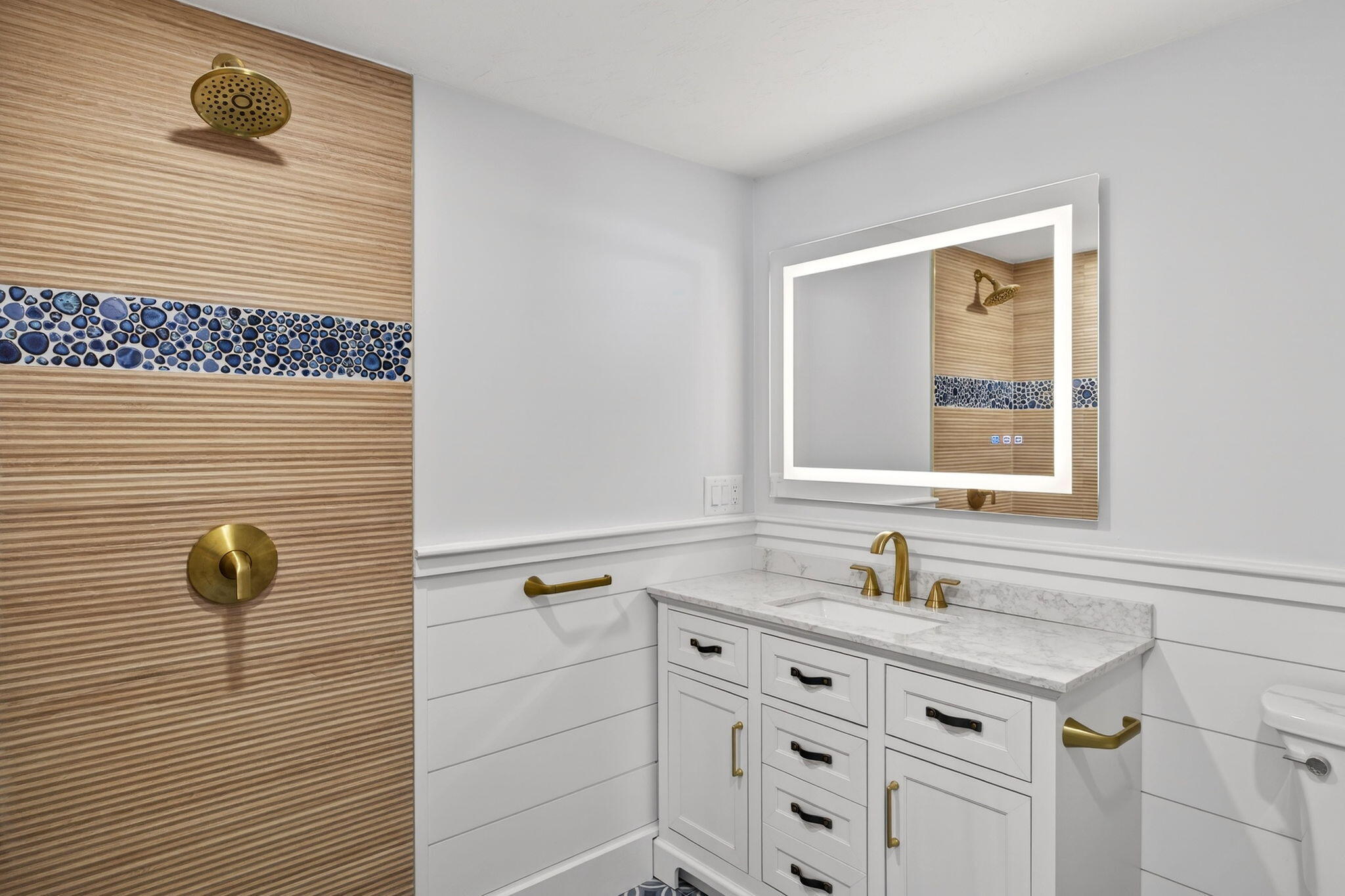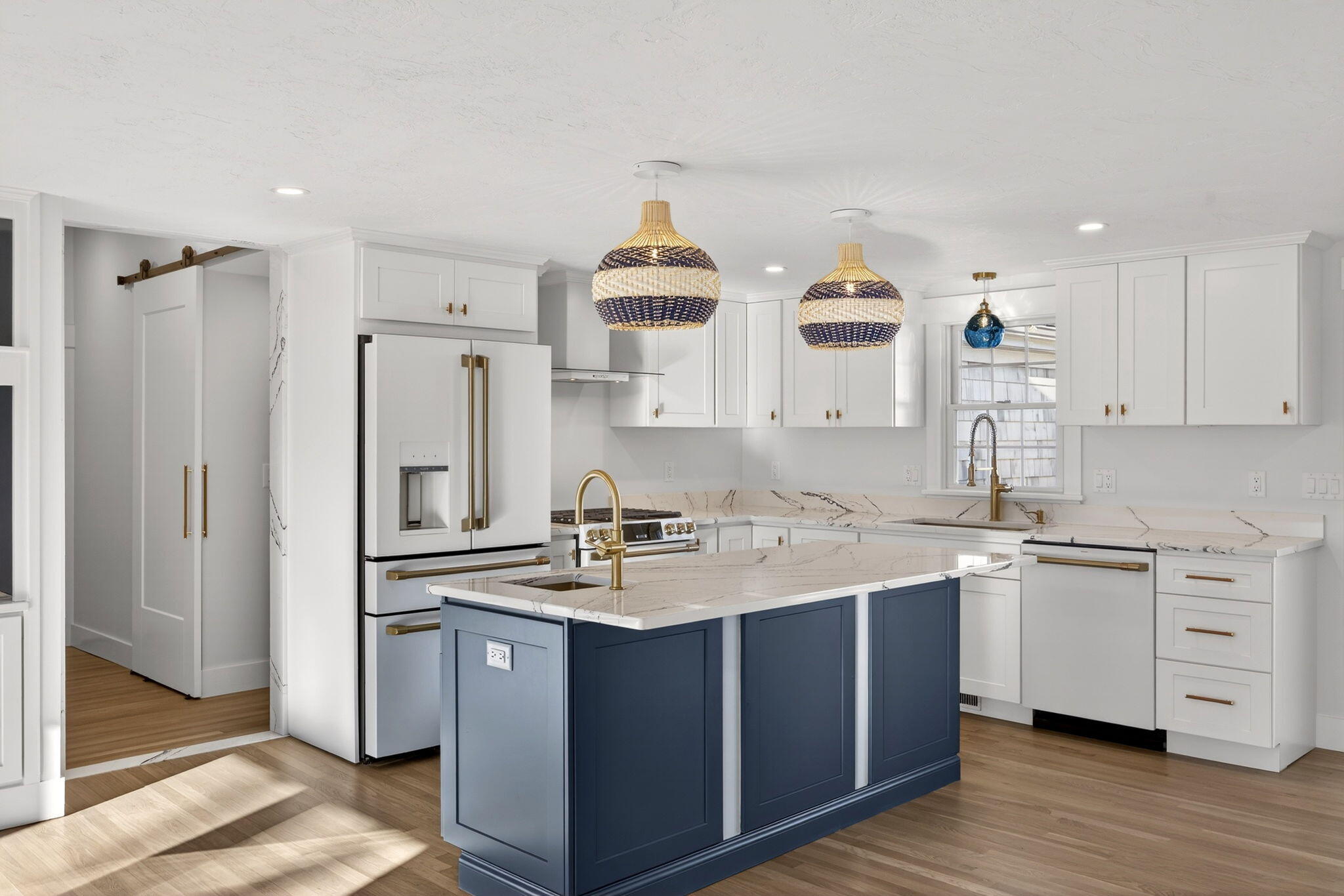 A Magazine-Worthy Transformation sets the tone for this incredible Ranch style home. Tucked within Blue Water Shores, this modern single-level retreat offers the rare privilege of neighborhood access to deep-water boating on Eel Pond. Inside, 3 bedrooms and 2 bathrooms are complemented by thoughtfully refreshed systems, including 2-zone FHA by gas heating and cooling, while elevated finishes, bespoke built-in cabinetry, nickel-gap paneling, custom lighting, and crisp curb appeal create a cohesive sense of style throughout. Light-filled rooms open to curated outdoor spaces, including a fenced yard, an outdoor rinsing station, and a firepit patio ideal for gathering with friends or savoring quiet evenings after a day on the water. An attached one-car garage with direct entry into a mudroom and laundry room addition ensures year-round comfort and convenience. With world-class beaches, dining, shopping, golf, and a nearby marina just moments away, this beloved waterfront neighborhood delivers the best of Cape Cod living. This is a home that truly delights all the senses.