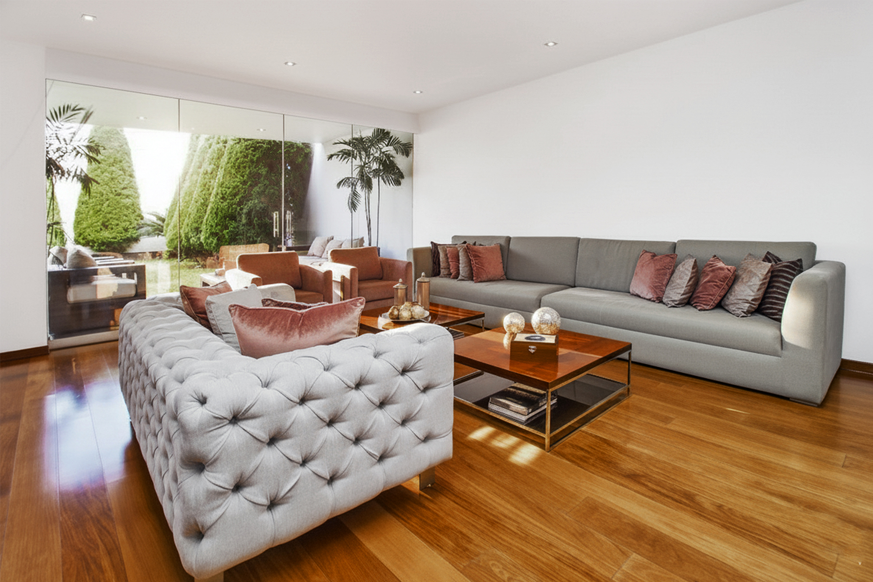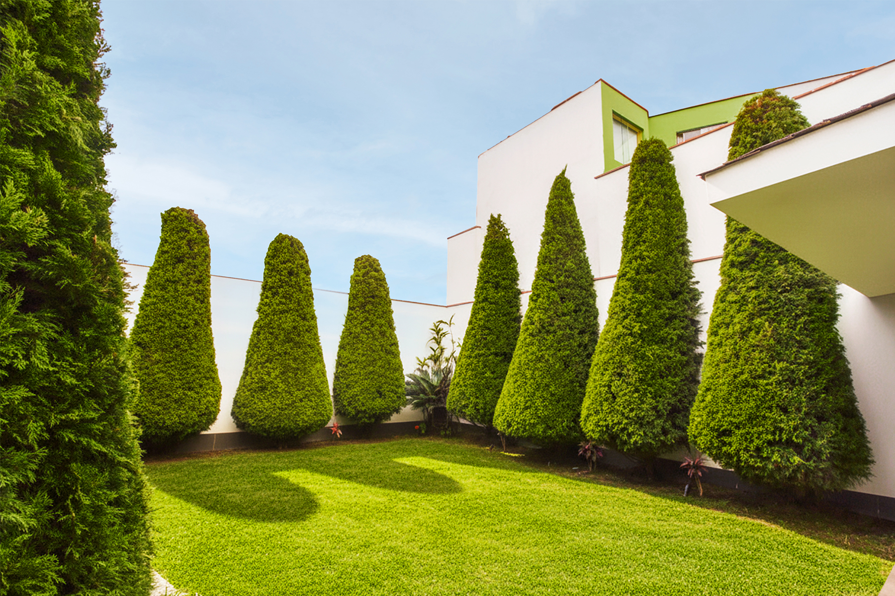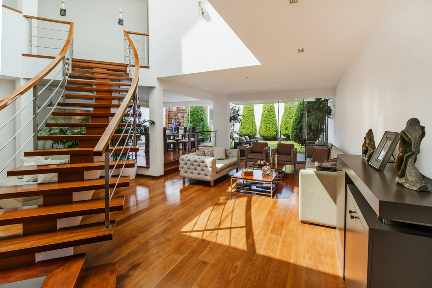 On the first floor, you are greeted by a spacious living-dining room with double height, creating a sense of openness and brightness. The premium kitchen, fully equipped with a breakfast area, is a dream for any aspiring chef. Additionally, it features an elegant guest bathroom and access to the expansive backyard. The backyard has been designed to provide multiple entertainment spaces, with a covered barbecue area that includes its own bathroom and a cozy living room, all surrounded by lush pine trees that bring freshness and tranquility to the environment.
