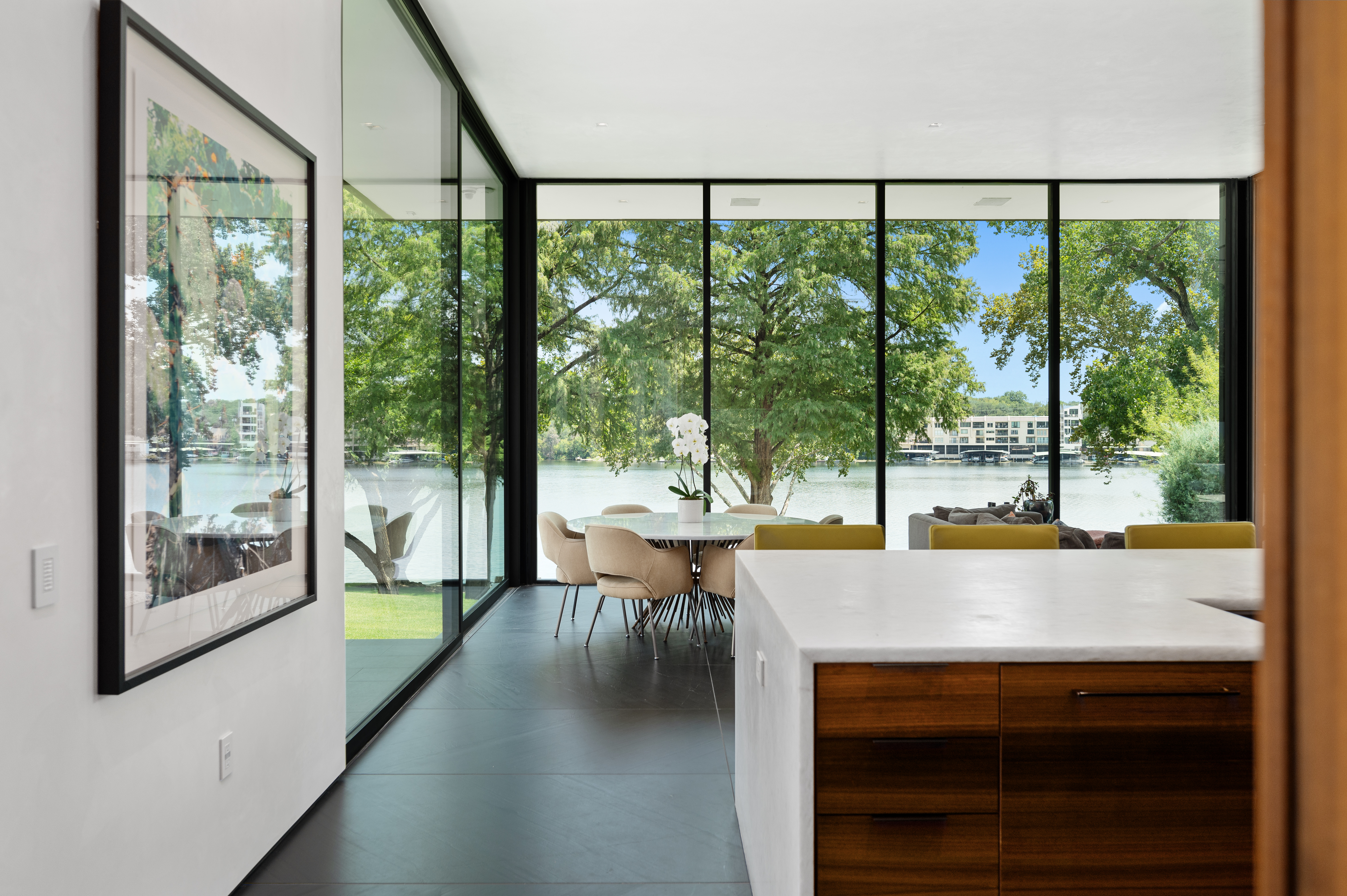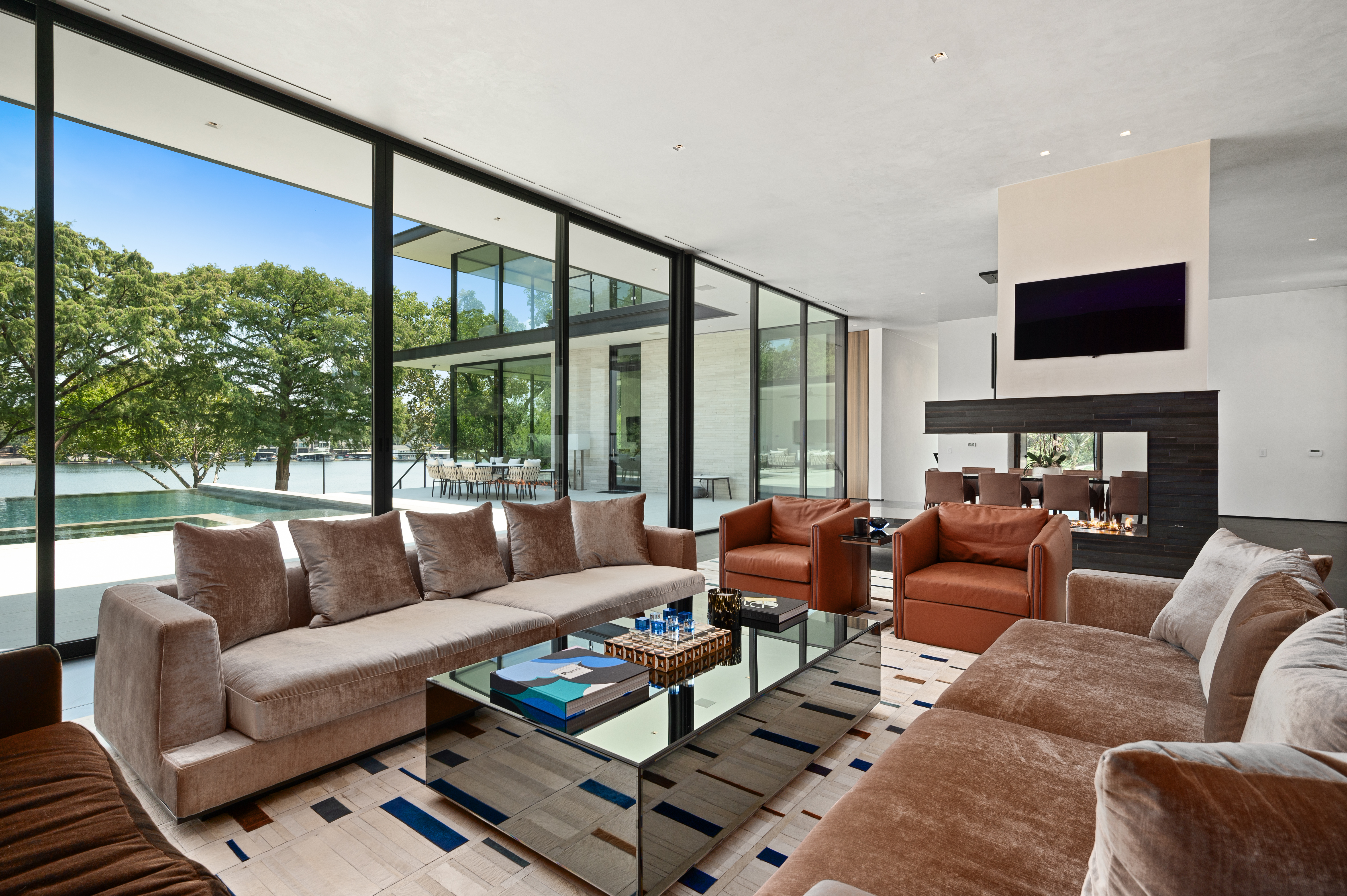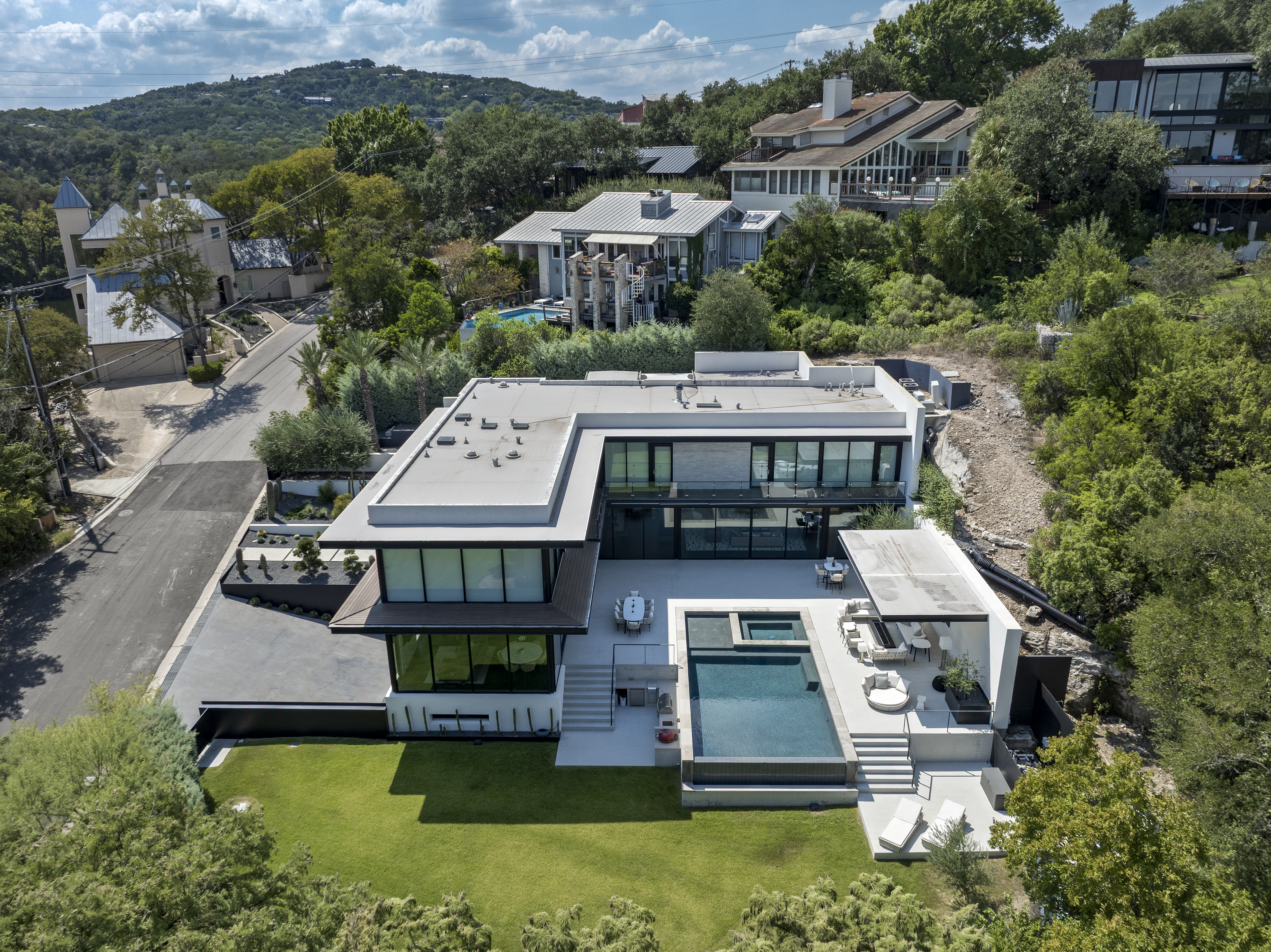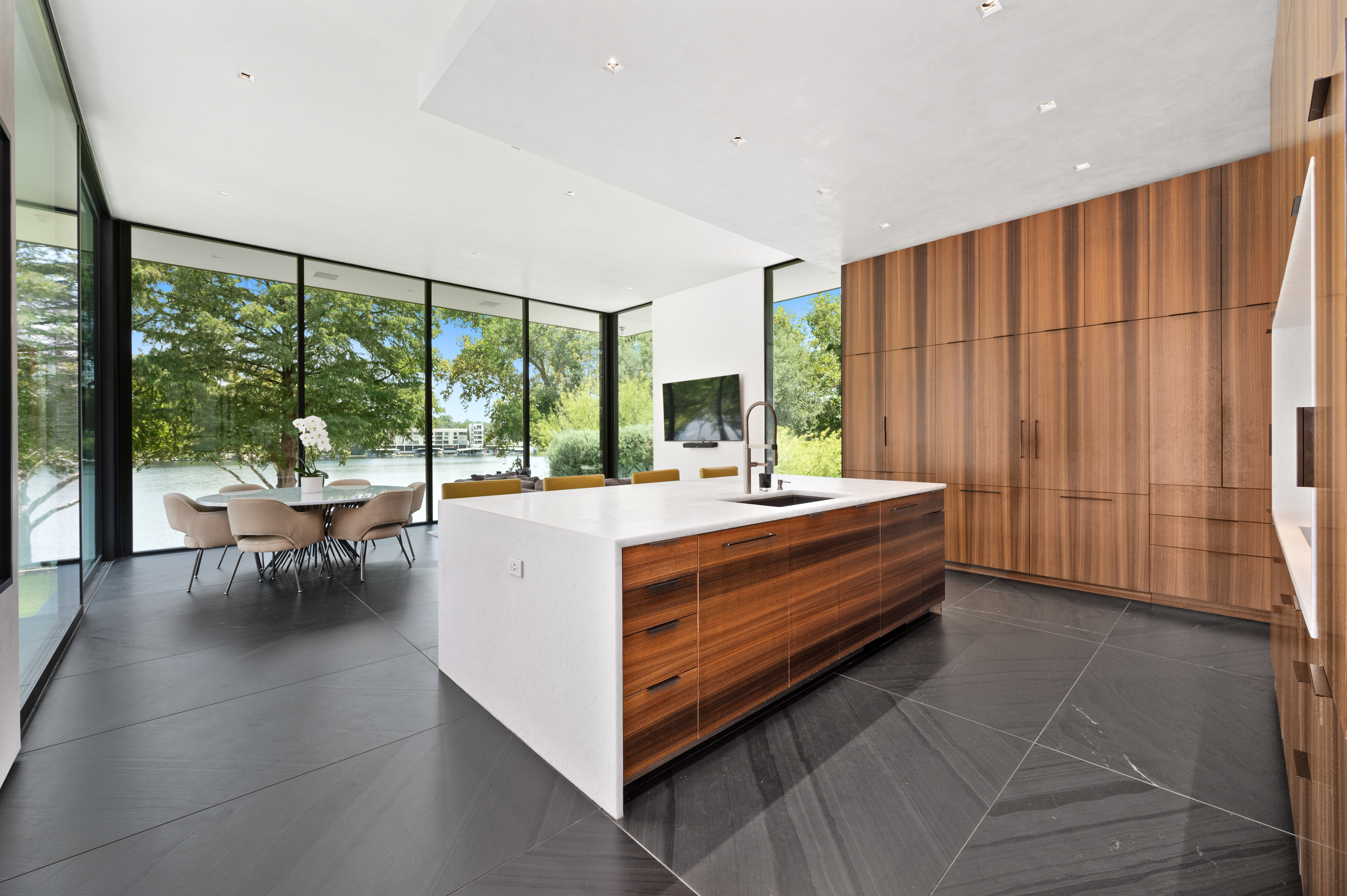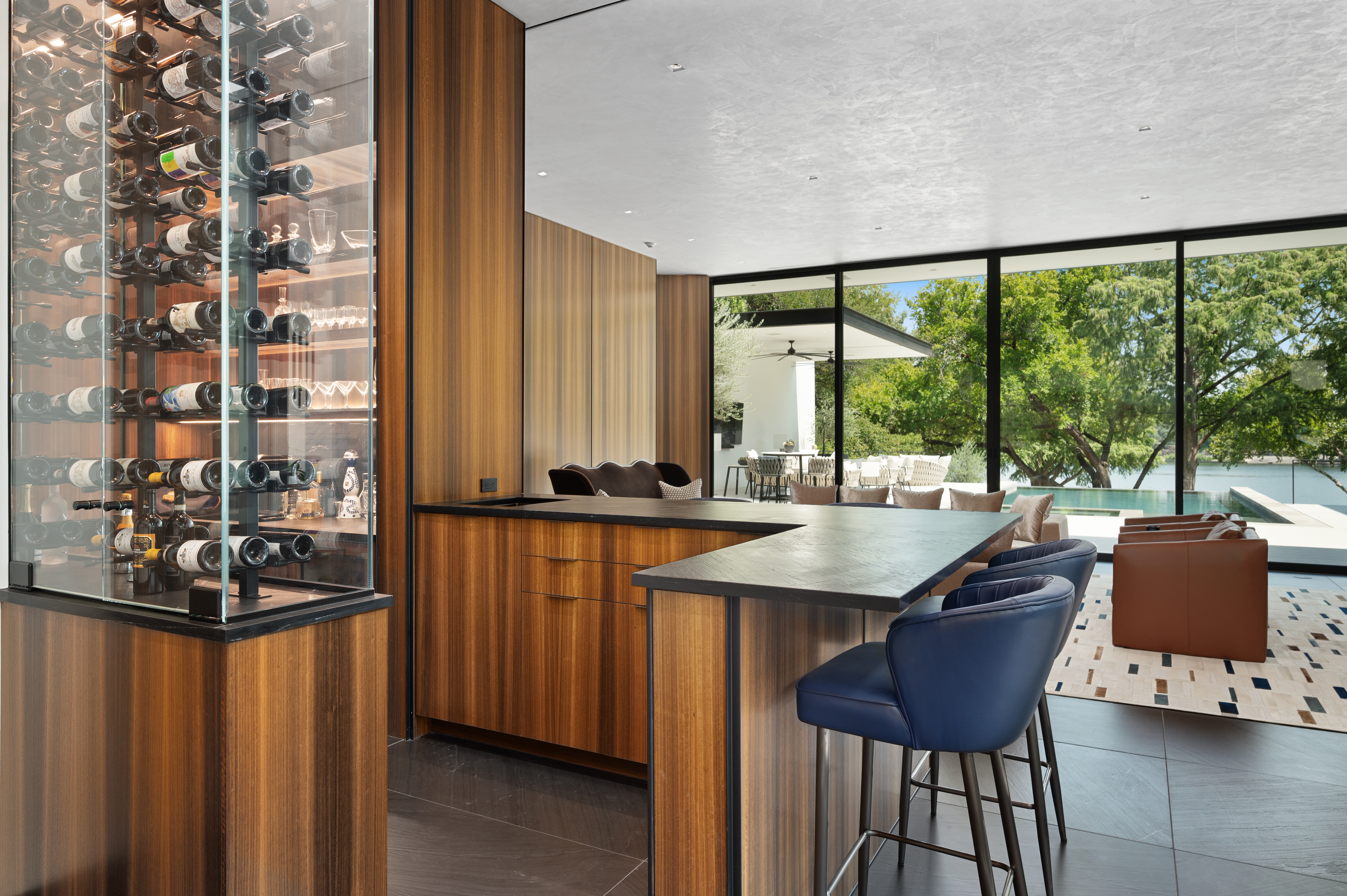 Tucked at the end of a quiet cul-de-sac on the coveted shores of Lake Austin, this estate is a rare convergence of architectural brilliance, absolute privacy, and some of the most commanding waterfront views the lake has to offer.Designed by the celebrated Matt Garcia Architecture and completed in 2019, this ±6,550 square foot modern masterpiece delivers a clean, razor-edged aesthetic that feels both effortlessly cool and deeply considered. Floor-to-ceiling glass dissolves the boundary between interior and exterior at every turn, framing 250 feet of uninterrupted lake frontage like a living work of art. Outside, ±2,200 square feet of Lueder stone decking extends the living experience to the water's edge, where a private boat slip awaits.With five bedrooms and five and a half bath's, the home is as thoughtfully functional as it is stunning. Multiple media rooms and private offices make it equally suited for focused work or immersive entertainment, while a dedicated wine room and full bar elevate every gathering. The Palm Springs-inspired grounds — punctuated by towering Medjool palms, silver-leafed olive trees, and striking saguaros — lend a resort-caliber drama that is entirely unique to this property.Close-in yet completely secluded, Lakeshore Edge is the kind of address that rarely comes available — a private sanctuary where world-class design, natural beauty, and the soul of Lake Austin exist in perfect balance.