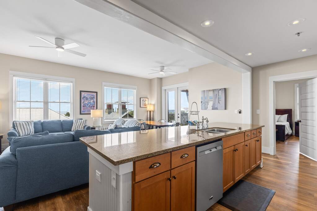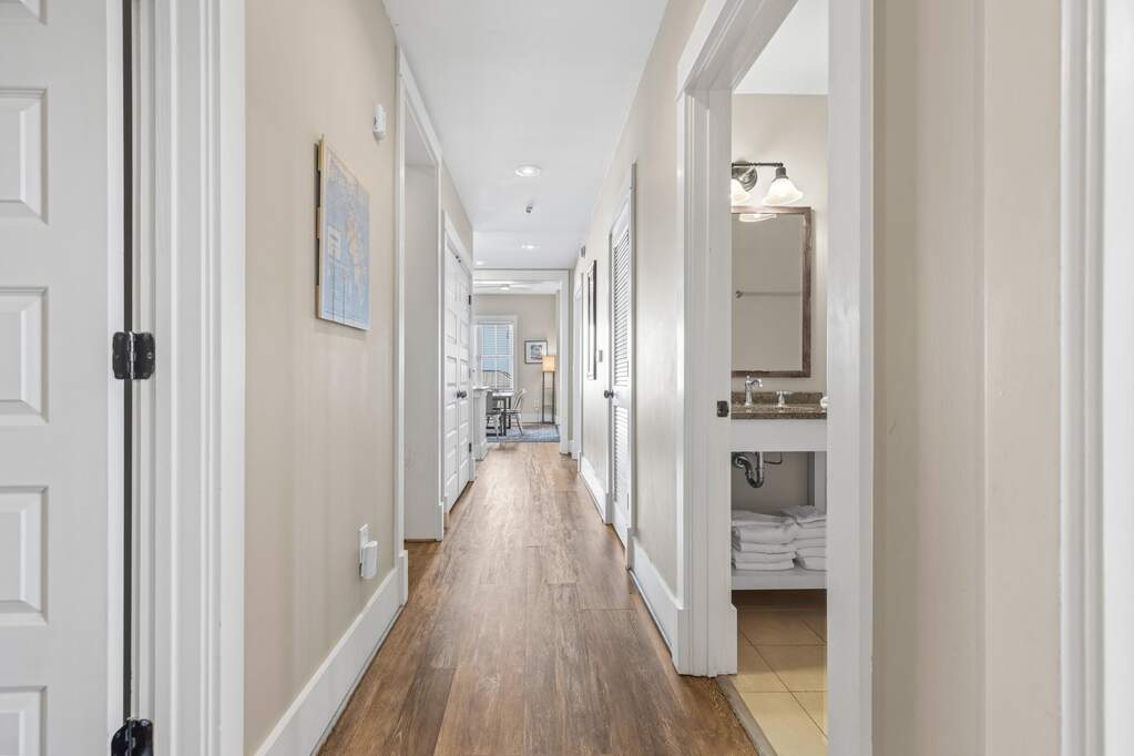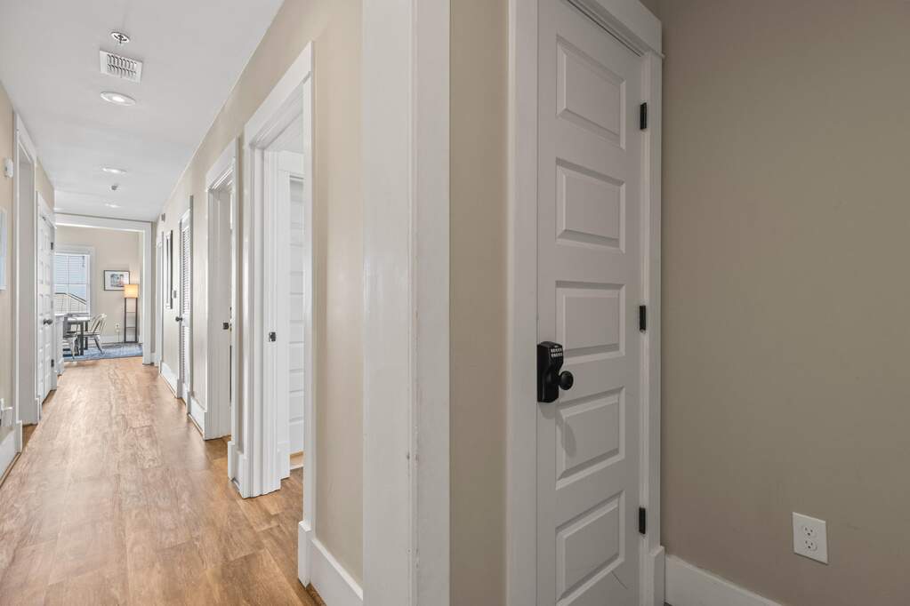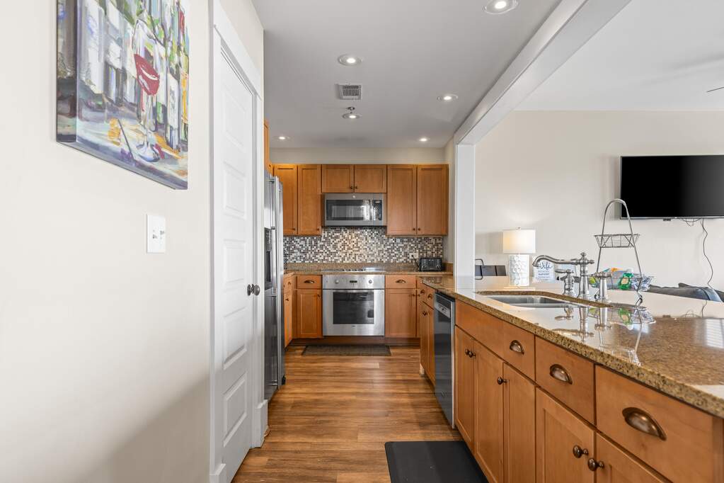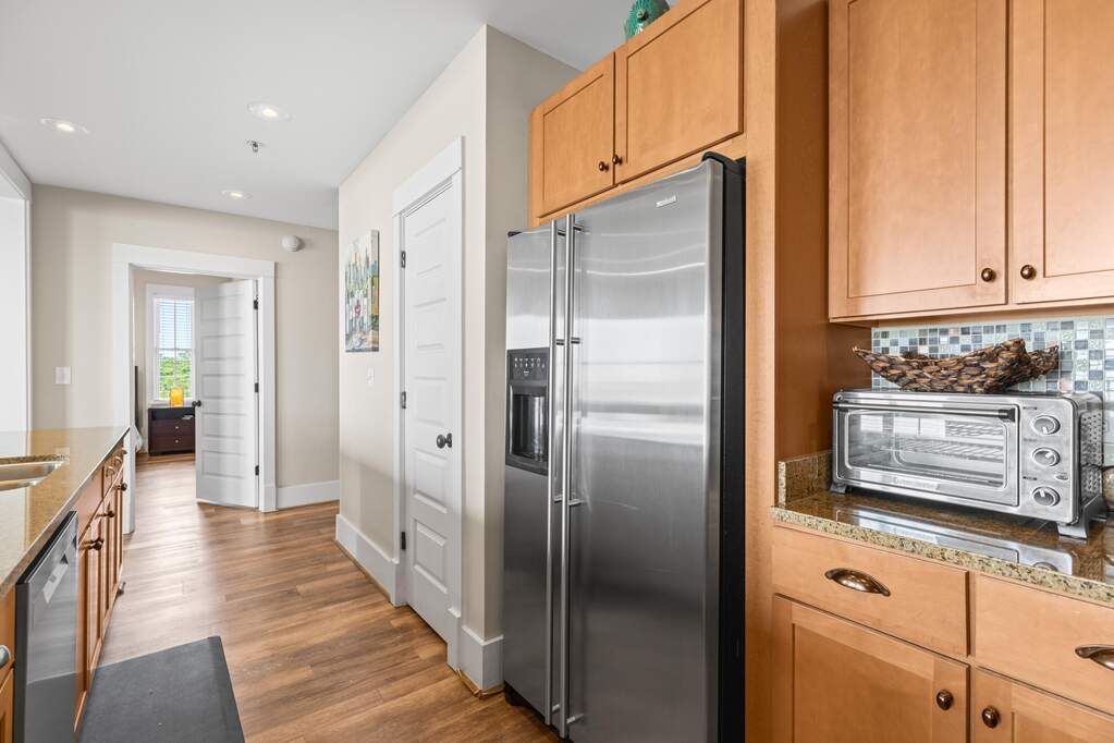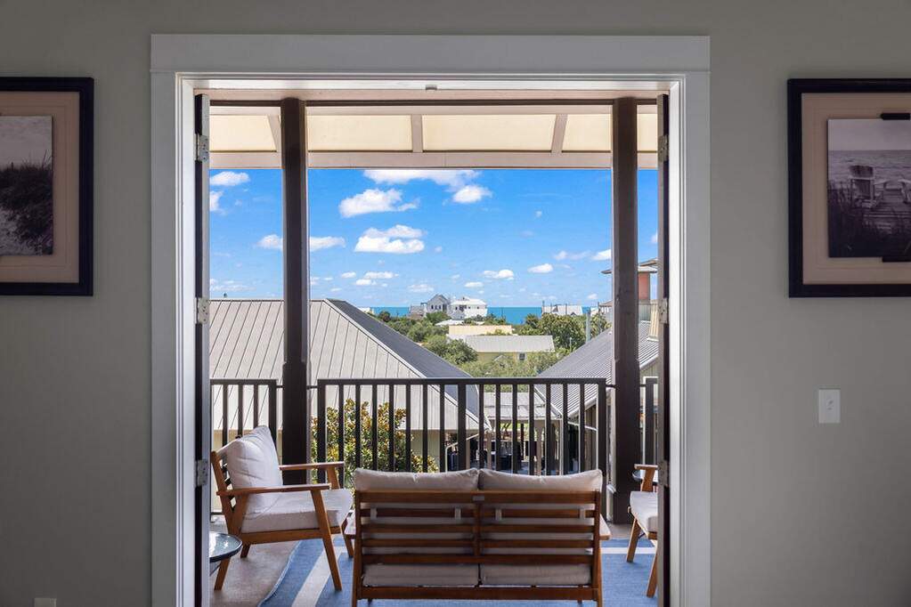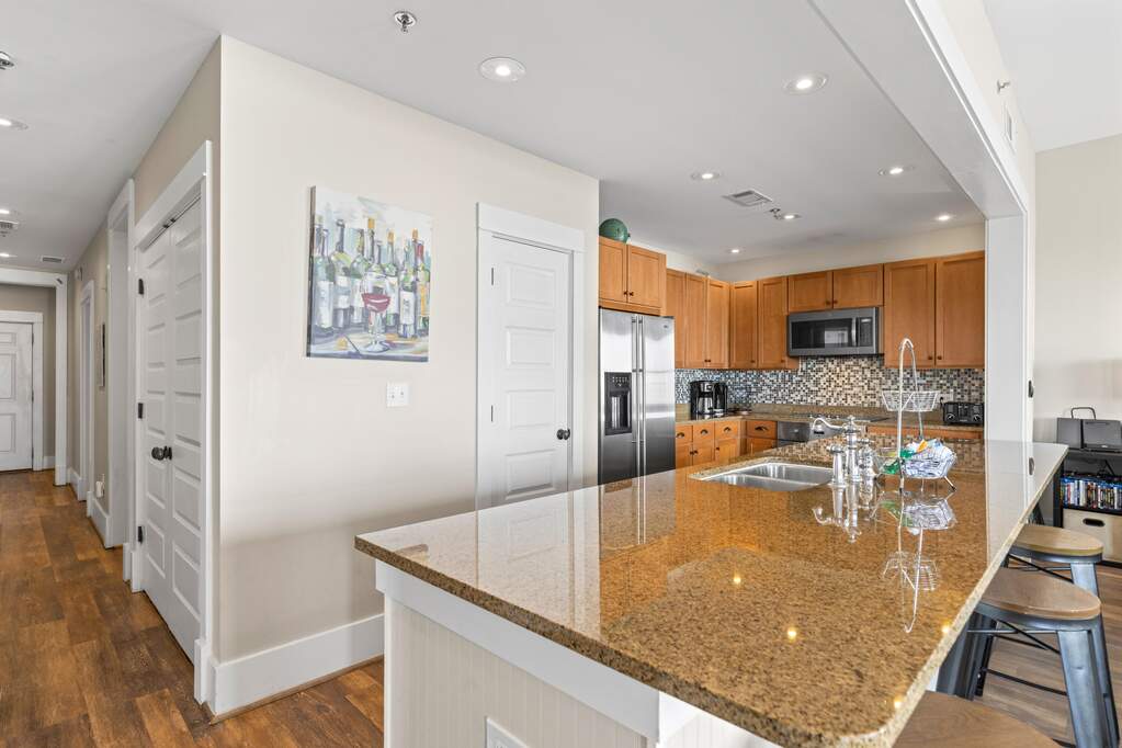 Rare top-floor corner residence in the highly sought-after Redfish Village M1 building, featuring the largest floor plan in the community and beautiful Gulf views. This spacious 3BR/3BA retreat offers high ceilings, newer LVP flooring, granite countertops, mosaic tile backsplash, and a large kitchen island with bar seating perfect for gathering. The dual-access balcony welcomes coastal breezes and captures views toward the Gulf and surrounding Blue Mountain Beach area. A thoughtfully designed quad bunk room maximizes guest capacity and rental flexibility. Offered fully furnished with strong rental potential. Owners enjoy private deeded beach access with seasonal shuttle, resort-style pool, fitness center, theater room, playground, lake boardwalk, & grilling areas.