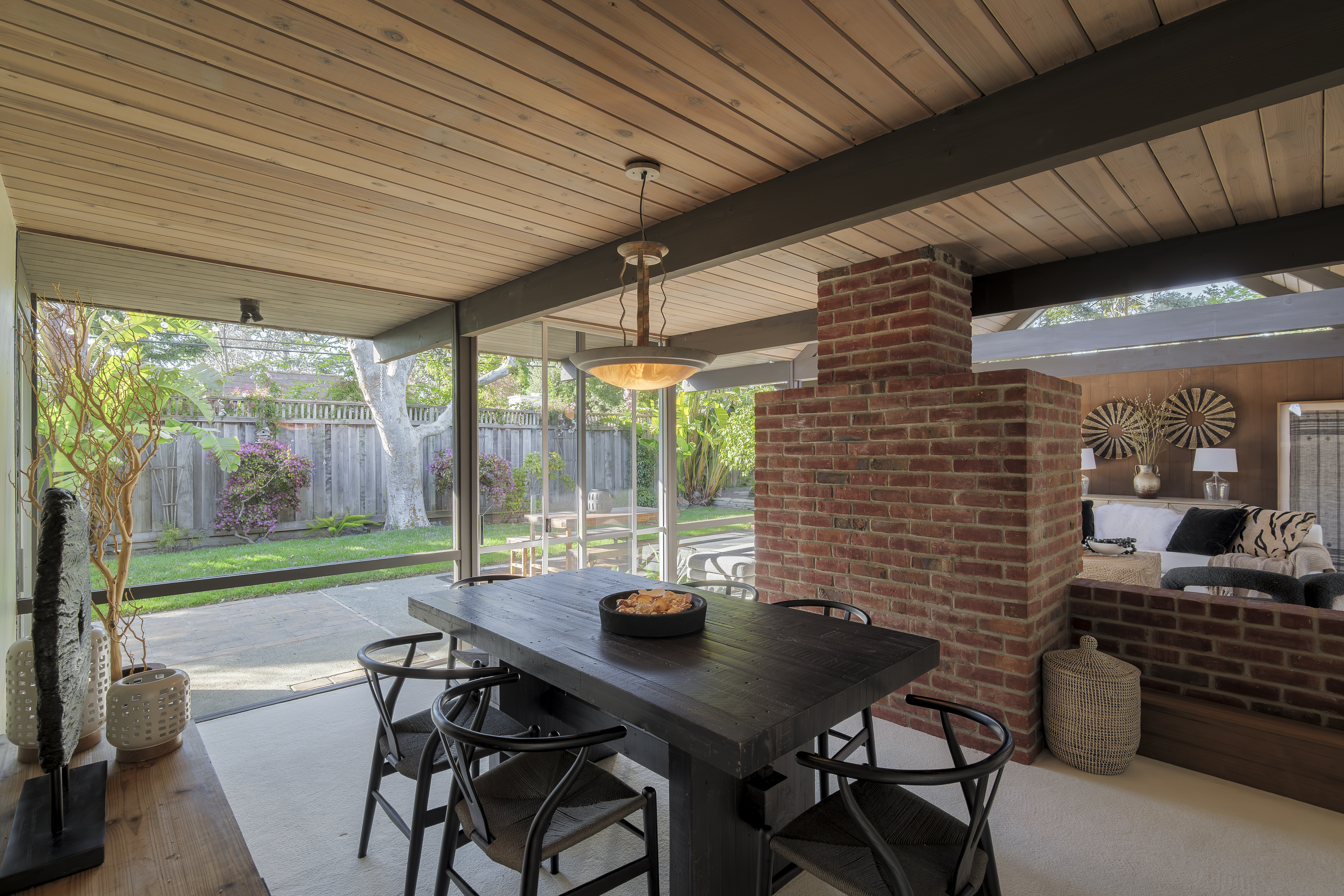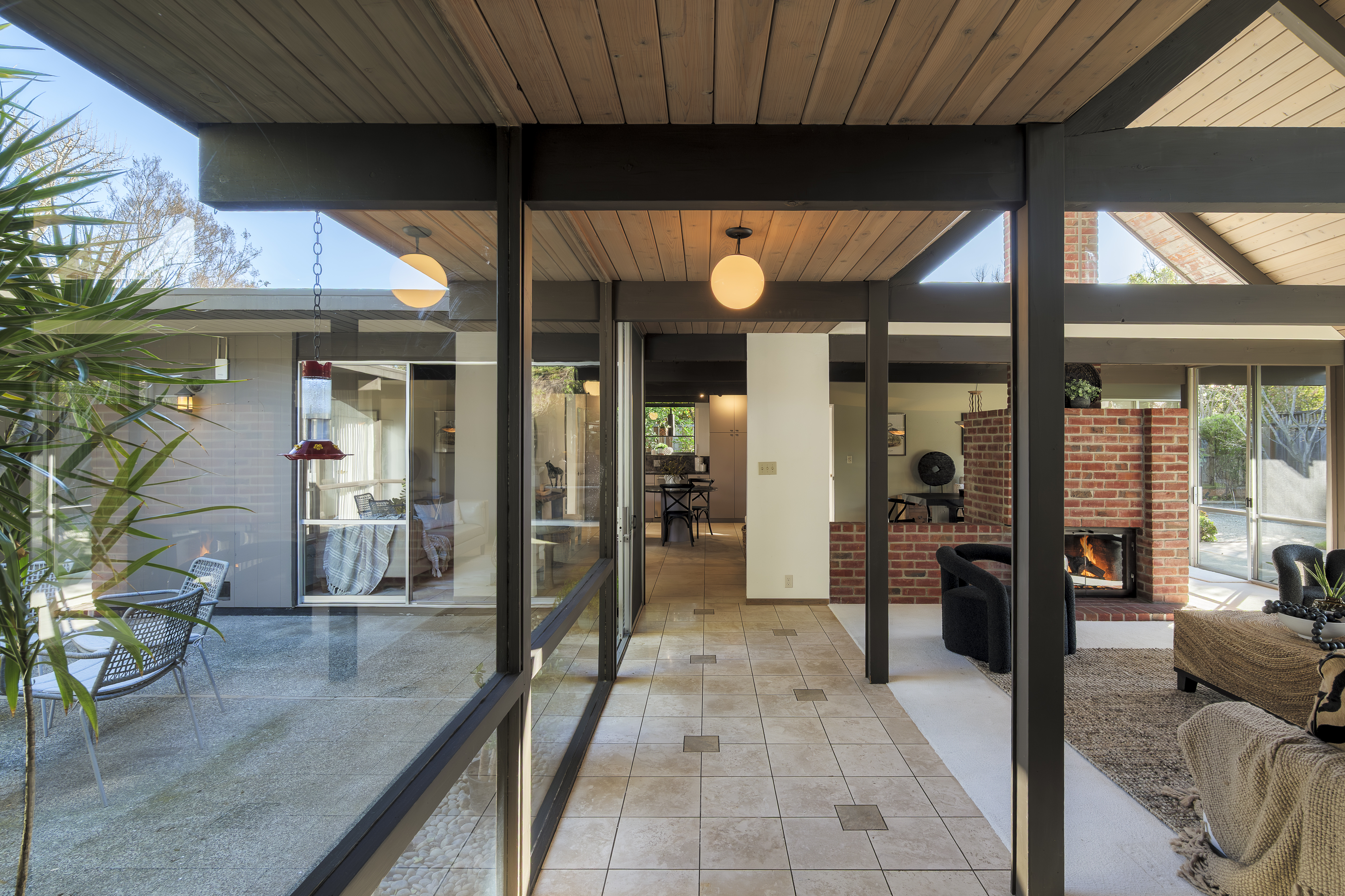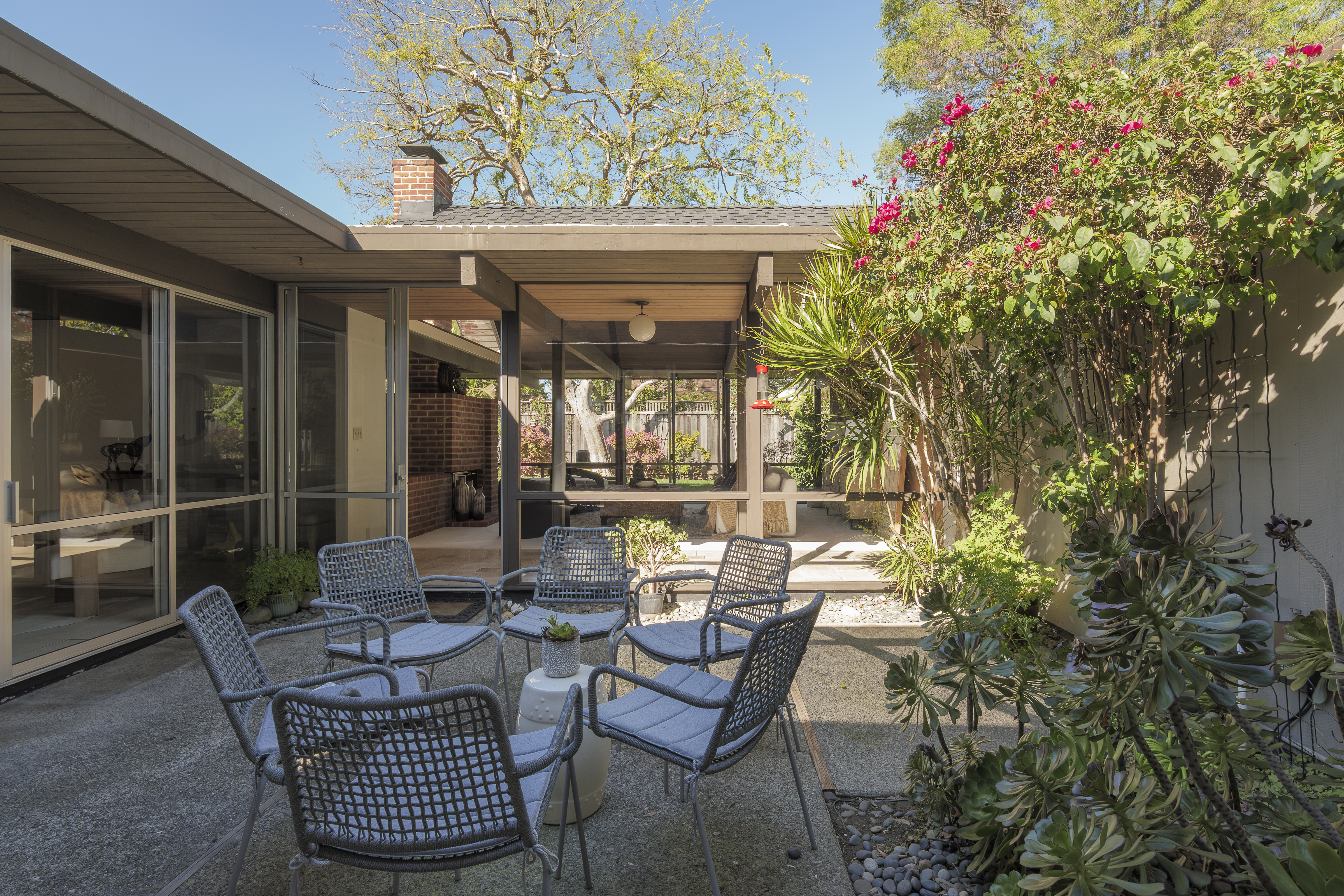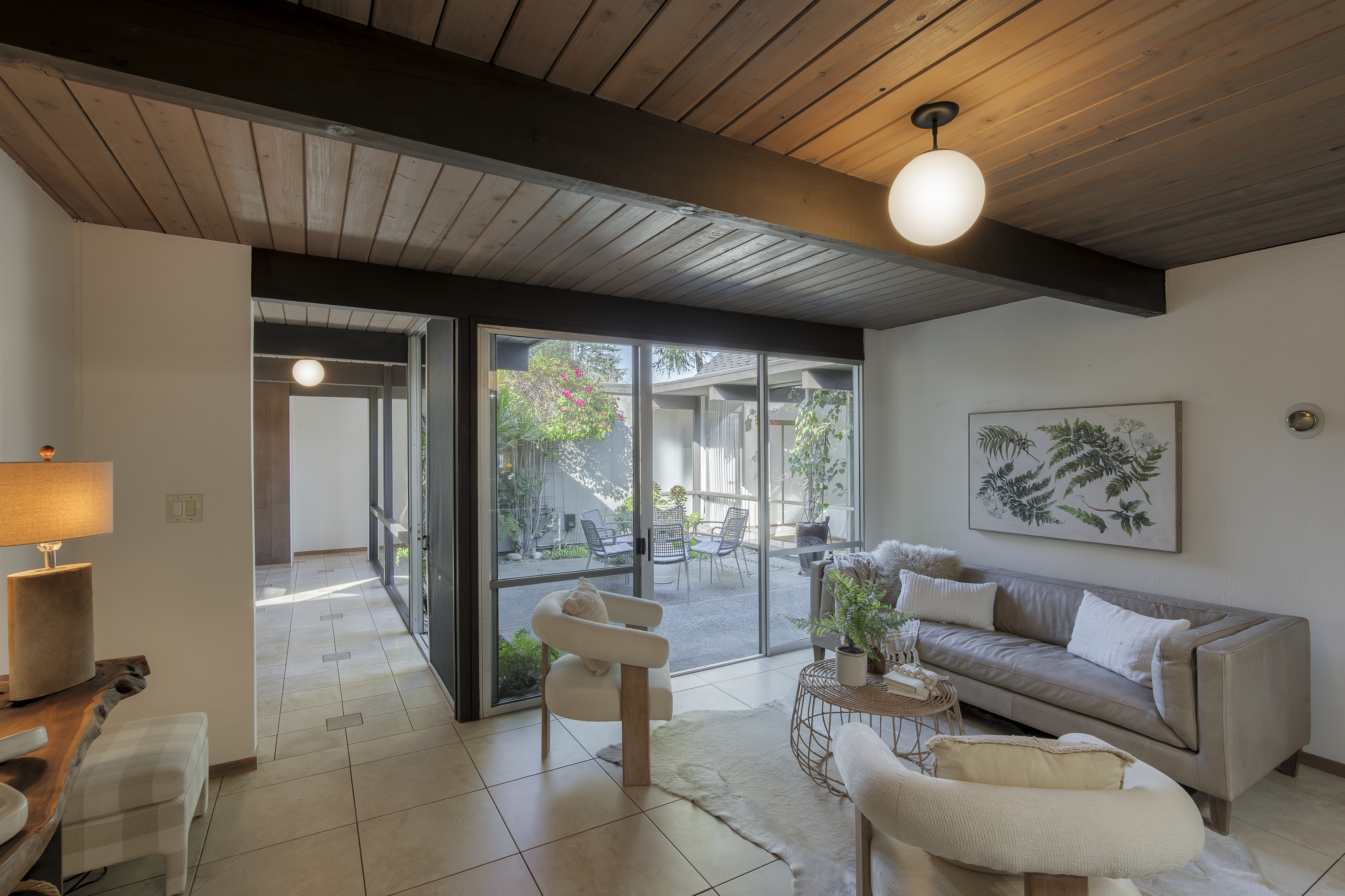 Located in the heart of Sunnyvale, this classic Eichler Atrium residence embodies the timeless appeal of mid-century modern design. The home features 4 bedrooms, 2 bathrooms, and a flexible bonus room that can easily serve as a home office or creative studio.The open-concept layout is filled with natural light and highlights the architectural elements Eichler homes are known for. Vaulted open-beam ceilings, expansive floor-to-ceiling glass, radiant heated floors, and a brick gas fireplace create a warm and inviting atmosphere throughout the main living areas.At the center of the home, the signature open-air atrium provides a striking architectural focal point and seamless indoor-outdoor connection, with sliding glass doors that invite light and fresh air into the surrounding living spaces.The kitchen and adjacent family area preserve the home’s original Eichler character while offering modern functionality. Features include granite countertops, a kitchen island with a built-in dining table, ideal for casual dining and entertaining, stainless steel appliances, and a spacious walk-in pantry.The primary suite offers a walk-in closet, sliding doors to the back garden and a private ensuite bath. Three additional bedrooms and a hall bath complete this fabulous floor plan.Outside, the property is surrounded by mature trees and lush landscaping. The backyard offers a tranquil setting with generous decking, ideal for outdoor dining, entertaining, or simply enjoying the peaceful surroundings.Conveniently located near Cumberland Elementary, highly regarded Homestead High School, Las Palmas Park, Sunnyvale Library, Caltrain, major commute routes, and many of Silicon Valley’s leading employers.